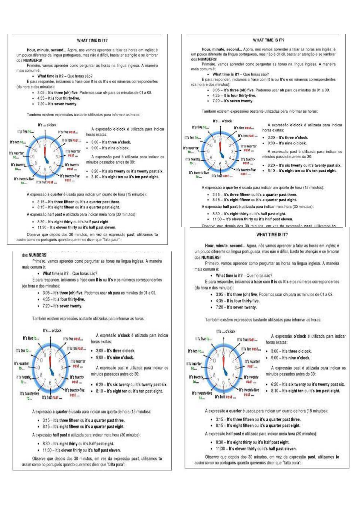 WHAT TIME IS IT? WHAT TIME IS IT? Hour, minute, second... Agora, nós vamos aprender a falar as horas em é Hour, minute, second... Agora, nós vamos aprender a falar as horas em é um pouco diferente da lingua portuguesa, mas não é basta ter atenção se lembrar um pouco diferente da lingua portuguesa, mas não é basta ter atenção e se lembrar dos NUMBERS! dos NUMBERS! vamos aprender como perguntar as horas na lingua inglesa. A maneira vamos aprender como perguntar as horas na lingua inglesa. A maneira mais comum é: mais comum é: What time is Que horas são? What time is Que horas são? E para responder, iniciamos a frase com It is ou It's e números correspondentes E para responder, a frase com It is ou It's e números correspondentes (da hora e dos minutos): (da hora e dos minutos): 3:05 It's three (oh) Podemos usar oh para os minutos de 01 a 09. 3:05 It's three (oh) Podemos usar oh para os minutos de 01 a 09. 4:35 It four thirty-five. 4:35 It four thirty-five. 7:20 It's seven twenty. 7:20 It's seven twenty. Também existem expressões bastante utilizadas para informar as horas: Também existem expressões bastante utilizadas para informar as horas: It's o'clock It's o'clock It's five A expressão o'clock utilizada para indicar A expressão o'clock utilizada para indicar It's five It's five horas exatas: It's five past... horas exatas: It's ten to... It's ten 3:00 It's three o'clock. It's ten It's ten past 3:00 It's three o'clock. 9:00 It's nine o'clock. 2 9:00 It's nine o'clock. It's quarter It's quarter 2 It's quarter It's quarter 10... 3 past A expressão past utilizada para indicar 10... 3 past A expressão past utilizada para indicar os It's twenty 8 4 minutos passados antes do 30: It's twenty It's twenty 8 4 minutos passados antes do 30: It's twenty 6 past 6:20 It's six twenty ou it's twenty past six. 6 6:20 It's six twenty ou it's twenty past six. It's twenty-five It's twenty-five 8:10 It's eight ten ou it's ten past eight. past It's twenty-five 8:10 It's eight ten ou it's ten past eight. It's half It's twenty-five past It's half A expressão a quarter usada para indicar um quarto de hora (15 minutos): A expressão a quarter usada para indicar um quarto de hora (15 minutos): 3:15 It's three fifteen ou it's a quarter past three. 3:15 It's three fifteen ou it's a quarter past three. 8:15 It's eight fifteen ou it's a quarter past eight. 8:15 It's eight fifteen ou a quarter past eight. A expressão half past é utilizada para indicar meia hora (30 minutos): A expressão half past é utilizada para indicar meia hora (30 minutos): 8:30 It's eight thirty ou it's half past eight. 11:30 It's eleven thirty ou it's half past eleven. 8:30 It's eight thirty ou it's half past eight. 11:30 It's eleven thirty ou it's half past eleven. Observe que depois dos 30 minutos, em vez da expressão utilizamos to Observe que depois dos 30 minutos, em vez da expressão past, utilizamos to WHAT TIME IS IT? assim como no quando queremos dizer que "falta Hour, minute, second... Agora, nós vamos aprender a falar as horas em é um pouco diferente da lingua mas não é basta ter atenção e se lembrar dos NUMBERS! dos NUMBERS! vamos aprender como perguntar as horas na lingua inglesa. A maneira vamos aprender como perguntar as horas na lingua inglesa. A maneira mais comum é: mais comum é: What time is Que horas são? What time is Que horas são? E para responder, iniciamos a frase com It is ou It's e números correspondentes E para responder, iniciamos a frase com It is ou It's e números correspondentes (da hora e dos minutos): (da hora e dos minutos): 3:05 It's three (oh) Podemos usar oh para os minutos de 01 a 09. 3:05 It's three (oh) Podemos usar oh para os minutos de 01 a 09. 4:35 It four thirty-five. 4:35 It four thirty-five. 7:20 It's seven twenty. 7:20 It's seven twenty. Também existem expressões bastante utilizadas para informar as horas: Também existem expressões bastante utilizadas para informar as horas: It's o'clock It's o'clock It's five A expressão o'clock utilizada para indicar It's five It's five A expressão o'clock utilizada para indicar horas exatas: It's five horas exatas: It's ten to... It's ten 3:00 It's three o'clock. It's ten to... It's ten 3:00 It's three o'clock. 9:00 - It's nine o'clock. 9:00 It's nine o'clock. 2 It's quarter 2 It's quarter It's quarter It's quarter past A expressão past utilizada para indicar past 10... 10... A expressão past utilizada para indicar os It's twenty 8 4 minutos passados antes do 30: It's twenty It's 8 4 minutos passados antes do 30: It's twenty 6 past 6 6:20 It's six twenty it's twenty past six. 6:20 It's six twenty it's twenty past six. It's twenty-five 8:10 It's eight ten ou it's ten past eight. It's twenty-five It's twenty-five It's twenty-five 8:10 It's eight ten ou it's ten past eight. past It's half past It's half A expressão a quarter usada para indicar um quarto de hora (15 minutos): A expressão a quarter usada para indicar um quarto de hora (15 minutos): 3:15 It's three fifteen ou it's a quarter past three. 3:15 It's three fifteen ou it's a quarter past 8:15 It's eight fifteen ou it's a quarter past eight. 8:15 It's eight fifteen ou it's a quarter past eight. A expressão half past é utilizada para indicar meia hora (30 minutos): A expressão half past é utilizada para indicar meia hora (30 minutos): 8:30 It's eight thirty ou it's half past eight. 8:30 - It's eight thirty ou it's half past eight. 11:30 It's eleven thirty ou it's half past eleven. 11:30 It's eleven thirty ou it's half past eleven. Observe que depois dos 30 minutos, em vez da expressão past, utilizamos to Observe que depois dos 30 minutos, em vez da expressão past, utilizamos to assim como no quando queremos dizer que assim como no portugués quando queremos dizer que