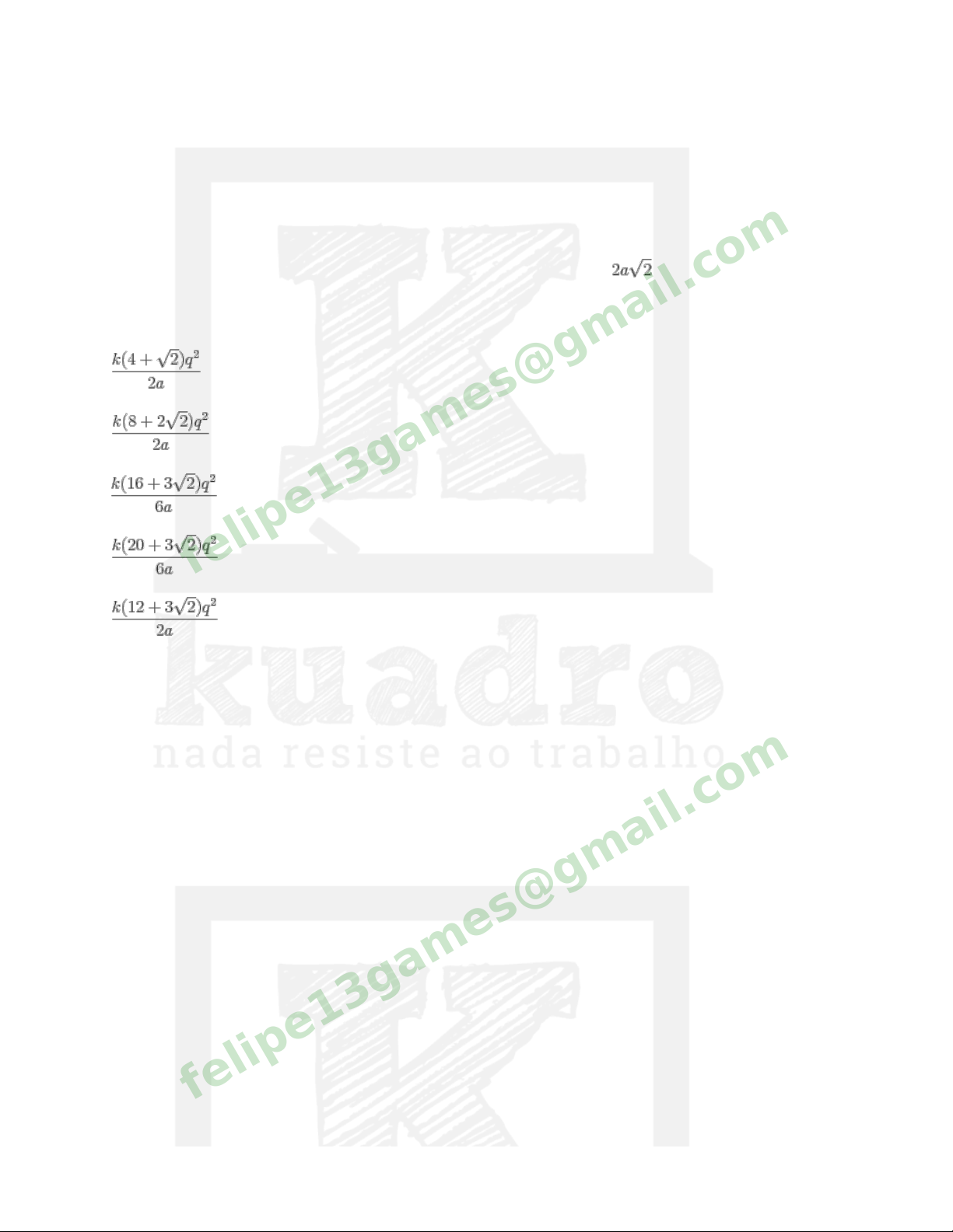 ITA18 - Revisão LFIS1B - Eletrostática II Questão 1 Assinale a alternativa que expressa o trabalho necessário para colocar cada uma de quatro cargas elétricas iguais, q, nos vértices de um retângulo de altura a e base , sendo k = 1/4π∈0, em que ∈0 é a permissividade elétrica do vácuo. a) b) c) d) e) f) Não sei. felipe13games@gmail.c om Questão 2 Considere as afirmações a seguir: I. Em equil íbrio eletrostático, uma superfície metálica é equipotencial. II. Um objeto eletrostaticamente carregado induz uma carga uniformemente distribuída numa superfície metálica próxima quando em equil íbrio eletrostático. III. Uma carga negativa desloca-se da região de maior para a de menor potencial elétrico. IV. É nulo o trabalho para se deslocar uma carga teste do infinito até o ponto médio entre duas cargas pontuais de mesmo módulo e sinais opostos. Destas afirmações, é (são) correta(s) somente a) I e II. b) I, II e III. c) I, II e IV. felipe13games@gmail.c om d) I e IV. e) III f) Não sei. felipe13games@gmail.c om Questão 3 A figura mostra duas cascas esféricas condutoras concêntricas no v´acuo, descarregadas, em que a e c são, respectivamente, seus raios internos, e b e d seus respectivos raios externos. A seguir, uma carga pontual negativa ´e fixada no centro das cascas. Estabelecido o equil íbrio eletrostático, a respeito do potencial nas superfícies externas das cascas e do sinal da carga na superfície de raio d, podemos afirmar, respectivamente, que a) V (b) > V (d) e a carga ´e positiva. b) V (b) V (d) e a carga ´e negativa. e) V (b)