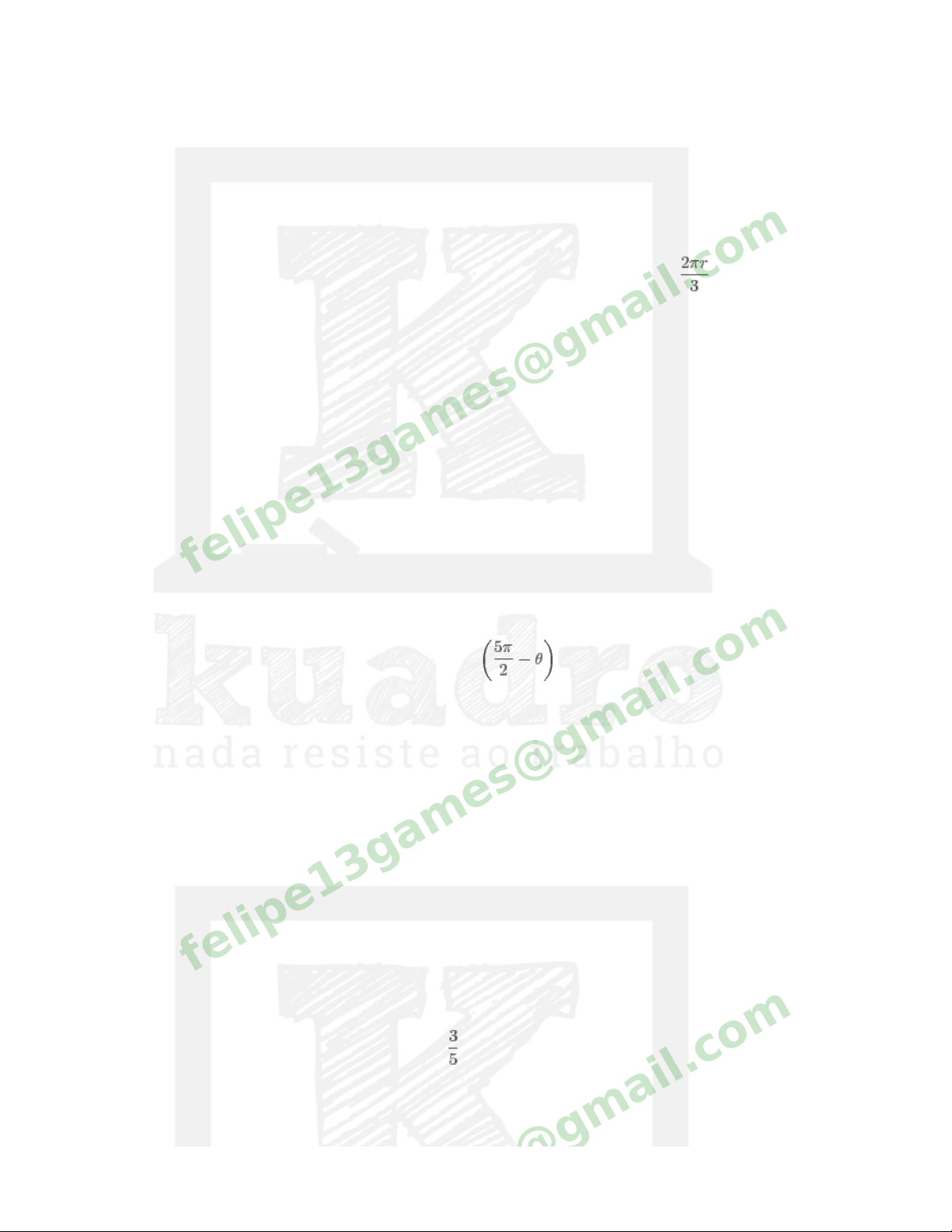 ITA18 - Matemática LM1D1 - Arcos e ângulos Questão 1 O ângulo aÔb determina na circunferência de raio r um arco de comprimento . O valor de aÔb é: a) 60° b) 120° c) 180° d) 240° e) 300° felipe13games@gmail.c om Questão 2 (PUC 70) Sendo θ um ângulo agudo positivo, então pertence ao a) 1º quadrante b) 2º quadrante c) 3º quadrante d) 4º quadrante e) nenhuma das anteriores f) não sei felipe13games@gmail.c om Questão 3 A soma de dois ângulos é 78o e um deles vale do complemento do outro. Quais são esses ângulos? felipe13games@gmail.c om a) 18o e 60o b) 6o e 72o c) 28o e 50o d) 36o e 42o e) 8o e 70o f) não sei felipe13games@gmail.c om Questão 4 Na figura abaixo, é a bissetriz de AÔC. Determine θ em função de â e a) b) c) d) e) f) não sei felipe13games@gmail.c om Questão 5 felipe13games@gmail.c om http://www.codecogs.com/eqnedit.php?latex=%5Coverline%7BOJ%7D http://www.codecogs.com/eqnedit.php?latex=%5Chat%7Bb%7D http://www.codecogs.com/eqnedit.php?latex=%5Ctheta&space;=&space;%5Cfrac%7B%5Chat%7Ba%7D+2%5Chat%7Bb%7D%7D%7B2%7D http://www.codecogs.com/eqnedit.php?latex=%5Ctheta&space;=&space;%5Cfrac%7B%5Chat%7Ba%7D+3%5Chat%7Bb%7D%7D%7B2%7D http://www.codecogs.com/eqnedit.php?latex=%5Ctheta&space;=&space;%5Cfrac%7B2%5Chat%7Ba%7D+%5Chat%7Bb%7D%7D%7B2%7D http://www.codecogs.com/eqnedit.php?latex=%5Ctheta&space;=&space;%5Cfrac%7B3%5Chat%7Ba%7D+%5Chat%7Bb%7D%7D%7B2%7D http://www.codecogs.com/eqnedit.php?latex=%5Ctheta&space;=&space;%5Cfrac%7B%5Chat%7Ba%7D+%5Chat%7Bb%7D%7D%7B2%7D (ITA 72) O ângulo convexo formado pelos ponteiros das horas e dos minutos às 10 horas e 15 minutos é: a) 142º30' b) 142º40' c) 142º d) 141º30' e) nenhuma das respostas anteriores felipe13games@gmail.c om Questão 6 (Fuvest 77) O ângulo agudo formado pelos ponteiros de um relógio à 1 hora e 12 minutos é: a) 27º b) 30º c) 36º d) 42º e) 72º f) não sei felipe13games@gmail.c om Questão 7 (Cesgranrio - 82) As semi-retas PM e PN são tangentes ao círculo da figura e o comprimento do arco é 4 vezes o do arco . felipe13games@gmail.c om http://www.codecogs.com/eqnedit.php?latex=%5Cwidehat%7BMGN%7D http://www.codecogs.com/eqnedit.php?latex=%5Cwidehat%7BMFN%7D O ângulo vale: a) 76o b) 80o c) 90o d) 108o e) 120o f) não sei felipe13games@gmail.c om Questão 8 (Fuvest 1985) Os pontos A, B e C pertencem a uma circunferência de centro O. Sabe-se que OA é perpendicular a OB e forma com BC um ângulo de 70o. Então, a tangente à circunferência no ponto C forma com a reta OA um ângulo de: a) 10o b) 20o c) 30o d) 40o e) 50o f) não sei felipe13games@gmail.c om felipe13games@gmail.c om http://www.codecogs.com/eqnedit.php?latex=M%5Chat%7BP%7DN felipe13games@gmail.c om Questão 9 (CESESP 1986) No eneágono regular estrelado da figura abaixo, um dos ângulos abaixo não pode ser medido entre seus lados ou seus prolongamentos. Assinale-o. a) 20o b) 30o c) 40o d) 60o e) 80o f) não sei felipe13games@gmail.c om Questão 10 (Cesgranrio 1987) Se, na figura, , , e , então o ângulo x mede: felipe13games@gmail.c om http://www.codecogs.com/eqnedit.php?latex=%5Cwidehat%7BAB%7D=20%5E%7Bo%7D http://www.codecogs.com/eqnedit.php?latex=%5Cwidehat%7BBC%7D=124%5E%7Bo%7D http://www.codecogs.com/eqnedit.php?latex=%5Cwidehat%7BCD%7D=36%5E%7Bo%7D http://www.codecogs.com/eqnedit.php?latex=%5Cwidehat%7BDE%7D=90%5E%7Bo%7D a) 34o b) 34o30' c) 37o d) 38o30' e) 40o f) não sei Questão 11 (ITA 1989) Numa circunferência de centro O, os pontos A, B e C são vértices de um triângulo equilátero. Seja D um quarto ponto da circunferência, não coincidente com os demais. Sobre a medida x do ângulo podemos afirmar que: a) 0oe as cordas AB e AC têm o mesmo comprimento. Se o ângulo mede 40°, a medida á do ângulo é felipe13games@gmail.c om a) 10º b) 15º c) 20º d) 25º e) 30º f) Não sei. felipe13games@gmail.c om Questão 23 (Ufmg 2000) Observe a figura. Nessa figura, AB é um diâmetro do círculo de centro O e raio 2 e o ângulo mede 15°. Nesse caso, a distância do ponto P à reta AB é de a) felipe13games@gmail.c om b) c) d) e) Não sei. felipe13games@gmail.c om Questão 24 (Fatec 2000) Na figura a seguir, o triângulo APB está inscrito na circunferência de centro C. Se os ângulos assinalados têm as medidas indicadas, então x é igual a a) 23°45' b) 30° c) 60° d) 62°30' e) 66°15' f) Não sei. felipe13games@gmail.c om Questão 25 (Ufmg 1999) Observe a figura. felipe13games@gmail.c om Nessa figura, BD é um diâmetro da circunferência circunscrita ao triângulo ABC, e os ângulos e medem, respectivamente, 20° e 85°. Assim sendo, o ângulo mede a) 25º b) 35º c) 30º d) 40º e) Não sei. felipe13games@gmail.c om Questão 26 (Mackenzie 1998) Na figura a seguir, os arcos QMP e MTQ medem, respectivamente, 170° e 130°. Então, o arco MSN mede: felipe13games@gmail.c om a) 60º b) 70º c) 80º d) 100º e) 110º f) Não sei. felipe13games@gmail.c om Questão 27 (Uff 1997) A figura a seguir, representa duas circunferências C e C' de mesmo raio r. Se o segmento MN é o lado comum de hexágonos regulares inscritos em C e C', então o perímetro da região comum ás circunferências é: a) felipe13games@gmail.c om b) c) d) e) f) Não sei. Questão 28 (Pucsp 1997) João e Maria costumavam namorar atravessando um caminho reto que passava pelo centro de um canteiro circular, cujo raio mede 5 m. Veja a figura 1. Certo dia, após uma desavença que tiveram no ponto de partida P, partiram emburrados, e, ao mesmo tempo, para o ponto de chegada C. Maria caminhou pelo diâmetro do canteiro João andou ao longo do caminho que margeava o canteiro (sobre o circulo), cuidando para estar, sempre, à "mesma altura" de Maria, isto é, de modo que a reta MJ, formada por Maria e João, ficasse sempre perpendicular ao diâmetro do canteiro. Veja a figura 2. Quando a medida do segmento PM, percorrido por Maria, for igual a metros, o comprimento do arco de circunferência PJ, percorrido por João, será igual a a) b) c) d)