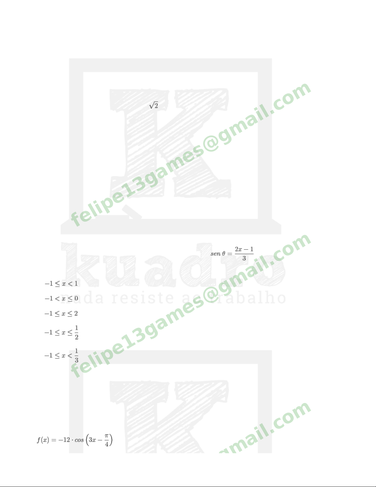 ITA18 - Matemática LM1D2-1 - Funções seno e cosseno Questão 1 (UDESC 74) Os arcos cujo cosseno é podem estar nos quadrantes a) 1º e 4º b) 1º e 2º c) 1º e 3º d) 2º e 3º e) nenhuma das anteriores f) não sei felipe13games@gmail.c om Questão 2 (PUC 76) Todos os valores de x, de modo que a expressão exista, são: a) b) c) d) e) f) não sei felipe13games@gmail.c om Questão 3 Qual das alternativas abaixo indica corretamente o período da função f:IR →IR dada por felipe13games@gmail.c om a) b) c) d) e) não sei felipe13games@gmail.c om Questão 4 Para que valores de t existe x satisfazendo a igualdade a) b) c) d) e) não sei felipe13games@gmail.c om Questão 5 (Ufrgs 2012) O número de interseções da função f(x) = sen 5x com o eixo das abscissas no intervalo [- 2π, 2π ] é a) 10. b) 14. felipe13games@gmail.c om c) 21. d) 24. e) 27. f) Não sei. felipe13games@gmail.c om Questão 6 (UNB 2012) TEXTO PARA A PRÓXIMA QUESTÃO: O circuito elétrico i lustrado acima permite modelar a descarga elétrica produzida por um peixe elétrico. Esse circuito é formado por uma fem ε, um capacitor de capacitância C e uma resistência interna r. A parte externa é representada pelo capacitor l igado a um resistor de resistência R, o qual representa um objeto que eventualmente sofre uma descarga do peixe elétrico. Quando a chave A é fechada, o capacitor carrega-se, se estiver descarregado. Nesse caso, a carga q armazenada no capacitor em função do tempo é dada por O capacitor, quando está completamente carregado, com a chave A aberta e a chave B fechada, descarrega-se. Nesse caso, a carga q armazenada no capacitor, em função do tempo, é expressa por Considere que a fem do circuito em questão seja dada pela função V = V(t) = α sen βt + γ, 0 ≤ t ≤ 8, cujo gráfico é i lustrado acima. Nesse caso, o valor de α × β × γ é igual a felipe13games@gmail.c om a) π/2. b) π. c) 3π/2. d) 2π. e) Não sei. Questão 7 (Ufrgs 2010) O período da função definida por é a) b) c) d) e) f) Não sei. felipe13games@gmail.c om Questão 8 (Unesp 2003) Observe o gráfico. Sabendo-se que ele representa uma função trigonométrica, a função y(x) éfelipe13games@gmail.c om a) -2 cos (3x). b) -2 sen (3x). c) 2 cos (3x). d) 3 sen (2x). e) 3 cos (2x). f) Não sei. felipe13games@gmail.c om Questão 9 (Unesp 1998) Sabe-se que h é o menor número positivo para o qual o gráfico de y = sen (x - h) é Então, é igual a: a) b) c) d) e) f) Não sei. felipe13games@gmail.c om felipe13games@gmail.c om Questão 10 (Fuvest 1998) Qual das afirmações a seguir é verdadeira? a) sen 210°