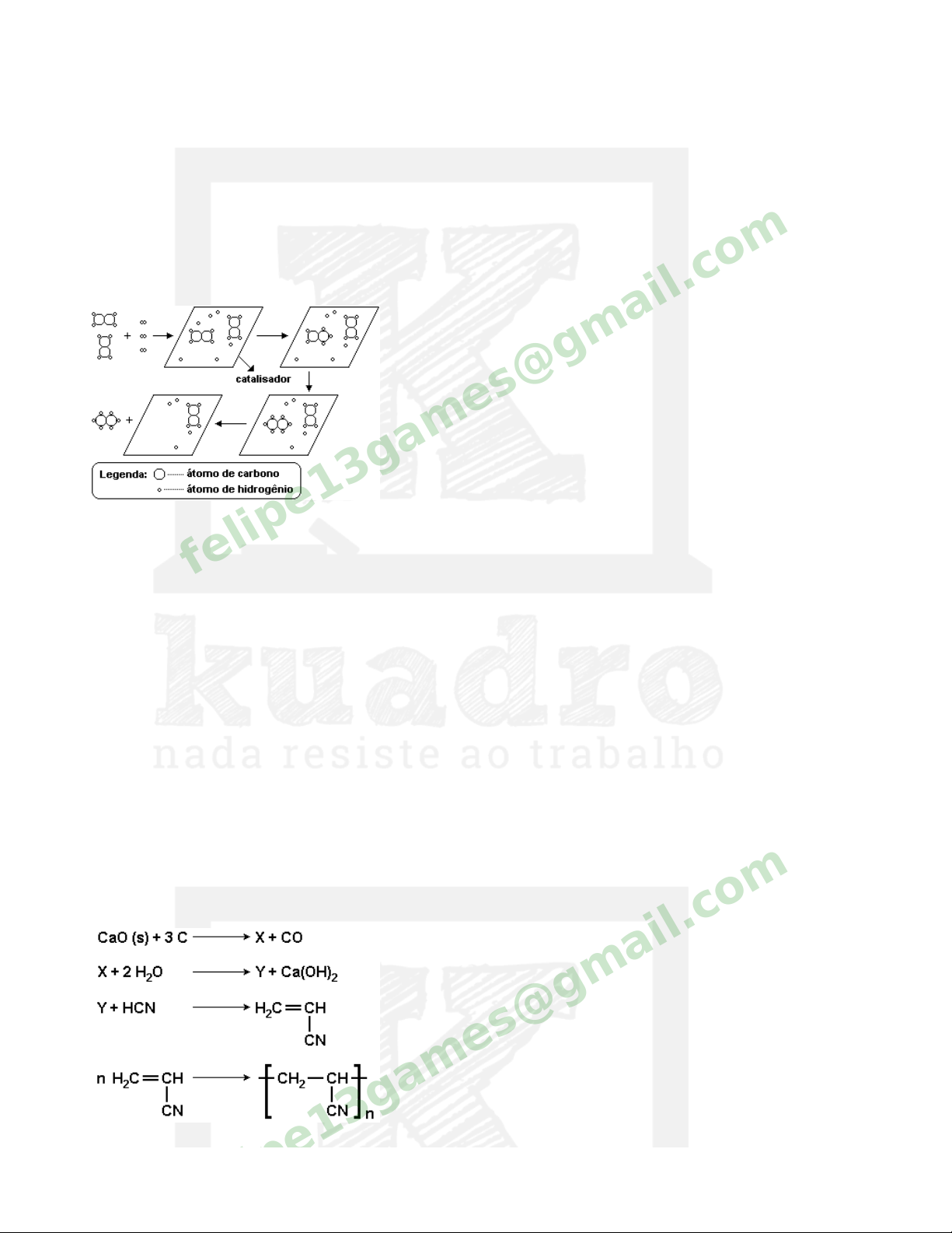 ITA18 - Química LQ6D1-2 - Reações Orgânicas Questão 1 (Fuvest 2003) O esquema a seguir representa uma transformação química que ocorre na superfície de um catalisador. Uma transformação química análoga é uti l izada industrialmente para a obtenção de a) polieti leno a partir de eti leno. b) celulose a partir de glicose. c) peróxido de hidrogênio a partir de água. d) margarina a partir de óleo vegetal. e) naftaleno a partir de benzeno. f) Não sei. felipe13games@gmail.c om Questão 2 (Unesp 2002) Considere a seguinte sequência de reações: felipe13games@gmail.c om Com respeito a estas reações, são feitas as afirmações: I. X é CaC2. II. Y é H2C CH2. III. O produto final é o polímero polivinilaceti leno. São corretas as afirmações: a) I, apenas. b) II, apenas. c) I e III, apenas. d) II e III, apenas. e) I, II e III. f) Não sei. felipe13games@gmail.c om Questão 3 (Unesp 2001) No Brasil , adiciona-se álcool etí l ico anidro à gasolina, para reduzir a combustão incompleta nos motores. Em agosto de 2000, o Ministério da Agricultura anunciou: "Mistura de álcool anidro na gasolina será reduzida de 24% para 20%. O objetivo é economizar 450 milhões de l itros de álcool este ano". Em consequência desta medida, os motores dos veículos movidos a gasolina aumentarão a emissão no ar do poluente a) acetona. b) etanal. c) dióxido de carbono; d) álcool metíl ico. e) monóxido de carbono. f) Não sei. felipe13games@gmail.c om Questão 4 (Fuvest 2009) Na Tabela Periódica, o elemento químico bromo (Br) está localizado no 4º. período e no grupo 7A (ou 17), logo abaixo do elemento cloro (C ). Com relação à substância simples bromo felipe13games@gmail.c om (Br2, ponto de fusão - 7,2 °C, ponto de ebulição 58,8 °C, sob pressão de 1 atm), um estudante de Química fez as seguintes afirmações: I. Nas condições ambientes de pressão e temperatura, o Br2 deve ser uma substância gasosa. II. Tal como o C 2, o Br2 deve reagir com o eteno. Nesse caso, o Br2 deve formar o 1,2- dibromoetano. III. Tal como o C 2, Br2 deve reagir com H2, formando um haleto de hidrogênio. Nesse caso, o Br2 deve formar o brometo de hidrogênio. É correto somente o que o estudante afirmou em: a) I b) I e II c) II e III d) I e III e) III f) Não sei. felipe13games@gmail.c om Questão 5 (Fuvest 2007) Aldeídos podem reagir com alcoóis, conforme representado na figura 1. Este tipo de reação ocorre na formação da glicose cícl ica, representada pela figura 2. Dentre os seguintes compostos, aquele que, ao reagir como indicado, porém de forma intramolecular, conduz à forma cícl ica da glicose é felipe13games@gmail.c om a) b) c) d) e) f) Não sei. Questão 6 (UF-CE) São apresentados, abaixo, quatro compostos pertencentes a várias funções orgânicas: CH3OH CH3NH2 CH2 CH2 Qual a alternativa que corresponde a dois compostos capazes de sofrer reação de adição? a) Metanol e metilamina. b) Metilamina e eteno. c) Ciclo-hexeno e metilamina. d) Ciclo-hexeno e metanol. e) Eteno e ciclo-hexeno. f) Não sei. felipe13games@gmail.c om felipe13games@gmail.c om Questão 7 (Fuvest-SP - adaptada) Hidrocarbonetos que apresentam ligação dupla podem sofrer reação de adição. Quando a reação é feita com um haleto de hidrogênio, o átomo de halogênio se adiciona ao carbono insaturado que tiver menor número de hidrogênios, conforme observou Markownikoff. Usando essa regra, dê o nome do produto que se forma na adição de: a) HI a CH3CH CH2 b) Selecione a alternativa que relaciona corretamente os nomes. a) a) 3-iodo-propano b) 1-cloro-2-metil-ciclo-hexano b) a) 2-iodo-propano b) 2-cloro-1-metil-ciclo-hexeno c) a) 2-iodo-propano b) 1-cloro-1-metil-ciclo-hexano d) a) 3-iodo-propeno b) 1-cloro-1-metil-ciclo-hexeno e) Não sei. felipe13games@gmail.c om Questão 8 (UFRGS-RS) Uma reação típica dos alcenos é a adição de halogênios à l igação dupla, formando compostos dihalogenados vicinais, conforme exemplificado abaixo: Em relação a essa equação, podemos afirmar que: a) o composto II apresenta dois carbonos assimétricos. b) o nome do produto formado é 2,3-dibromo-3-metilbutano. c) o nome do composto I é 2-metil-buteno-2. d) o alceno pode apresentar isomeria geométrica. e) o nome do produto formado é 2,3-dibromo-2-metilpropano. f) Não sei. felipe13games@gmail.c om felipe13games@gmail.c om Questão 9 (UFSM-RS) O eugenol tem a fórmula estrutural abaixo. Com relação a esse composto, não é correto afirmar que: a) descora a solução de bromo em CC 4. b) é uma substância insaturada. c) apresenta função fenol. d) apresenta função éter. e) apresenta função álcool. f) Não sei. felipe13games@gmail.c om Questão 10 (UFRN) O produto da reação entre 2 mols de HBr e 1 mol de 1-butino em meio aquoso é: a) 2-bromo-1-buteno b) 1-bromo-1-buteno c) 1,1-dibromo-buteno d) 2,2-dibromo-butano e) 1,2-dibromo-butano f) Não sei. felipe13games@gmail.c om Questão 11 (Fuvest-SP) felipe13games@gmail.c om Os compostos representados acima podem ser obtidos por reações de adição de substâncias adequadas ao: a) metano b) eteno c) etino d) propeno e) 2-butino f) Não sei. felipe13games@gmail.c om Questão 12 (UFF-RJ) Por meio da reação de butanona com cloreto de metilmagnésio (H3C MgC ), obtém-se o composto X que, por sua vez, em reação com a água, origina o composto denominado: a) 2-metil-2-butanol b) 2-pentanona c) pentanal d) 3-metil-2-butanol e) 2-pentanol f) Não sei. felipe13games@gmail.c om Questão 13 (Mackenzie-SP) Propeno + H2O X Na equação acima, X corresponde a: felipe13games@gmail.c om a) propano b) 1-propanol c) 2-propanol d) propanal e) propanona f) Não sei. felipe13games@gmail.c om Questão 14 (Fuvest-SP) Dois hidrocarbonetos insaturados, que são isômeros, foram submetidos, separadamente, à hidrogenação catalítica. Cada um deles reagiu com H2 na proporção, em mols, de 1 : 1, obtendo-se, em cada caso, um hidrocarboneto de fórmula C4H10.