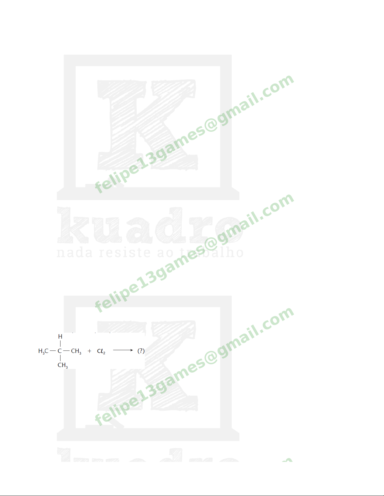 ITA18 - Química LQ6D1-5 - Reações Orgânicas Questão 1 (Cesgranrio-RJ) Identifique o número de produtos monoclorados obtidos pela substituição de qualquer átomo de hidrogênio em 2,4-dimetil-pentano por um átomo de cloro. a) 2 b) 3 c) 4 d) 5 e) 6 f) Não sei. felipe13games@gmail.c om Questão 2 (Fesp-SP) Quantos derivados monobromados se obtêm durante a bromação do 2-metil-pentano a 300 °C? a) 2 b) 4 c) 3 d) 6 e) 5 f) Não sei. felipe13games@gmail.c om Questão 3 (PUC-MG) O produto principal da reação de substituição é: a) cloreto de isopropila. b) 1,1-dicloro-butano. c) 1,2-dicloro-butano. d) 2-metil-1-cloro-propano. e) 2-metil-2-cloro-propano. f) Não sei. felipe13games@gmail.c om felipe13games@gmail.c om felipe13games@gmail.c om Questão 4 (Fesp-PE) Na halogenação do composto 3-metil-pentano, em reação de substituição, o átomo de hidrogênio mais facilmente substituível pelo halogênio se situa no carbono: a) 1 b) 2 c) 3 d) 4 e) 5 f) Não sei. felipe13games@gmail.c om Questão 5 (Cesgranrio-RJ) O tetracloreto de carbono é um dos solventes orgânicos mais uti l izados para lavagem de roupa “a seco”. O tipo de cisão envolvida e os produtos formados na síntese do tetracloreto de carbono a partir de metano e cloro, em presença de luz ultravioleta, são, respectivamente: a) homolítica/HC e CC 4 b) homolítica/H2, HC e CC 4 c) heterolítica/H2, e CC 4 d) heterolítica/CH2C 2 e HC e) heterolítica/CH3C e HC f) Não sei. felipe13games@gmail.c om Questão 6 (Mackenzie-SP) O ácido pícrico, ingrediente usado em pomadas para queimaduras, tem a seguinte fórmula estrutural plana: A respeito dessa substância, fazem-se as afirmações: I. Apresenta radical nitro nas posições orto e para. II. Pode ser obtida por nitração do fenol. III. 2,4,6-trinitro-fenol é o seu nome oficial. IV. Possui grupo hidróxi l igado a anel aromático. V. Possui grupo amino em sua estrutura. Das afirmações feitas, estão corretas: a) II, III e IV, somente. b) IV e V, somente. felipe13games@gmail.c om c) I e II, somente. d) III e IV, somente. e) I, II, III e IV, somente. f) Não sei. Questão 7 (UFV-MG) Substâncias que apresentam aneis benzênicos em suas estruturas podem sofrer reações de substituição eletrofí l ica, conforme o exemplo abaixo, onde o FeBr3 atua como catalisador: Dentre as opções abaixo, identifique aquela que corresponde aos compostos (I) e (II): a) (I) = Br2 e (II) = FeBr2 b) (I) = NaBr e (II) = NaH c) (I) = HBr e (II) = H2 d) (I) = HBr e (II) = H+ e) (I) = Br2 e (II) = HBr f) Não sei. felipe13games@gmail.c om Questão 8 (Cesgranrio-RJ) As reações de substituição do tolueno com C 2 podem gerar diferentes produtos, dependendo das condições em que ocorram. No caso em que essa substituição é realizada com aquecimento e na presença de luz, o produto orgânico formado é: a) b) c) felipe13games@gmail.c om d) e) f) Não sei. Questão 9 (UFPR) Dentre os hidrocarbonetos, cujas fórmulas são aqui apresentadas, qual daria somente um composto, se substituíssemos apenas um dos átomos de hidrogênio do anel? a) 1 b) 2 c) 3 d) 4 e) 5 f) Não sei. felipe13games@gmail.c om Questão 10 (UFSM-RS) A vanil ina, cuja estrutura está representada ao lado, é uma substância responsável pelo odor característico da baunilha, sendo empregada como flavorizante na indústria de alimentos. Analisando a estrutura dessa substância, pode-se dizer que: a) há um grupo ativante e dois desativantes. b) há um grupo desativante e dois ativantes. c) há três grupos ativantes. felipe13games@gmail.c om d) há três grupos desativantes. e) os grupos OH, OCH3 e CHO não exercem nenhum efeito sobre o anel aromático. f) Não sei. felipe13games@gmail.c om Questão 11 (UFSM-RS) Observe as equações de reações de substituição eletrofí l ica em compostos aromáticos: Os nomes corretos dos produtos A e B são, respectivamente: a) 1,4–dibromobenzeno e 4–bromofenol. b) 1,2,3–tribromobenzeno e 2–bromofenol. c) 5–bromobenzeno e 2,4–dibromofenol. d) 1,2–dibromobenzeno e 1,1,3–tribromofenol. e) bromobenzeno e 2,4,6–tribromofenol. f) Não sei. felipe13games@gmail.c om Questão 12 (UFF-RJ) O tolueno é muito usado na indústria tanto como solvente quanto como intermediário químico na fabricação de explosivos. Identifique o composto formado, preferencialmente, pela trinitração do tolueno, considerando as regras usuais de substituição aromática. a) b) felipe13games@gmail.c om c) d) e) f) Não sei. felipe13games@gmail.c om Questão 13 (PUC-PR) O fenol reage com duas moléculas de ácido nítrico e fornece um dinitrocomposto. Dos produtos teoricamente possíveis abaixo relacionados, o mais provável é: a) b) c) d) e) f) Não sei. felipe13games@gmail.c om felipe13games@gmail.c om Questão 14 (Fuvest-SP) Quando se efetua a reação de nitração do bromobenzeno, são produzidos três compostos isoméricos mononitrados: Efetuando-se a nitração do para-dibromobenzeno, em reação análoga, o número de compostos mononitrados sintetizados é igual a: a) 1 b) 2 c) 3 d) 4 e) 5 f) Não sei. felipe13games@gmail.c om Questão 15 (Cesgranrio-RJ) A substituição de quatro átomos de H do benzeno por quatro átomos de cloro fornece um número de isômeros de posição igual a: a) 2 b) 3 c) 4 d) 5 e) 6 f) Não sei. felipe13games@gmail.c om Questão 16 Identifique com (o/p) e com (m) os radicais orto-para e meta-dirigentes, respectivamente: A sequência correta encontrada foi: a) a) o / p; b) o / p; c) m; d) m; e) o / p; f) m. b) a) m; b) m; c) m; d) o / p; e) m; f) o / p. felipe13games@gmail.c om c) a) o / p; b) o / p; c) m; d) o / p; e) o / p; f) m. d) a) m; b) m; c) o / p; d) o / p; e) o / p; f) m. e) Não sei felipe13games@gmail.c om Questão 17 (PUC-PR) A monocloração do nitrobenzeno produz: a) o-cloro-nitrobenzeno. b) m-cloro-nitrobenzeno. c) p-cloro-nitrobenzeno. d) uma mistura equimolecular de o-cloro-nitrobenzeno e p-cloro-nitrobenzeno. e) cloro-benzeno. f) N