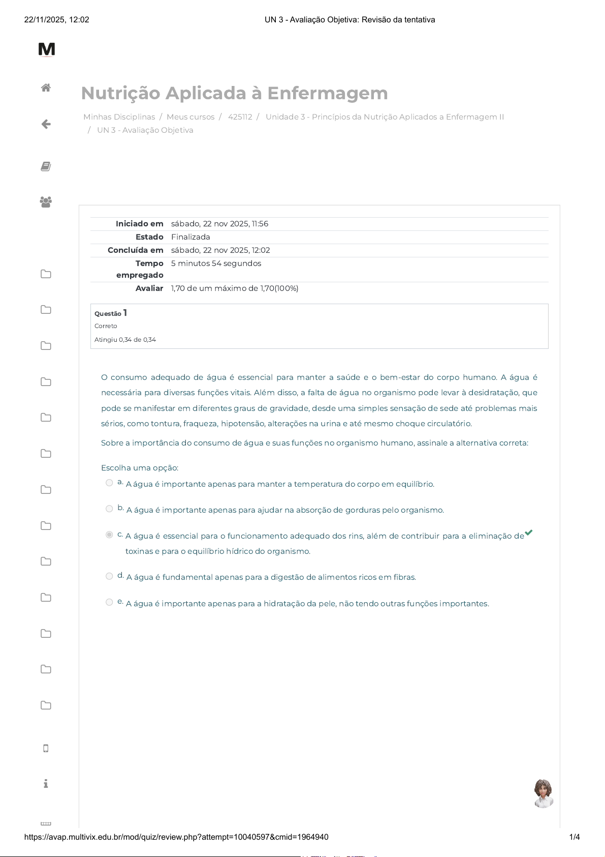Minhas Disciplinas / Meus cursos / 425112 / Unidade 3 - Princípios da Nutrição Aplicados a Enfermagem II / UN 3 - Avaliação Objetiva Nutrição Aplicada à Enfermagem Iniciado em sábado, 22 nov 2025, 11:56 Estado Finalizada Concluída em sábado, 22 nov 2025, 12:02 Tempo empregado 5 minutos 54 segundos Avaliar 1,70 de um máximo de 1,70(100%) Questão 1 Correto Atingiu 0,34 de 0,34 O consumo adequado de água é essencial para manter a saúde e o bem-estar do corpo humano. A água é necessária para diversas funções vitais. Além disso, a falta de água no organismo pode levar à desidratação, que pode se manifestar em diferentes graus de gravidade, desde uma simples sensação de sede até problemas mais sérios, como tontura, fraqueza, hipotensão, alterações na urina e até mesmo choque circulatório. Sobre a importância do consumo de água e suas funções no organismo humano, assinale a alternativa correta: Escolha uma opção: a. A água é importante apenas para manter a temperatura do corpo em equilíbrio. b. A água é importante apenas para ajudar na absorção de gorduras pelo organismo. c. A água é essencial para o funcionamento adequado dos rins, além de contribuir para a eliminação de toxinas e para o equilíbrio hídrico do organismo. d. A água é fundamental apenas para a digestão de alimentos ricos em fibras. e. A água é importante apenas para a hidratação da pele, não tendo outras funções importantes. 22/11/2025, 12:02 UN 3 - Avaliação Objetiva: Revisão da tentativa https://avap.multivix.edu.br/mod/quiz/review.php?attempt=10040597&cmid=1964940 1/4 https://avap.multivix.edu.br/my/ https://avap.multivix.edu.br/course/view.php?id=36514 https://avap.multivix.edu.br/course/view.php?id=36514§ion=4 https://avap.multivix.edu.br/mod/quiz/view.php?id=1964940 https://avap.multivix.edu.br/my/ https://avap.multivix.edu.br/course/view.php?id=36514 https://avap.multivix.edu.br/user/index.php?id=36514 https://avap.multivix.edu.br/course/view.php?id=36514§ion=1 https://avap.multivix.edu.br/course/view.php?id=36514§ion=2 https://avap.multivix.edu.br/course/view.php?id=36514§ion=3 https://avap.multivix.edu.br/course/view.php?id=36514§ion=4 https://avap.multivix.edu.br/course/view.php?id=36514§ion=5 https://avap.multivix.edu.br/course/view.php?id=36514§ion=6 https://avap.multivix.edu.br/course/view.php?id=36514§ion=7 https://avap.multivix.edu.br/course/view.php?id=36514§ion=8 https://avap.multivix.edu.br/course/view.php?id=36514§ion=9 https://avap.multivix.edu.br/course/view.php?id=36514§ion=10 https://avap.multivix.edu.br/course/view.php?id=36514§ion=11 https://avap.multivix.edu.br/course/view.php?id=36514§ion=12 https://avap.multivix.edu.br/course/view.php?id=36514§ion=13 https://avap.multivix.edu.br/hooks/portal/ https://avap.multivix.edu.br/mod/page/view.php?id=1252%2F%22%20target%3D%22_blank https://avap.multivix.edu.br/calendar/view.php/ https://avap.multivix.edu.br/ https://avap.multivix.edu.br/ https://avap.multivix.edu.br/ https://avap.multivix.edu.br/ https://avap.multivix.edu.br/ Questão 2 Correto Atingiu 0,34 de 0,34 Questão 3 Correto Atingiu 0,34 de 0,34 Em uma aula, o professor está explicando sobre a importância de uma alimentação saudável e balanceada. O ferro é um mineral essencial para o organismo humano e é necessário para a formação de células vermelhas do sangue. Alimentos ricos em ferro são fundamentais na alimentação, no entanto, nem sempre são bem absorvidos pelo corpo, o que pode levar à deficiência de ferro. A absorção de ferro é influenciada por diversos fatores, como pela presença de outras substâncias na alimentação. A vantagem de consumir alimentos fonte de vitamina C junto a alimentos ricos em ferro é: Escolha uma opção: a. o aumento da digestão de gorduras. b. a diminuição da absorção do ferro pelo organismo. c. o aumento da produção de ácido úrico no organismo. d. o aumento da produção de cálcio no organismo. e. a melhora da biodisponibilidade do ferro para o organismo. A contaminação de alimentos é uma preocupação constante em todo o mundo, uma vez que pode representar um risco para a saúde pública. Existem diferentes tipos de contaminação dos alimentos, sendo que a contaminação microbiológica é uma das mais comuns e preocupantes. Dentre os principais riscos microbiológicos na contaminação dos alimentos, destacam-se: a Salmonella, a Escherichia coli e a Listeria monocytogenes, que podem causar infecções alimentares graves e até mesmo levar à morte. Assinale a opção que apresenta um exemplo de risco microbiológico: Escolha uma opção: a. Ingestão de um pedaço de vidro em um alimento. b. Excesso de sal em um produto alimentício. c. Utilização de um ingrediente vencido na preparação de um prato. d. Ingestão de um alimento contendo bactérias patogênicas. e. Consumo de leite cru que não foi pasteurizado. 22/11/2025, 12:02 UN 3 - Avaliação Objetiva: Revisão da tentativa https://avap.multivix.edu.br/mod/quiz/review.php?attempt=10040597&cmid=1964940 2/4 https://avap.multivix.edu.br/my/ https://avap.multivix.edu.br/course/view.php?id=36514 https://avap.multivix.edu.br/user/index.php?id=36514 https://avap.multivix.edu.br/course/view.php?id=36514§ion=1 https://avap.multivix.edu.br/course/view.php?id=36514§ion=2 https://avap.multivix.edu.br/course/view.php?id=36514§ion=3 https://avap.multivix.edu.br/course/view.php?id=36514§ion=4 https://avap.multivix.edu.br/course/view.php?id=36514§ion=5 https://avap.multivix.edu.br/course/view.php?id=36514§ion=6 https://avap.multivix.edu.br/course/view.php?id=36514§ion=7 https://avap.multivix.edu.br/course/view.php?id=36514§ion=8 https://avap.multivix.edu.br/course/view.php?id=36514§ion=9 https://avap.multivix.edu.br/course/view.php?id=36514§ion=10 https://avap.multivix.edu.br/course/view.php?id=36514§ion=11 https://avap.multivix.edu.br/course/view.php?id=36514§ion=12 https://avap.multivix.edu.br/co