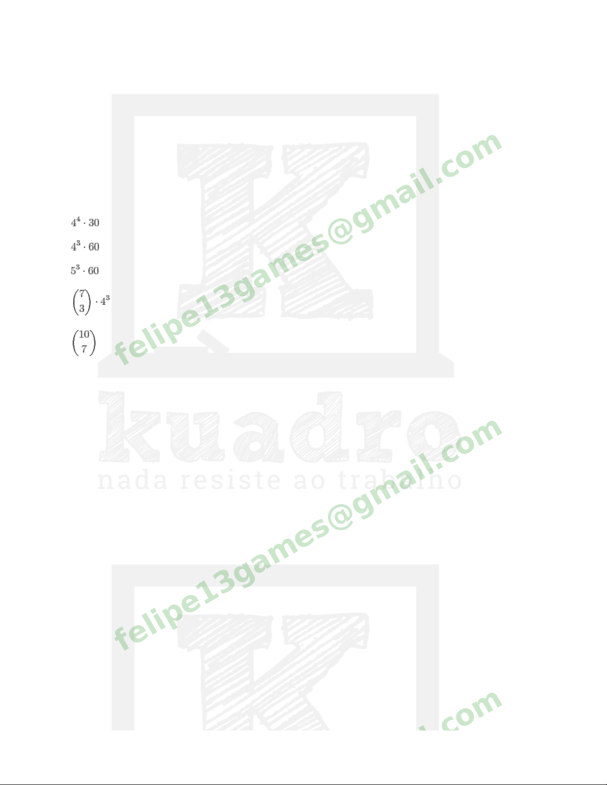 ITA18 - Revisão LMAT6A-1 - Análise Combinatória Questão 1 (Ita 2006) Considere uma prova com 10 questões de múltipla escolha, cada questão com 5 alternativas. Sabendo que cada questão admite uma única alternativa correta, então o número de formas possíveis para que um candidato acerte somente 7 das 10 questões é a) b) c) d) e) f) Não sei. felipe13games@gmail.c om Questão 2 (Ita 2004) Considere 12 pontos distintos dispostos no plano, 5 dos quais estão numa mesma reta. Qualquer outra reta do plano contém, no máximo, 2 destes pontos. Quantos triângulos podemos formar com os vértices nestes pontos? a) 210 b) 315 c) 410 d) 415 e) 521 f) Não sei. felipe13games@gmail.c om Questão 3 (Ita 2002) Quantos anagramas com 4 letras distintas podemos formar com as 10 primeiras letras do felipe13games@gmail.c om alfabeto e que contenham 2 das letras a, b e c? a) 1692. b) 1572. c) 1520. d) 1512. e) 1392. f) Não sei. felipe13games@gmail.c om Questão 4 Pintam-se N cubos iguais uti l izando-se 6 cores diferentes, uma para cada face. Considerando que cada cubo pode ser perfeitamente distinguido dos demais, o maior valor possível de N é igual a a) 10 b) 15 c) 20 d) 25 e) 30 f) Não sei felipe13games@gmail.c om Questão 5 (IME 2016) Um hexágono é dividido em 6 triângulos equiláteros. De quantas formas podemos colocar os números de 1 a 6 em cada triângulo, sem repetição, de maneira que a soma dos números em três triângulos adjacentes seja sempre múltiplo de 3? Soluções obtidas por rotação ou reflexão são diferentes, portanto as figuras abaixo mostram duas soluções distintas. a) 12 felipe13games@gmail.c om b) 24 c) 36 d) 48 e) 96 f) Não sei felipe13games@gmail.c om Questão 6 (IME 2013) Em uma festa de aniversário estão presentes famílias com pai, mãe e 2 fi lhos, além de 2 famílias com pai, mãe e 1 fi lho. Organiza-se uma brincadeira que envolve esforço físico, na qual uma equipe azul enfrentará uma equipe amarela. Para equil ibrar a disputa, uma das equipes terá apenas o pai de uma das famílias, enquanto a outra equipe terá 2 pessoas de uma mesma família, não podendo incluir o pai. É permitido que o pai enfrente 2 pessoas de sua própria família. Para que se tenha exatamente 2014 formas distintas de se organizar a brincadeira, o valor de deverá ser a) (A) 17 b) (B) 18 c) (C) 19 d) (D) 20 e) (E) 21 f) Não sei felipe13games@gmail.c om Questão 7 Sobre duas retas paralelas e são tomados 13 pontos, pontos em e pontos em , sendo > . Com os pontos são formados todos os triângulos e quadriláteros convexos possíveis. Sabe - se que o quociente entre o números de quadriláteros e o número de triângulos é 15/11. Então os valores de e são, respectivamente: a) A ( ) 2 e 11 b) B ( ) 3 e 10 c) C ( ) 4 e 9 d) D ( ) 5 e 8 e) E ( ) 6 e 7felipe13games@gmail.c om felipe13games@gmail.c om felipe13games@gmail.c om Questão 8 Quantas diagonais possui um polígono de lados? felipe13games@gmail.c om Questão 9 Quantas diagonais possui: a) Um octaedro regular? b) Um icosaedro regular? c) Um dodecaedro regular? d) Um cubo? e) Um prisma hexagonal regular? felipe13games@gmail.c om Questão 10 Determine quantos paralelepípedos retângulos diferentes podem ser construídos de tal maneira que a medida de cada uma de suas arestas seja um números inteiro positivo que não exceda 10. felipe13games@gmail.c om Questão 11 São dados pontos em círculo. Quantos ágonos (não necessariamente convexos) existem com vértices nesses pontos? felipe13games@gmail.c om ITA18 - Revisão LMAT6A-1 - Análise Combinatória