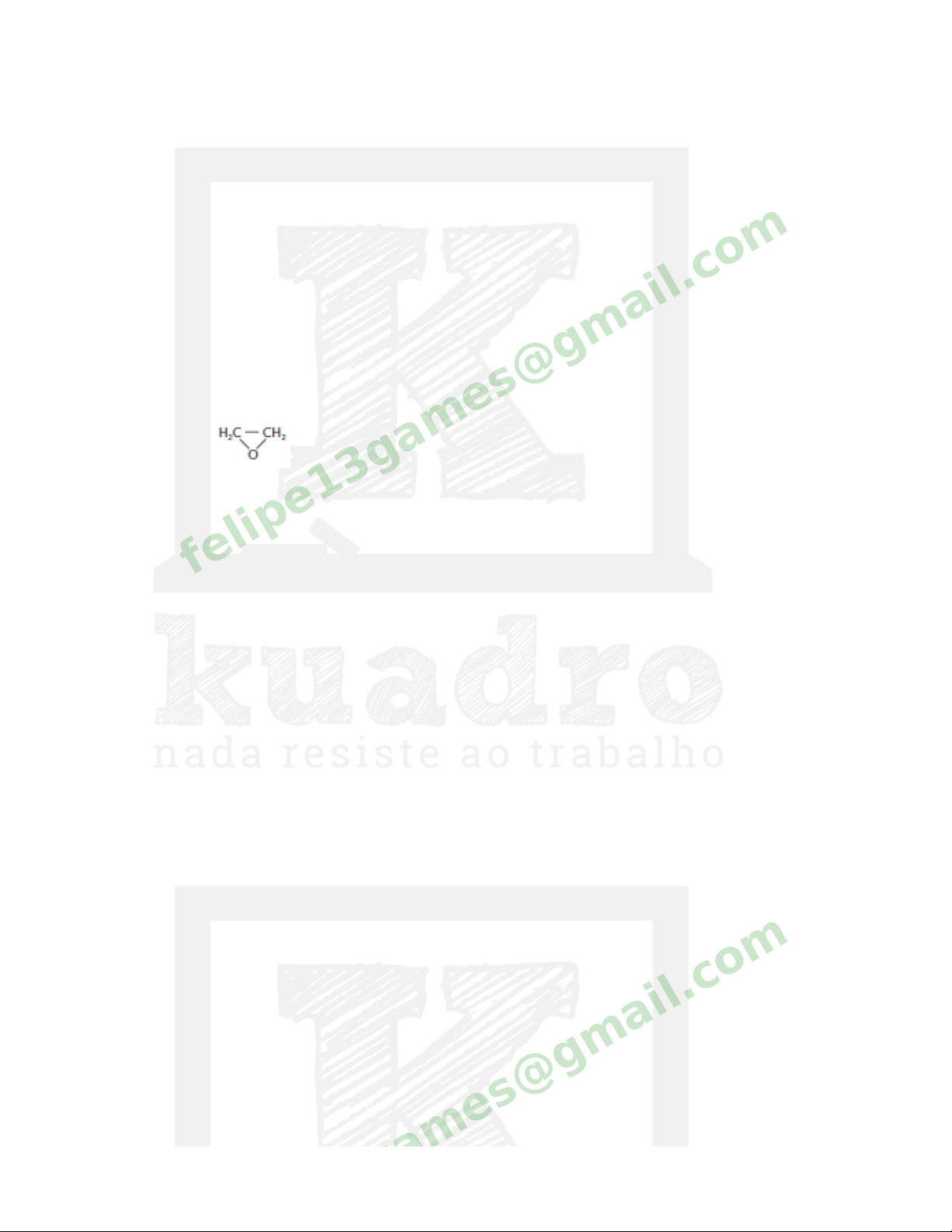 ITA18 - Química LQ4D1-2 - Propriedades físicas dos compostos orgânicos Questão 1 (UFBA - adaptada) Com base nos conhecimentos sobre compostos de carbono e funções orgânicas, pode-se afirmar: (01) CH3CH(OH)COOH apresenta os grupos funcionais dos álcoois e dos ácidos carboxíl icos. (02) Hidrocarbonetos aromáticos são compostos de cadeia saturada. (04) Nos monoálcoois primários de cadeia normal, o ponto de ebulição aumenta com o aumento da massa molar. (08) A estrutura representa a fórmula de um éter. (16) H3CCONH2 representa a fórmula da metanoamida. (32) Nas fases l íquida e sólida, os hidrocarbonetos alifáticos apresentam interações do tipo dipolo instantâneo-dipolo induzido. (64) Na desti lação fracionada do petróleo, as frações dos componentes de maior massa molar desti lam a uma temperatura mais baixa. a) 01, 04, 08 e 32 são corretas. b) 02, 04, 16 e 32 são corretas. c) 01, 02, 04 e 08 são corretas. d) 01, 04, 16 e 32 são corretas. e) 02, 04, 08 e 16 são corretas. f) não sei. felipe13games@gmail.c om Questão 2 (Ufrn 2013) O etino (C2H2), conhecido como aceti leno, é bastante usado em solda de metais. Quando obtido na indústria, pode apresentar impurezas como o sulfeto de hidrogênio (H2S), molécula de geometria angular. Se o gás aceti leno contiver essa impureza, pode ser purificado fazendo-o passar através de a) éter metíl ico (CH3OCH3), pois o H2S é dissolvido, e o etino, pelo fato de ser formado por moléculas polares, não se dissolve nele. felipe13games@gmail.c om b) tetracloreto de carbono l íquido (CC 4)�, pois o H2S é dissolvido, e o etino, pelo fato de ser formado por moléculas apolares, não se dissolve nele. c) água l íquida (H2O), pois o H2S é dissolvido, e o etino, pelo fato de ser formado por moléculas apolares, não se dissolve nela. d) pentano (C5H12), pois o H2S é dissolvido, e o etino, pelo fato de ser formado por moléculas polares e apolares, não se dissolve nele. e) Não sei. felipe13games@gmail.c om Questão 3 (Ufrn 2004) Um estudante recebeu uma tabela, reproduzida a seguir, em que constam algumas propriedades físicas de três compostos diferentes: Composto Ponto de fusão (ºC) Ponto de ebulição (ºC) Solubilidade em água a 25 ºC I -138 0 insolúvel II -90 117,7 solúvel III -116 34,6 parcialmente solúvel Segundo essa tabela, os possíveis compostos I, II e III são, respectivamente, a) 1-butanol, n-butano e éter etí l ico. b) n-butano, 1-butanol e éter etí l ico. c) n-butano, éter etí l ico e 1-butanol. d) éter etí l ico, 1-butanol e n-butano. e) Não sei. felipe13games@gmail.c om Questão 4 (UFU-MG) O sabor artificial de laranja pode ser conseguido com acetato de octi la. Em relação a esse composto, as seguintes afirmativas estão corretas, exceto: a) As l igações químicas presentes na molécula de acetato de octi la são covalentes, do tipo σ e π. b) O acetato de octi la pertence à função orgânica éster. c) Todos os átomos de carbono na molécula de acetato de octi la têm geometria tetraédrica. d) A molécula de acetato de octi la tem a fórmula molecular C10H20O2. felipe13games@gmail.c om e) não sei. felipe13games@gmail.c om Questão 5 (UFV-MG) Considere a fórmula estrutural abaixo: São feitas as seguintes afirmativas: I. O átomo de carbono 5 forma 4 l igações σ (sigma). II. O átomo de carbono 3 forma 3 l igações σ (sigma) e 1 l igação π (pi). III. O átomo de carbono 2 forma 3 l igações π (pi) e 1 l igação σ (sigma). IV. O total de l igações π (pi) na estrutura é igual a 3. Identifique a alternativa correta. a) Apenas as afirmativas I e IV são corretas. b) Apenas as afirmativas II e III são corretas. c) Apenas as afirmativas I, II e IV são corretas. d) Todas as afirmativas são corretas. e) Apenas as afirmativas I e II são corretas. f) não sei. felipe13games@gmail.c om Questão 6 (Fuvest - SP) As figuras abaixo representam moléculas constituídas de carbono, hidrogênio e oxigênio. Elas são, respectivamente: a) etanoato de metila, propanona e 2-propanol. b) 2-propanol, propanona e etanoato de metila.felipe13games@gmail.c om c) 2-propanol, etanoato de metila e propanona. d) propanona, etanoato de metila e 2-propanol. e) propanona, 2-propanol e etanoato de metila. f) não sei. felipe13games@gmail.c om Questão 7 (ITA-SP) A(s) l igação(ões) carbono-hidrogênio existente(s) na molécula de metano (CH4) pode(m) ser interpretada(s) como sendo formada(s) pela interpenetração frontal dos orbitais atômicos s do átomo de hidrogênio, com os seguintes orbitais atômicos do átomo de carbono: a) Quatro orbitais p. b) Quatro orbitais sp3. c) Um orbital híbrido sp3. d) Um orbital s e três orbitais p. e) Um orbital p e três orbitais sp2. f) não sei. felipe13games@gmail.c om Questão 8 (Vunesp) Na molécula de propino, o número de l igações σ (sigma) e de l igações π (pi) são, respectivamente: a) 2 e 2. b) 5 e 1. c) 5 e 2. d) 6 e 2. e) 7 e 1. f) não sei. felipe13games@gmail.c om felipe13games@gmail.c om felipe13games@gmail.c om Questão 9 (Fuvest-SP) Em um laboratório, três frascos com líquidos incolores estão sem os devidos rótulos. Ao lado deles, estão os três rótulos com as seguintes identificações: ácido etanoico, pentano e 1-butanol. Para poder rotular corretamente os frascos, determinam-se, para esses l íquidos, o ponto de ebulição (P.E.) sob 1 atm e a solubil idade em água (S) a 25 °C. Líquido P.E./oC S/(g/100 mL) X 36 0,035 Y 117 7,3 Z 118 Infinita Com base nessas propriedades, conclui-se que os l íquidos X, Y e Z são, respectivamente: a) pentano, 1-butanol e ácido etanoico. b) pentano, ácido etanoico e 1-butanol. c) ácido etanoico, pentano e 1-butanol. d) 1-butanol, ácido etanoico e pentano. e) 1-butanol, pentano e ácido etanoico. f) não sei. felipe13games@gmail.c om Questão 10 (Vunesp) Têm-se os seguintes pares de substâncias: I. n-octano e tetracloreto de carbono; II. água e benzeno; III. cloreto d