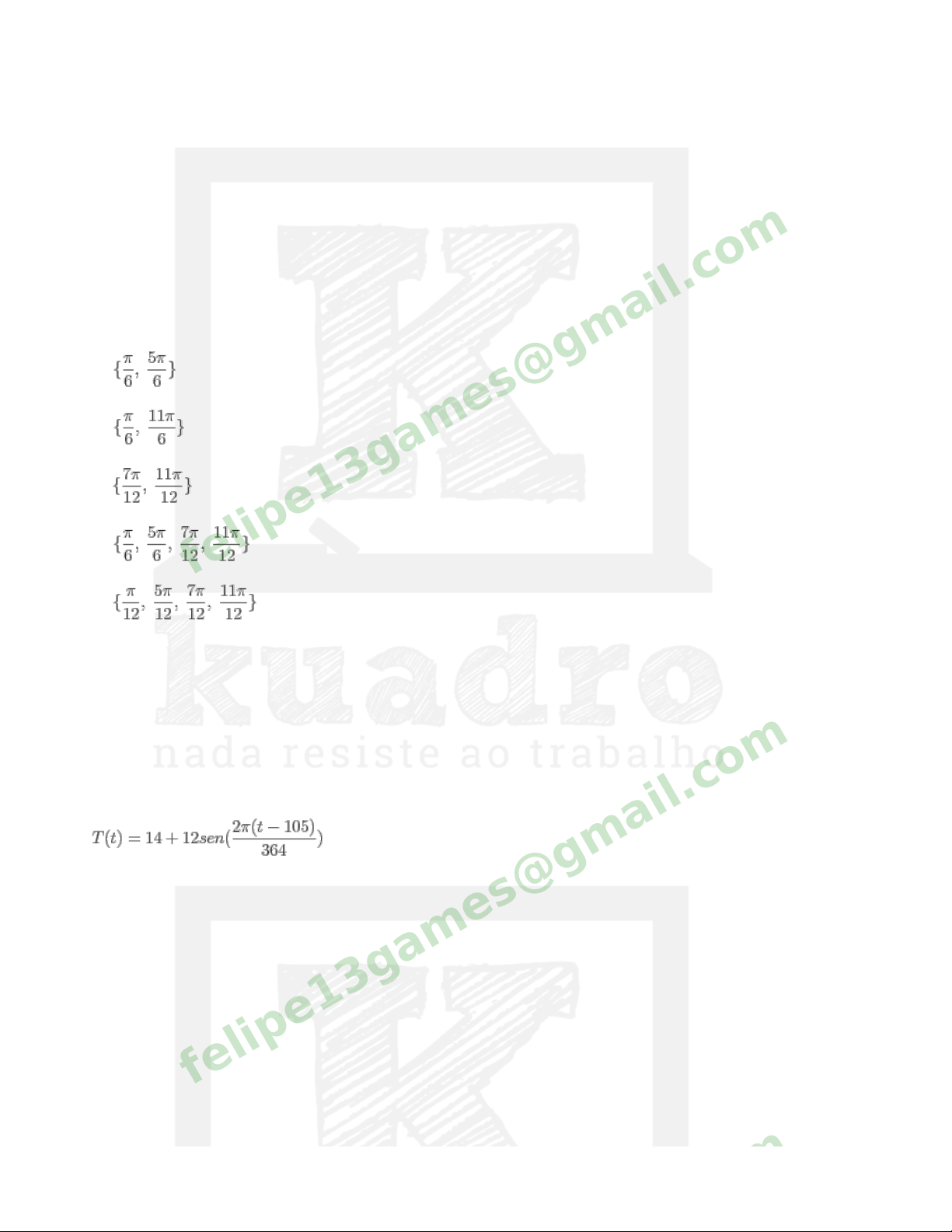 ITA18 - Matemática LM4D1-3 - Equações trigonométricas Questão 1 (Cefet MG 2015) Sejam f : [0, π] → [–2, 2] e g: ℝ → ℝ funções descritas por f(x) = 4senx cosx e g(x) = 1 – | x |. O conjunto da equação (g o f)(x) = 0 é a) b) c) d) e) f) Não sei felipe13games@gmail.c om Questão 2 (Ucs 2014) Suponha que, em determinado lugar, a temperatura média diária T, em °C, possa ser expressa, em função do tempo t, em dias decorridos desde o início do ano, por . Segundo esse modelo matemático, a temperatura média máxima nesse lugar, ocorre, no mês de a) Julho. b) Setembro. c) Junho. d) Dezembro. e) Março. f) Não sei. felipe13games@gmail.c om felipe13games@gmail.c om felipe13games@gmail.c om Questão 3 (Mackenzie 2014) O valor de θ que satisfaz o sistema, para x e θ reais, com 0 ≤ θ ≤ π é a) 0 b) c) π d) e) f) Não sei felipe13games@gmail.c om Questão 4 (Uece 2014) Usando a expressão clássica do desenvolvimento da potência (a + b)n, onde a e b são números reais e n é um número natural, pode-se resolver facilmente a equação sen4x - 4sen3x + 6sen2x - 4senx +1 =0. Então, para os valores de x encontrados, teremos que cosx é igual a a) b) c) d) e) não sei. felipe13games@gmail.c om Questão 5 (Pucrs 2014) Se 0 ≤ x