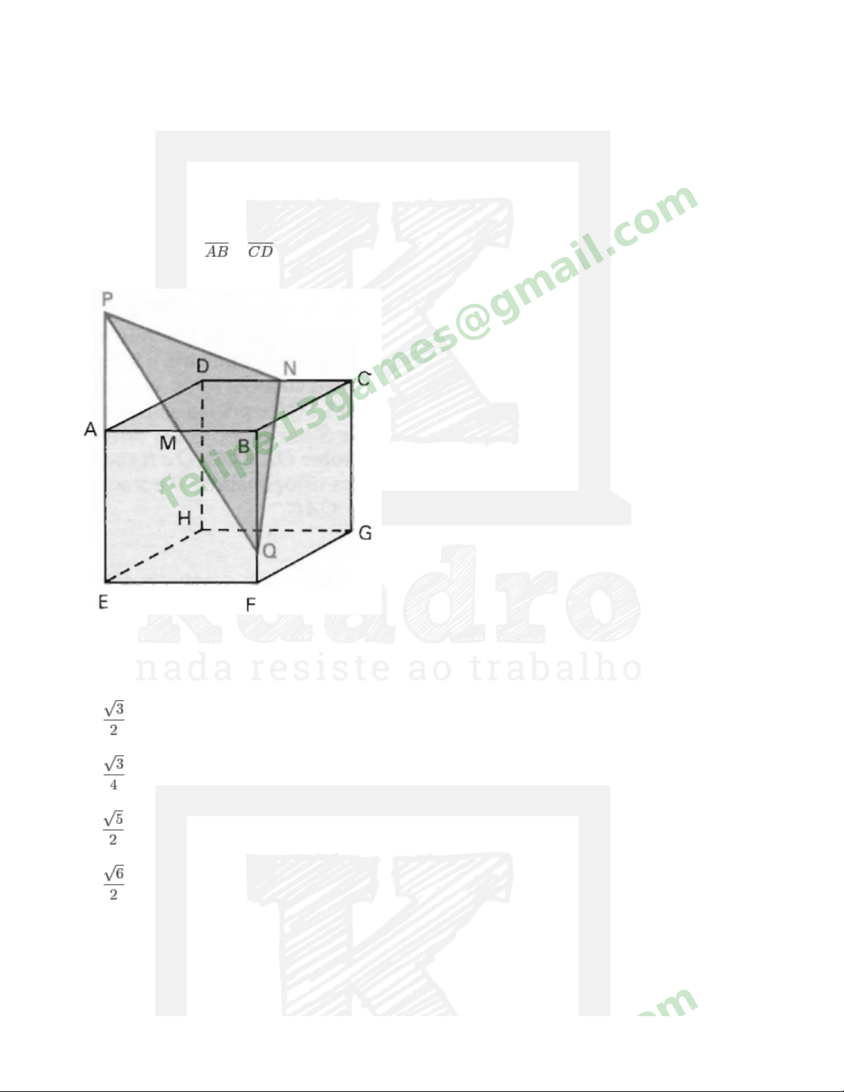 ITA18 - Matemática LM7C2 - Pirâmide Questão 1 Considere um cubo ABCDEFGH de lado 1 unidade de comprimento, como na figura. M e N são os pontos médios de e , respectivamente. Para cada ponto P da reta AE, seja Q o ponto de interseção das retas PM e BF. A que distância do ponto A deve estar o ponto P para que o ΔPQN seja retângulo? a) unidades de comprimento b) unidades de comprimento c) unidades de comprimento d) unidades de comprimento e) Não sei. felipe13games@gmail.c om Questão 2 felipe13games@gmail.c om Indique a opção que possui a área lateral de uma pirâmide quadrangular regular, sabendo que a diagonal da base da pirâmide mede cm e a aresta lateral é igual à diagonal da base. a) b) c) d) e) Não sei. felipe13games@gmail.c om Questão 3 Determine a altura de uma pirâmide triangular regular, sabendo que a área total é cm2 e o raio do círculo inscrito na base mede 2 cm. a) b) c) d) e) Não sei. felipe13games@gmail.c om Questão 4 Uma pirâmide quadrangular regular tem as arestas laterais congruentes às arestas da base. Qual é a área da secção obtida nesse poliedro por um plano que passa pelo vértice e pelos pontos médios de dois lados opostos da base, sendo a a medida das arestas laterais? a) b) c) felipe13games@gmail.c om d) e) Não sei. felipe13games@gmail.c om Questão 5 Seja ABCDEFGH um cubo no qual AB, AC, AD, EF, EG, EH são seis de suas 12 arestas, de sorte que A e E são vértices opostos. Calcule o volume do sólido BCDFGH em termos do comprimento das arestas do cubo. a) b) c) d) e) Não sei. felipe13games@gmail.c om Questão 6 (CESGRANRIO - 80) Para fazer o telhado de uma casa de cartolina, um quadrado de centro O e de lado 2 é recortado, como mostra a figura I. Os lados AB= CD = EF = GH medem . Montado o telhado (figura II), sua altura h é: felipe13games@gmail.c om a) b) c) d) e) f) Não sei. felipe13games@gmail.c om Questão 7 (CESGRANRIO - 80) Considere uma pirâmide hexagonal regular de altura h e lado da base como mostrada na figura. Traça-se o segmento GD ligando o vértice D ao ponto G que divide a aresta VC ao meio. Se α é o ângulo agudo formado por GD e sua projeção na base da pirâmide, então tg α é: felipe13games@gmail.c om a) b) c) d) e) f) Não sei. felipe13games@gmail.c om Questão 8 (CESGRANRIO - 84) Em um cubo de aresta , considera-se o tetraedro VABC, como indicado na figura. O volume do tetraedro é: a) b) c) d) e) f) Não sei. felipe13games@gmail.c om felipe13games@gmail.c om Questão 9 (VUNESP - 84) Seja V o volume do cubo de aresta a e W o volume do tetraedro regular de aresta a. Então V = kW, onde: a) 5de base hexagonal e altura 10 m. A que distância do vértice devemos cortá-la por um plano paralelo à base de forma que o volume da pirâmide obtida seja 1/8 do volume da pirâmide original? a) 2 m b) 4 m c) 5 m d) 6 m e) 8 m f) Não sei felipe13games@gmail.c om Questão 28 (ITA 2001) A razão entre a área da base de uma pirâmide regular de base quadrada e a área de uma das faces é 2. Sabendo que o volume da pirâmide é de 12m3 , temos que a altura da pirâmide mede (em metros): a) 1 b) 2 c) 3 d) 4 e) 5 f) Não sei felipe13games@gmail.c om Questão 29 felipe13games@gmail.c om felipe13games@gmail.c om (ITA 1998) Uma pirâmide regular tem por base um quadrado de lado 2 cm. Sabe-se que as faces formam com a base ângulos de 45° . Então, a razão entre a área da base e a área lateral é igual a: a) b) c) d) e) f) Não sei felipe13games@gmail.c om Questão 30 (ITA 1995) Dada uma pirâmide regular triangular, sabe-se que sua altura mede 3a cm, onde "a" é a medida da aresta de sua base. Então, a área total desta pirâmide, em cm2 , vale: a) b) c) d) e) f) Não sei felipe13games@gmail.c om ITA18 - Matemática LM7C2 - Pirâmide