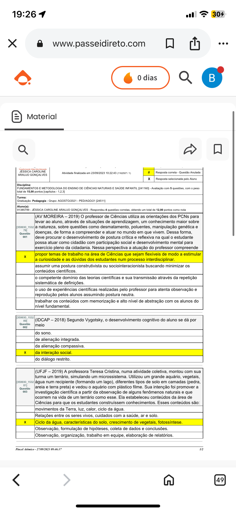 19:26 304 X www.passeidireto.com 0 dias B Material JESSICA CAROLINE Atividade finalizada em 23/09/2023 10:22:43 (1162507 # Resposta correta Questão Anulada ARAUJO GONÇALVES X Resposta selecionada pelo Aluno Disciplina: FUNDAMENTOS E METODOLOGIA DO ENSINO DE NATURAIS E SAÚDE INFANTIL [241160] Avaliação com 5 questões, com peso total de 15,00 pontos 1,2,3] Turma: Graduação: Pedagogia Grupo: AGOSTO/2021 PED/AGO/21 [24511] Aluno(a): 91385799 CAROLINE ARAUJO GONÇALVES Respondeu 4 questões corretas, obtendo um total de 12,00 pontos como nota (AV MOREIRA 2019) professor de utiliza as orientações dos PCNs para levar ao aluno, através de situações de aprendizagem, um conhecimento maior sobre 1532 a natureza, sobre questões como desmatamento, poluentes, manipulação genética e 78] Questão doenças, de forma a compreender e atuar no mundo em que vivem. Dessa forma, 001 deve procurar desenvolvimento de postura crítica e reflexiva na qual estudante possa atuar como cidadão com participação social e desenvolvimento mental para exercício pleno da cidadania. Nessa perspectiva a atuação do professor compreende propor temas de trabalho na área de Ciências que sejam flexíveis de modo a estimular a curiosidade e as dúvidas dos estudantes num processo interdisciplinar. assumir uma postura construtivista ou sociointeracionista buscando minimizar conteúdos competente domínio das teorias científicas e sua transmissão através da repetição sistemática de definições. uso de experiências científicas realizadas pelo professor para atenta observação e reprodução pelos alunos assumindo postura neutra. trabalhar os conteúdos com memorização e alto de abstração com alunos do fundamental. 1532 89] (IDCAP 2018) Segundo Vygotsky, desenvolvimento cognitivo do aluno se dá por Questão meio 002 do sono. de alienação integrada. da alienação compassiva. X da interação social. do diálogo restrito. (UFJF 2019) A professora Teresa Cristina, numa atividade coletiva, montou com sua turma um terrário, simulando um microssistema. Utilizou um grande aquário, vegetais, água num recipiente (formando um lago), diferentes tipos de solo em camadas (pedra, 81] Questão areia e terra preta) e vedou O aquário com plástico filme. Sua intenção foi promover a 003 investigação cientifica a partir da observação de alguns fenômenos naturais e que ocorrem na vida de um terrário como esse. Ela estabeleceu conteúdos da de Ciências para que estudantes conhecimentos. Esses conteúdos são: movimentos da Terra, luz, calor, ciclo da água. Relações entre seres vivos, cuidados com a saúde, ar e solo. Ciclo da água, características do solo, crescimento de vegetais, fotossintese. Observação, formulação de hipóteses, coleta de dados e conclusões. Observação, organização, trabalho em equipe, elaboração de relatórios. Pincel Atômico 27/09/2023 09:46:37 1/2 49