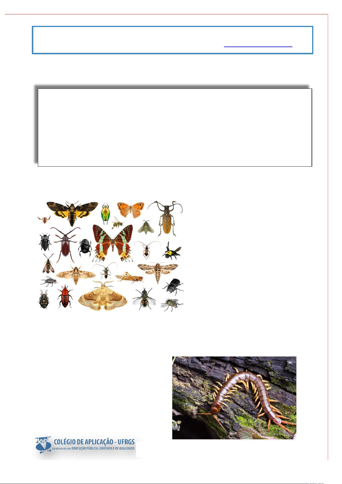 Aluno(a): Turma: AI Professora: Taís C. E. Frizzo Componente curricular: Ciências Data: E-mail da professora: tais.ciencias@gmail.com ARTRÓPODES _____________________________________________________________________ Bem-vindo à Era dos Artrópodes! Mais de 84% de todos os animais deste planeta pertencem à nossa incrível coleção de invertebrados. Evoluímos dos vermes em algum lugar no leito do mar, há mais de meio bilhão de anos. Nosso nome significa "pernas articuladas", e temos muitas delas. Muitos de nós são insetos, com seis míseros membros, mas os apressados diplópodes possuem mais de 200! Todos nós temos corpos segmentados. Diferentemente dos vertebrados, com seus membros moles envolvendo um esqueleto interno, mantemos a salvo nossas partes frágeis numa espécie de armadura chamada de exoesqueleto. Com nossas antenas, além do tato, possuímos a capacidade de sentir cheiros. Vemos o mundo de maneira diferente da sua. As aranhas, por exemplo, possuem olhos atrás de suas cabeças! Fonte: Green, Dan. Biologia: a vida como nós a conhecemos! Ed. Girassol, 2010. Vamos conhecer alguns grupos de artrópodes? Insetos: é o grupo de artrópodes com maior número de espécies conhecidas. Seu corpo é dividido em cabeça, tórax e abdome. Possuem 1 par de antenas; olhos compostos e 3 pares de patas. Dependendo da espécie, podem ter 1 ou 2 pares de asas; mas há aqueles que não as possuem, como as formigas. Além disso, têm um aparelho bucal adaptado ao tipo de alimentação. A reprodução é sexuada e o desenvolvimento pode ser direto (como nas traças) ou indireto (metamorfose). Baratas e borboletas, por exemplo, passam por metamorfose. Quilópodes: estes animais possuem o corpo achatado e 1 par de patas em cada segmento. Um exemplo deste grupo é a centopeia. Tarefa de estudos dirigidos a distância Aracnídeos: possuem corpo dividido em cefalotórax e abdômen, têm 4 pares de patas e olhos simples. Não apresentam antenas. Os aracnídeos não possuem mandíbulas, mas as estruturas denominadas quelíceras auxiliam para pender e dilacerar a presa. No abdome das aranhas estão as fiandeiras, que são estruturas associadas à produção dos fios de seda com os quais elas tecem as teias. Diplópodes: apresentam corpo cilíndrico e 2 pares de patas por segmento. Ao lado, o piolho-de-cobra, exemplo de diplópode. Crustáceos: a maioria destes animais vivem em ambientes aquáticos. Possuem corpo dividido em cefalotórax e abdômen e 5 pares de pernas. Apresentam 2 pares de antenas e 1 par de olhos compostos. Imagens disponíveis em: Insetos: Protasov AN/Shutterstock.com - ; Aracnídeos: ; Quilópodes: ; Diplópodes: ; Crustáceos: Arquivo pessoal/Fernando Mantelatto - . Acesso em 10 nov. 2020. Tarefa de estudos dirigidos a distância Adivinha quem é? _____________________________________________________________________ Observa as características indicadas em cada quadro e escreve o nome do grupo: 1. Tenho 5 pares de patas e corpo dividido em cefalotórax e abdome. Tenho antenas e vivo no mar. Meu grupo é: 2. Quando me desenvolvo, passo por grandes transformações. Este processo é chamado metamorfose. Meu grupo é: 3. Sou um animal dividido em cabeça, tórax e abdome. Gosto de visitar flores em busca de pólen. Meu grupo é: 4. Meu corpo é dividido em segmentos e tenho, em cada um deles, dois pares de patas. Meu grupo é: 5. Tenho 4 pares de patas e corpo dividido em cefalotórax e abdome. Não apresento antenas. Meu grupo é: 6. Sou comprido e achatado, e todo meu corpo é dividido em segmentos. Em cada segmento tenho 1 par de patas. Meu grupo é: Agora, sabendo a que grupo cada animal pertence, relaciona o número do grupo com a espécie que pode ser: borboleta aranha piolho-de-cobra camarão barata centopeia 1. 2. 3. 4. 5. 6. image5.png image6.png image7.jpeg image8.png image9.png image10.jpeg image11.jpeg image10.png image20.png image1.png image2.png image3.png image4.png