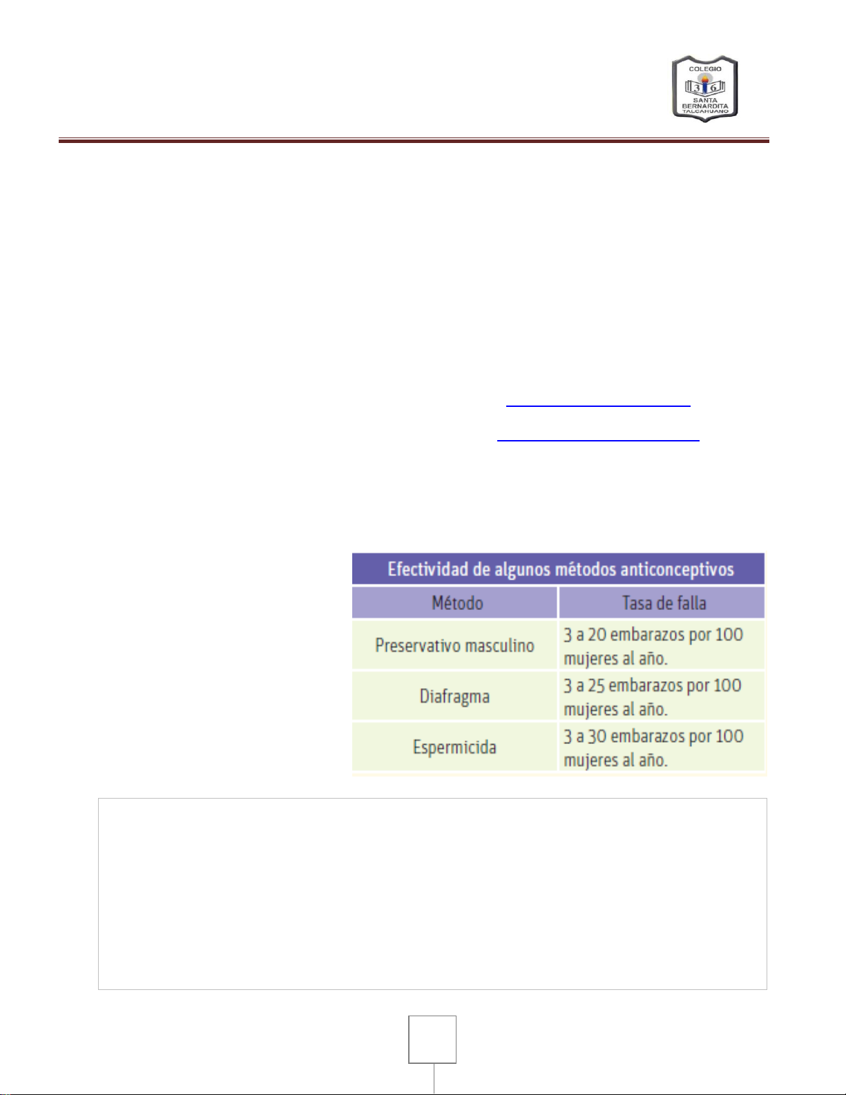 COLEGIO SANTA BERNARDITA TALCAHUANO ASIGNATURA: Ciencias Naturales PROFESORA: Alejandra Burgos – Stephanie Albornoz CURSOS: 7º A /7°B 1 Actividades de Retroalimentación: Métodos Anticonceptivos e Infecciones de Transmisión Sexual (ITS) Nombre: __________________________________________________________ Curso: 7º Consultas y dudas al siguiente correo: rburgos@cosanber.cl Consultas y dudas al siguiente correo: salbornoz@cosanber.cl Actividad Nº 1 Observe la siguiente tabla que muestra la eficacia de tres métodos de control de natalidad. ¿Cuál de los métodos de la tabla es el más efectivo para evitar embarazos? Fundamente. mailto:rburgos@cosanber.cl COLEGIO SANTA BERNARDITA TALCAHUANO ASIGNATURA: Ciencias Naturales PROFESORA: Alejandra Burgos – Stephanie Albornoz CURSOS: 7º A /7°B 2 Actividad Nº 2 – Análisis y Reflexión A continuación, encontrarán relatos sobre nueve parejas que no usaron condones correctamente. Para cada una, piense sobre qué hubiera ayudado a esa persona o pareja. Seleccione una o más “soluciones” de la siguiente lista y encierre en un círculo el número que corresponda a una de dichas soluciones. Por ejemplo, encierre en un círculo el “2” para indicar una “Mayor igualdad y poder compartido entre la muchacha y el muchacho”. (Pueden encerrar en un círculo más de un número si piensan que la pareja requiere más de una solución.) SOLUCIONES Solución 1 Información sobre el uso correcto del condón. Solución 2 Mayor igualdad y poder compartido entre la muchacha y el muchacho. Solución 3 Mejores habilidades de comunicación. Solución 4 Información sobre dónde obtener condones. Solución 5 Una idea más realista sobre el riesgo del VIH y el embarazo. Solución 6 Un lugar seguro en donde compartir sus preocupaciones sobre el desempeño sexual. SITUACIONES Pareja A: Estas dos personas jóvenes tienen relaciones sexuales y usan condones. Después de que el joven eyacula se queda inmóvil durante cinco minutos. Su pene se vuelve suave y reduce su tamaño y, cuando se mueve un poco, ve con preocupación que un poco de su semen gotea fuera del condón en la entrada de la vagina de su pareja. La pareja A necesita: 1 2 3 4 5 6 Pareja C: Estas dos personas jóvenes quieren tener relaciones sexuales. La muchacha le dice a su pareja que ella trajo unos condones, pero él le dice “De ninguna manera... ¡con esas cosas se siente pésimo!” Ella trata de insistir pero él se enoja, le dice que ella está actuando como una niña y le pregunta si realmente lo ama o no. Finalmente, ella deja de discutir y tienen relaciones sexuales sin el condón. La pareja C necesita: 1 2 3 4 5 6 COLEGIO SANTA BERNARDITA TALCAHUANO ASIGNATURA: Ciencias Naturales PROFESORA: Alejandra Burgos – Stephanie Albornoz CURSOS: 7º A /7°B 3 Pareja D: Estas dos personas desean tener relaciones sexuales y han acordado usar condones. Pero cuando llega el momento de usarlos, el joven empieza a manejar torpemente el paquete de condones y pierde su erección. Esta vez, omiten el coito sexual. Pero la siguiente vez que están juntos, él se pone ansioso por la posibilidad de perder de nuevo su erección. Él le dice a su novia que los condones arruinan el ambiente por lo que acuerdan seguir adelante y tener relaciones sexuales sin usar condón. La pareja D necesita: 1 2 3 4 5 6 Pareja G: Estas dos personas deciden tener relaciones sexuales. El joven pregunta si ellos deberían usar protección, pero ella dice que recientemente tuvo su período menstrual por lo que no puede embarazarse. La pareja G necesita: 1 2 3 4 5 6 Pareja H: Estas dos personas deciden tener relaciones sexuales. La pareja conversa acerca de usar condones para protegerse contra el VIH, pero ambos acuerdan que si estuvieran enfermos lo sabrían. Por lo tanto, tienen relaciones sexuales sin usar condón. La pareja H necesita: 1 2 3 4 5 6 Actividad Nº3 Tabla Comparativa Clasificación Métodos Anticonceptivos. Vasecto mía Pastillas Anticonceptivas Condón Masculino /Femenino Espermicida Abstinencia Periódica Origen Efectividad Reversibilidad Mecanismo COLEGIO SANTA BERNARDITA TALCAHUANO ASIGNATURA: Ciencias Naturales PROFESORA: Alejandra Burgos – Stephanie Albornoz CURSOS: 7º A /7°B 4 Actividad Nº4 Respecto del gráfico responda las siguientes preguntas. Infecciones de Trasmisión Sexual en Chile 1. ¿Cuál fue la ITS más notificada en hombres y en mujeres durante el año 2006? Investiga en qué consiste y cómo se transmite. 2. ¿Qué ITS se presenta con menor frecuencia en los hombres?, ¿y en las mujeres?