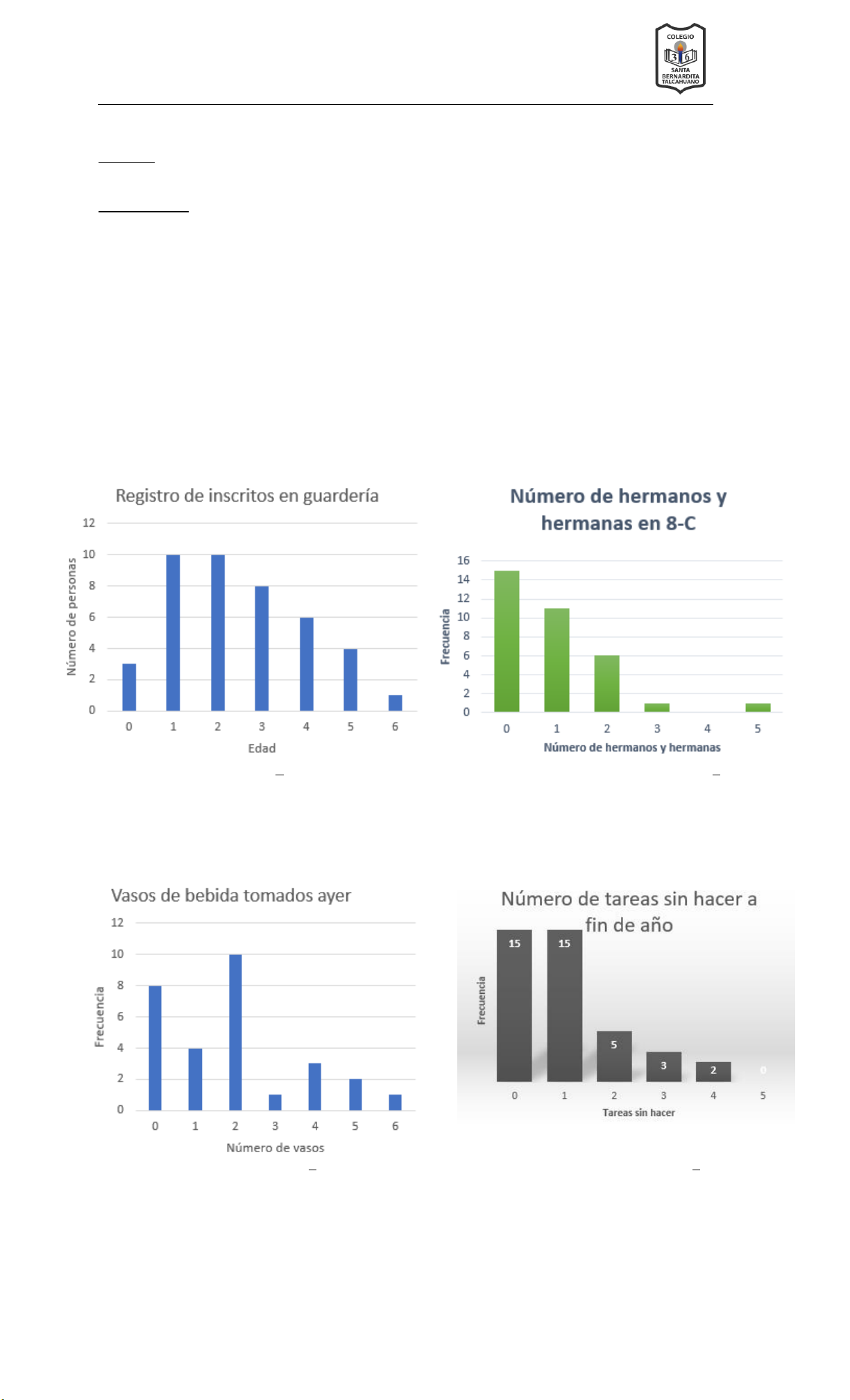 COLEGIO SANTA BERNARDITA TALCAHUANO SECTOR: MATEMÁTICA PROFSOR: JORGE ILLANES PAREJA NIVEL: NB8 – A Guía de Aprendizaje: comparación de poblaciones Objetivo: Comprender el concepto de media y de rango y utilizarlo para analizar y comparar poblaciones. Instrucciones: Complete las actividades de esta guía y realice los ejercicios que en esta aparecen. Se espera que pueda imprimir este mismo documento y completar las actividades en el espacio correspondiente. El uso de calculadora para realizar las actividades está prohibido a menos que el enunciado diga lo contrario. Sin embargo, puedes usarla para comprobar tus resultados y corregir. 1.- Comprendiendo las medidas de tendencia central. En clases estudiamos la media (promedio) como un punto de balance central de los datos, haciendo una analogía a lo que es una balanza, es decir, la media es el centro de la balanza. a) Mirando las gráficas y sin efectuar cálculos numéricos, decida si el valor de que allí se sugiere como promedio se aproxima al verdadero valor. Encierre en un círculo la letra del gráfico que corresponda con la media presentada. I) II) Edad promedio x 2,5 Media de hermanos y hermanas x 1 III) IV) Media de vasos tomados x 2,5 Promedio de tareas sin hacer x 0,5 COLEGIO SANTA BERNARDITA TALCAHUANO SECTOR: MATEMÁTICA PROFSOR: JORGE ILLANES PAREJA NIVEL: NB8 – A Comprobaremos uno de los casos mediante el cálculo, después deberás hacerlo tú. Para calcular la media a partir de un gráfico deberemos entender lo que vamos a calcular. ¿Qué está mostrando el gráfico número III? El número de vasos de bebida que tomó un grupo de personas el día de ayer. Categoría: Número de vasos de bebida Frecuencia Total de vasos tomados 0 8 0 1 4 4 2 10 10 3 1 3 4 3 12 5 2 10 6 1 6 La columna “total de vasos tomados” corresponde a lo que aporta cada categoría en la suma total de vasos Ejemplo: Cómo hay 3 personas que tomaron 4 vasos de bebida, ellos aportan un total de 12 vasos a la suma total ( 4 3 12 = ) Con estos datos podemos calcular la cantidad total de vasos de bebida que se tomaron ayer entre todas las personas y con ello, calcular un promedio La suma total de vasos tomados es de S 0 4 10 3 12 10 6 43= + + + + + + = vasos Otra pregunta que hay que responder es ¿cuántas personas son en total? Al contrario de lo que se piensa normalmente, no son ni 6 ni 7 personas (7 es el número de categorías distintas en las que se clasificaron las personas). El total de personas es n 8 4 10 1 3 2 1 29= + + + + + + = . Finalmente, para repartimos el total de vasos consumidos (43) entre todas las personas presentes (29) Un promedio de 43 x 1,5 29 = = vasos por persona. ___________________________________________________________________________ b) Con ayuda de una calculadora, realice las tablas que se encuentra en la página siguiente y calcule el promedio siguiendo el procedimiento que se describió en esta página para comprobar si los gráficos I, II y IV corresponden con la media indicada. Puede usar calculadora. ¿Estuviste acertado en tu estimación de no considerar correcto el promedio para el gráfico III? COLEGIO SANTA BERNARDITA TALCAHUANO SECTOR: MATEMÁTICA PROFSOR: JORGE ILLANES PAREJA NIVEL: NB8 – A Gráfico I Categoría: Edad Número de personas Suma de edades 0 3 3 0 0 = 1 10 10 1 10 = 2 10 10 2 20 = 3 8 8 3 24 = 4 6 6 4 24 = 5 4 4 5 20 = 6 1 1 6 6 = Sumas totales 42 104 x 2,47...= ¿Su estimación estuvo correcta? ________________________ Gráfico II Categoría: número de hermanos y hermanas Frecuencia Suma de hermanos y hermanas 0 15 0 1 11 11 2 6 12 3 1 3 4 0 4 5 1 5 6 0 0 Suma total 34 35 x 1,02...= ¿Su estimación estuvo correcta? ________________________ Gráfico IV Categoría: Número de tareas sin hacer Frecuencia Suma de tareas 0 15 0 1 15 15 2 5 10 3 3 9 4 2 8 5 0 0 6 0 0 Suma total 40 42 x 1,05= ¿Su estimación estuvo correcta? ___________________________ COLEGIO SANTA BERNARDITA TALCAHUANO SECTOR: MATEMÁTICA PROFSOR: JORGE ILLANES PAREJA NIVEL: NB8 – A Lo que has realizado anteriormente se llama cálculo de media para datos agrupados. Es un proceso rápido para calcular medias (promedios) cuando muchos datos se repiten. Ilustrémoslo con un ejemplo: Se tiene la secuencia de datos: 3, 4, 3, 5, 7, 6, 8, 3, 5, 4, 3, 5, 3, 4, 7, 8, 9, 4, 6, 2, 4, 3, 4. En vez de estar sumando los datos uno por uno, se podrían contar el número de 3, número de 4 y así, para efectuar la multiplicación y llegar al cálculo final más rápido 3 6 18 = , se multiplica por 6 porque el 3 se repite seis veces. 4 6 24 = , se multiplica por 6 porque el 4 se repite seis veces. Para definir una manera formal de expresar la media para datos agrupados, emplearemos la siguiente fórmula ( )i ix f x n = ¿Qué significa lo anterior? x es el promedio, significa realizar la operación que está dentro del paréntesis y sumar esos resultados todas las veces que sea necesario. ix se refiere al dato y if a la frecuencia que se repite ese dato 2 1 3 6 4 6 5 3 7 2 8 2 9 1 98 x 4,2 23 23 + + + + + + = = 2.- Ejercitación de cálculo de media. a) Calcule la media de las edades de las personas inscritas en el taller de ajedrez, en años. 12 12 13 13 16 14 15 17− − − − − − − x 14= b) Los siguientes datos corresponden a los puntajes obtenidos en una prueba de matemática en un taller de reforzamiento. Calcule el puntaje promedio 20 14 8 12 13 17 20 10 12 10− − − − − − − − − x 13,6= c) Los siguientes datos muestran la duración real de un grupo de titulados y tituladas de la carrera de Agronomía. ¿cuál es el tiempo promedio de duración de carrera de este grupo de personas? (puede usar calculadora, aproxime el resultado final a 1 decimal). Semestres Estudiantes Suma parcial de semestres 9 1 9 10 1 10 11 3 33 12 2 24 13 1 13 14 3 42 15 17 255 16 18 288 17 15 255 Suma total 61 929 x 929 61 15,22...= = LE C TU R A O P C IO N A L COLEGIO SANTA BERNARDITA TALCAHUANO SECTOR: MATEMÁTICA PROFSOR: JORGE IL
