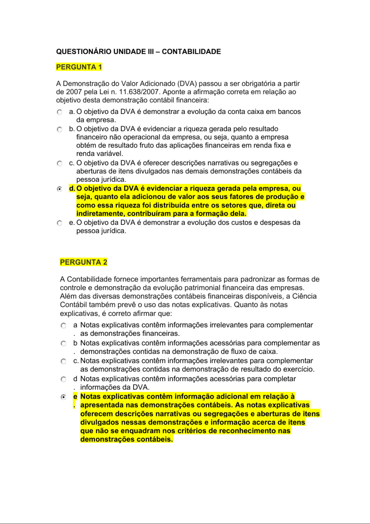QUESTIONÁRIO UNIDADE III CONTABILIDADE PERGUNTA 1 A Demonstração do Valor Adicionado (DVA) passou a ser obrigatória a partir de 2007 pela Lei n. 11.638/2007. Aponte a afirmação correta em relação ao objetivo desta demonstração contábil financeira: a. objetivo da DVA é demonstrar a evolução da conta caixa em bancos da empresa. b. objetivo da DVA é evidenciar a riqueza gerada pelo resultado financeiro não operacional da empresa, ou seja, quanto a empresa obtém de resultado fruto das aplicações financeiras em renda fixa e renda variável. C. objetivo da DVA é oferecer descrições narrativas ou segregações e aberturas de itens divulgados nas demais demonstrações contábeis da pessoa jurídica. d. objetivo da DVA é evidenciar a riqueza gerada pela empresa, ou seja, quanto ela adicionou de valor aos seus fatores de produção e como essa riqueza foi distribuída entre os setores que, direta ou indiretamente, contribuíram para a formação dela. e. objetivo da DVA é demonstrar a evolução dos custos e despesas da pessoa jurídica. PERGUNTA 2 A Contabilidade fornece importantes ferramentais para padronizar as formas de controle e demonstração da evolução patrimonial financeira das empresas. Além das diversas demonstrações contábeis financeiras disponíveis, a Ciência Contábil também prevê uso das notas explicativas. Quanto às notas explicativas, é correto afirmar que: a Notas explicativas contêm informações irrelevantes para complementar as demonstrações financeiras. b Notas explicativas contêm informações acessórias para complementar as demonstrações contidas na demonstração de fluxo de caixa. C. Notas explicativas contêm informações irrelevantes para complementar as demonstrações contidas na demonstração de resultado do exercício. d Notas explicativas contêm informações acessórias para completar informações da DVA. e Notas explicativas contêm informação adicional em relação à apresentada nas demonstrações contábeis. As notas explicativas oferecem descrições narrativas ou segregações e aberturas de itens divulgados nessas demonstrações e informação acerca de itens que não se enquadram nos critérios de reconhecimento nas demonstrações contábeis.PERGUNTA 3 Partindo da hipótese que uma determinada empresa com fins lucrativos possua R$ 310.000,00 em ativos e R$ 90.000,00 em passivos, suponha que os gestores desta empresa decidam pagar, nesse momento, todas as suas obrigações e distribua restante igualmente entre os três sócios. Nesse contexto, o valor referente ao patrimônio líquido da empresa será de: a. R$ 220.000,00. b. C. R$ 240.000,00. d.R$ 180.000,00. e.R$ 210.000,00. PERGUNTA 4 A empresa Tecnoplus Participações possui um patrimônio líquido de R$ 100.000,00; um ativo total de R$ 450.000,00; um passivo não circulante de R$ 50.000,00. Aponte a afirmação correta que evidencia total do passivo circulante da empresa: a. R$ 310.000,00. b. R$ 300.000,00. d.R$ 380.000,00. e. R$ 290.000,00 PERGUNTA 5 A empresa Belinha Ltda. possuía, em 2021, um passivo total de R$ 500.000,00, um ativo não circulante de R$ 400.000,00, aponte a afirmação correta que demonstra valor correspondente ao ativo circulante total da empresa em 2021: a. R$ 150.000,00. b. R$ 100.000,00. C. R$ 200.000,00. e. R$ 80.000,00.PERGUNTA 6 grupo empresarial Brasil apresentou uma receita bruta de R$ 950.550,00 em 2020 e R$ 834.000,00 em 2021. Sabendo que os impostos sobre vendas foram de 18%, aponte a alternativa correta que demonstra, respectivamente, o valor da receita líquida registrada em 2021 e a variação percentual da receita bruta registrada em 2021 em relação ao ano de 2020. a. R$ 683.880,00 e variação negativa de aproximadamente 10,26%. b. R$ 683.880,00 e variação positiva de aproximadamente 12,26%. R$ 683.880,00 e variação negativa de aproximadamente 12,26%. d. R$ 683.880,00 e variação negativa de aproximadamente 8,25%. e. R$ 779.451,00 e variação negativa de aproximadamente 12,26%. PERGUNTA 7 A empresa Valeu Participações apresentou um lucro líquido de R$ 98.400,00 em 2019 e R$ 134.500,00 em 2020. Utilizando-se dos conceitos relacionados ao cálculo de variação percentual, e, neste caso, utilizado para comparar períodos temporais distintos, aponte a afirmação que representa a oscilação percentual no lucro dessa empresa: a. lucro registrado em 2020 representa uma queda de aproximadamente 36,68% na comparação com o lucro registrado em 2019. b. lucro registrado em 2020 representa uma alta de aproximadamente 3,68% na comparação com lucro registrado em 2019. C. lucro registrado em 2020 representa uma alta de aproximadamente 0,3668% na comparação com o lucro registrado em 2019. d. lucro registrado em 2020 representa uma alta de aproximadamente 36,68% na comparação com lucro registrado em 2019. e. lucro registrado em 2020 representa uma alta de aproximadamente 26,68% na comparação com o lucro registrado em 2019. PERGUNTA 8 Entre os principais conceitos de Contabilidade apresentados nas unidades I, e III, é correto afirmar que: a Bens intangíveis não devem ser considerados como um patrimônio da empresa. b A aquisição de uma máquina é considerada como uma despesa para a empresa. Podemos considerar como funções da Contabilidade: registrar, organizar e demonstrar informações; d Terceiros em especial são: fornecedores, bancos, funcionários, governos. e Terceiros em geral são: donos da empresa e/ou acionistas.PERGUNTA 9 A Contabilidade é a ciência que estuda, interpreta e registra os fenômenos que afetam o patrimônio de uma organização empresarial. Quanto às principais características da Ciência Contábil, é incorreto afirmar que: a. fluxo de caixa é uma demonstração contábil em regime de caixa. b. balanço patrimonial é uma demonstração contábil em regime de caixa. C. Segundo a equação patrimonial: ATIVO = PASSIVO + PATRIMÔNIO LÍQUIDO. d. Segundo a equação pa