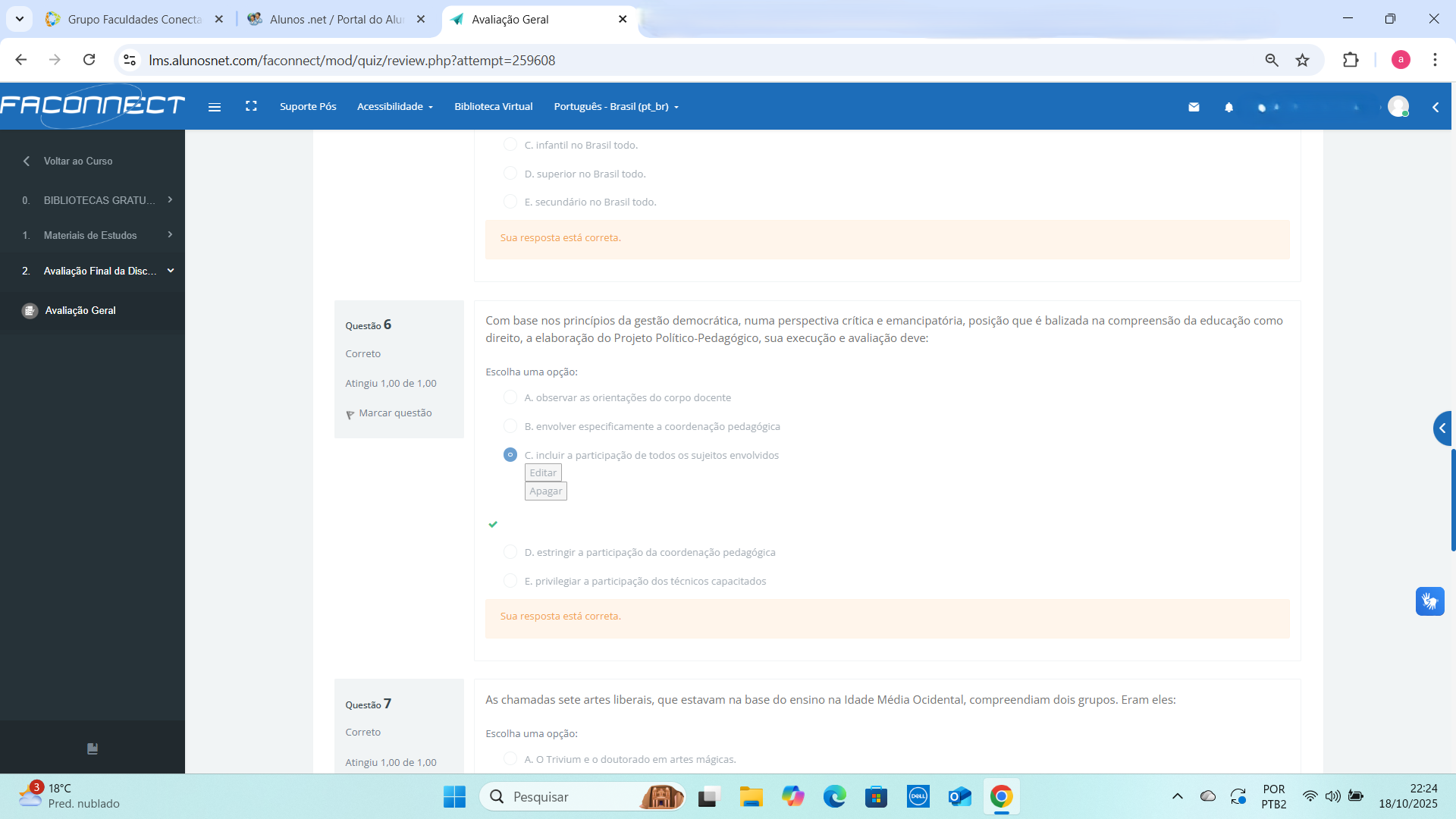 Grupo Faculdades Conecta Alunos .net / Portal do Alu Avaliação Geral X a : FACONNECT Suporte Pós Acessibilidade Biblioteca Virtual Português Brasil (pt_br) C. infantil no Brasil todo. Voltar ao Curso D. superior no Brasil todo. 0. BIBLIOTECAS GRATU. > E. secundário no Brasil todo. 1. Materiais de Estudos > Sua resposta está correta. 2. Avaliação Final da Disc. Avaliação Geral Questão 6 Com base nos princípios da gestão democrática, numa perspectiva crítica e emancipatória, posição que é balizada na compreensão da educação como direito, a elaboração do Projeto Político-Pedagógico, sua execução e avaliação deve: Correto Escolha uma opção: Atingiu 1,00 de 1,00 A. observar as orientações do corpo docente Marcar questão B. envolver especificamente a coordenação pedagógica C. incluir a participação de todos os sujeitos envolvidos Editar Apagar D. estringir a participação da coordenação pedagógica E. privilegiar a participação dos técnicos capacitados Sua resposta está correta. Questão 7 As chamadas sete artes liberais, que estavam na base do ensino na Idade Média Ocidental, compreendiam dois grupos. Eram eles: Correto Escolha uma opção: Atingiu 1,00 de 1,00 A. Trivium e 0 doutorado em artes mágicas. 3 18°C POR 22:24 Pesquisar Pred. nublado PTB2 18/10/2025