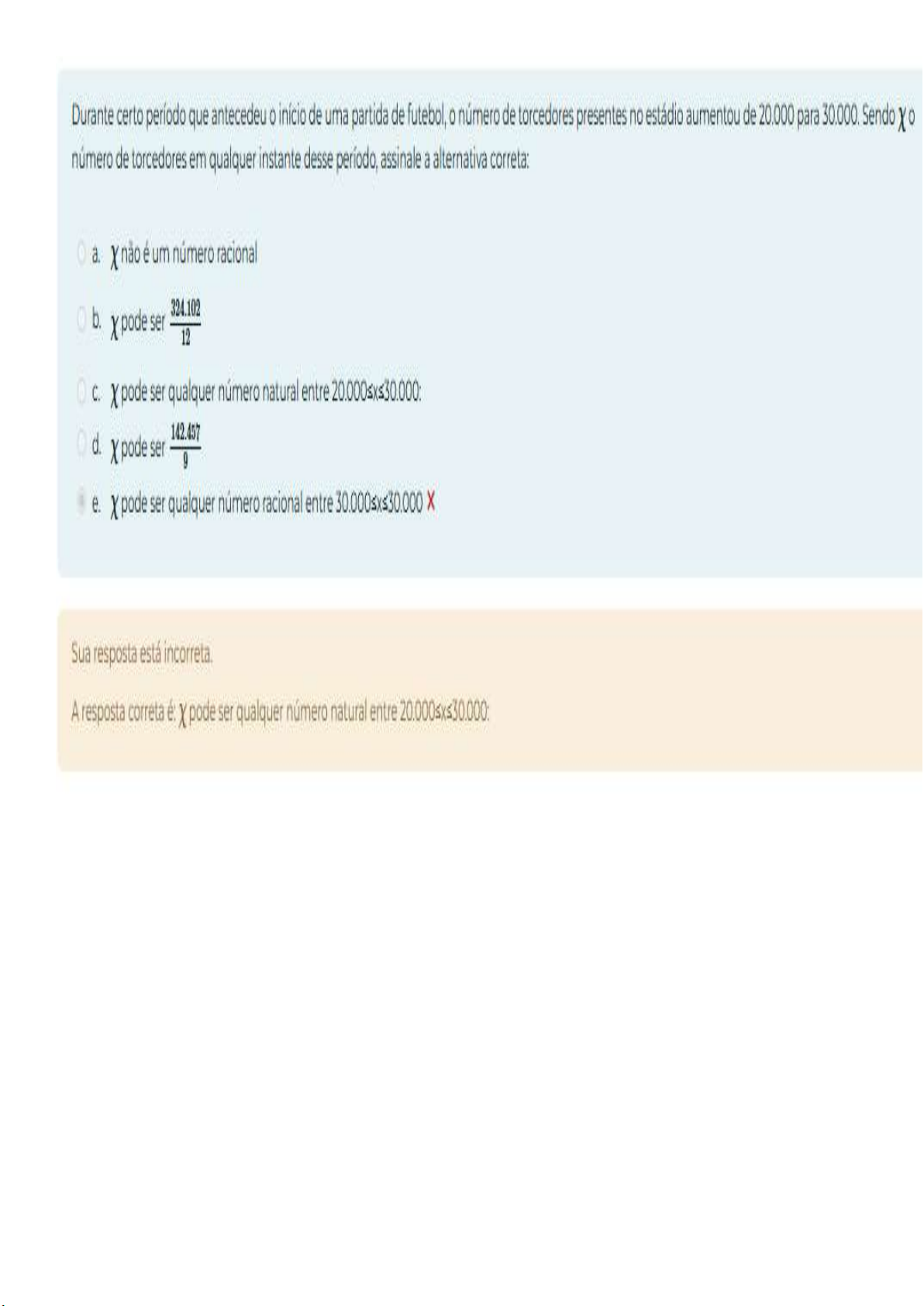 Durante certo período que antecedeu início de uma partida de futebol, número de torcedores presentes no estádio aumentou de 20.000 para 30.000. Sendo número de torcedores em qualquer instante desse período, assinale a alternativa correta: a. é um número racional b. pode ser 324.102 12 C. pode ser qualquer número natural entre d. pode ser 142.457 9 e. pode ser qualquer número racional entre X Sua resposta está incorreta. A resposta correta é: X pode ser qualquer número natural entre