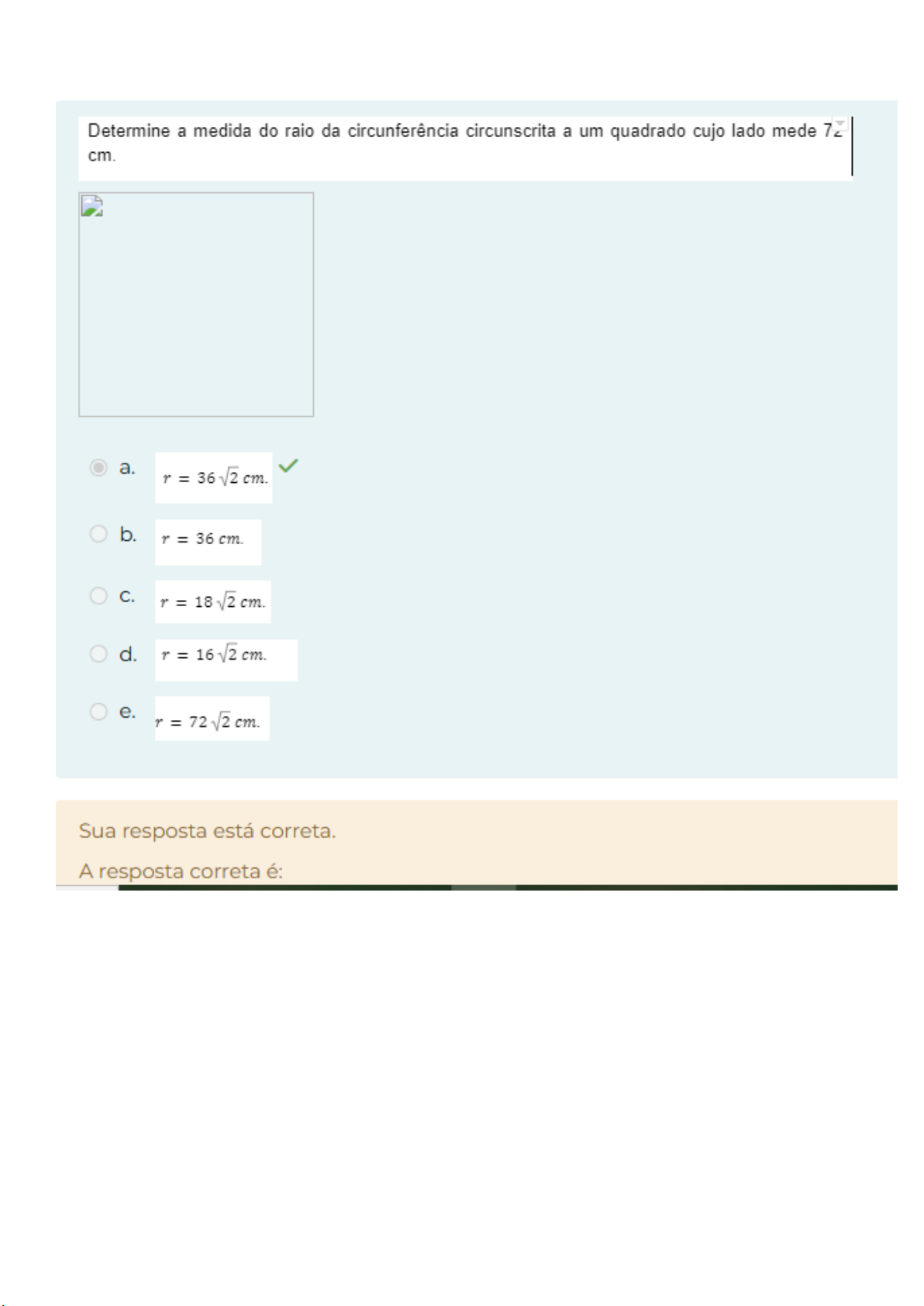 Determine a medida do raio da circunferência circunscrita a um quadrado cujo lado mede cm. a. = 36 cm. b. = 36 cm. C. = 18 cm. d. e. = 72 cm. Sua resposta está correta. A resposta correta é: