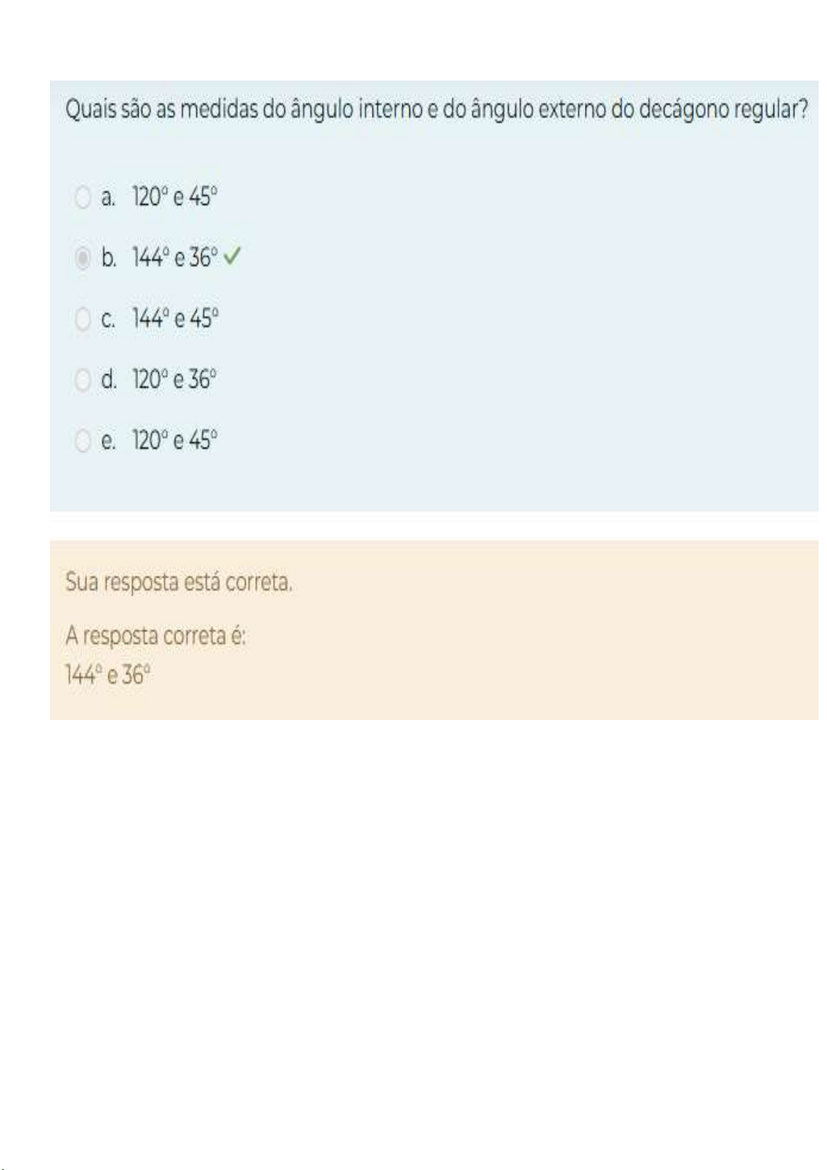 Quais são as medidas do ângulo interno e do ângulo externo do decágono regular? a. 120° e 45° b. 144° e 36° C. d. 120° e 36° e. 120° e 45° Sua resposta está correta. A resposta correta é: 144° e 36°