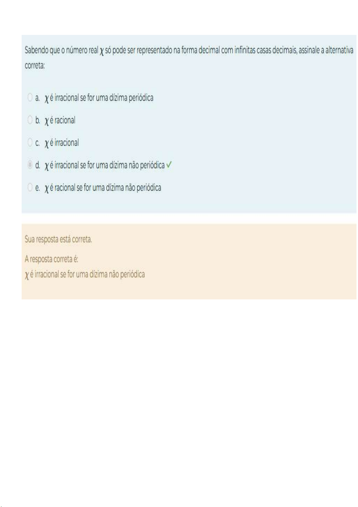 Sabendo que 0 número real só pode ser representado na forma decimal com infinitas casas decimais, assinale a alternativa correta: a. irracional se for uma periódica b. xé racional C. é irracional d. irracional se for uma não periódica e. racional se for uma dízima não periódica Sua resposta está correta. A resposta correta é: é irracional se for uma não periódica