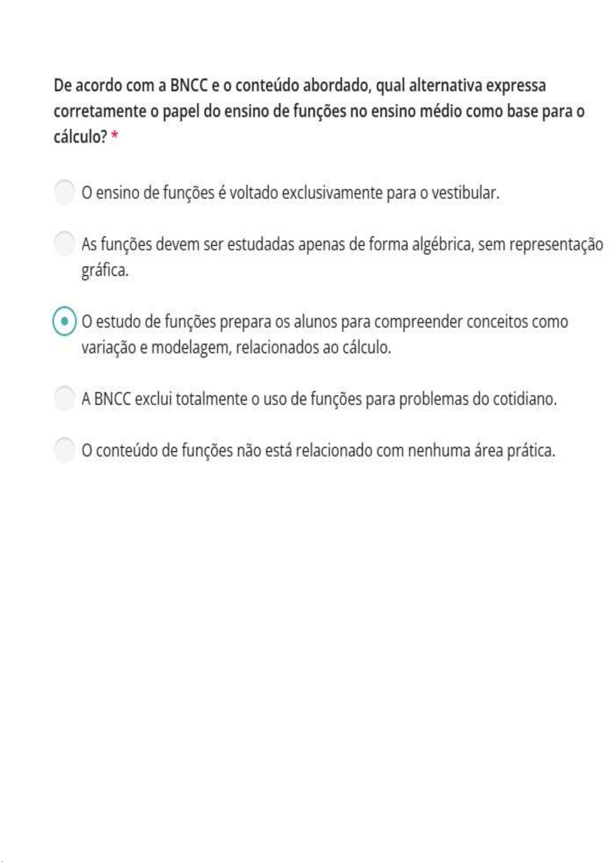 De acordo com a BNCC e o conteúdo abordado, qual alternativa expressa corretamente o papel do ensino de funcóes no ensino médio como base para o cálculo? * 0 ensino de funções é voltado exclusivamente para o vestibular. As funcóes devem ser estudadas apenas de forma algébrica, sem representacáo gráfica. @ O estudo de funções prepara os alunos para compreender conceitos como variacáo e modelagem, relacionados ao calculo. A BNCC exclui totalmente o uso de funcóes para problemas do cotidiano. O conteúdo de funcóes náo está relacionado com nenhuma área prática.