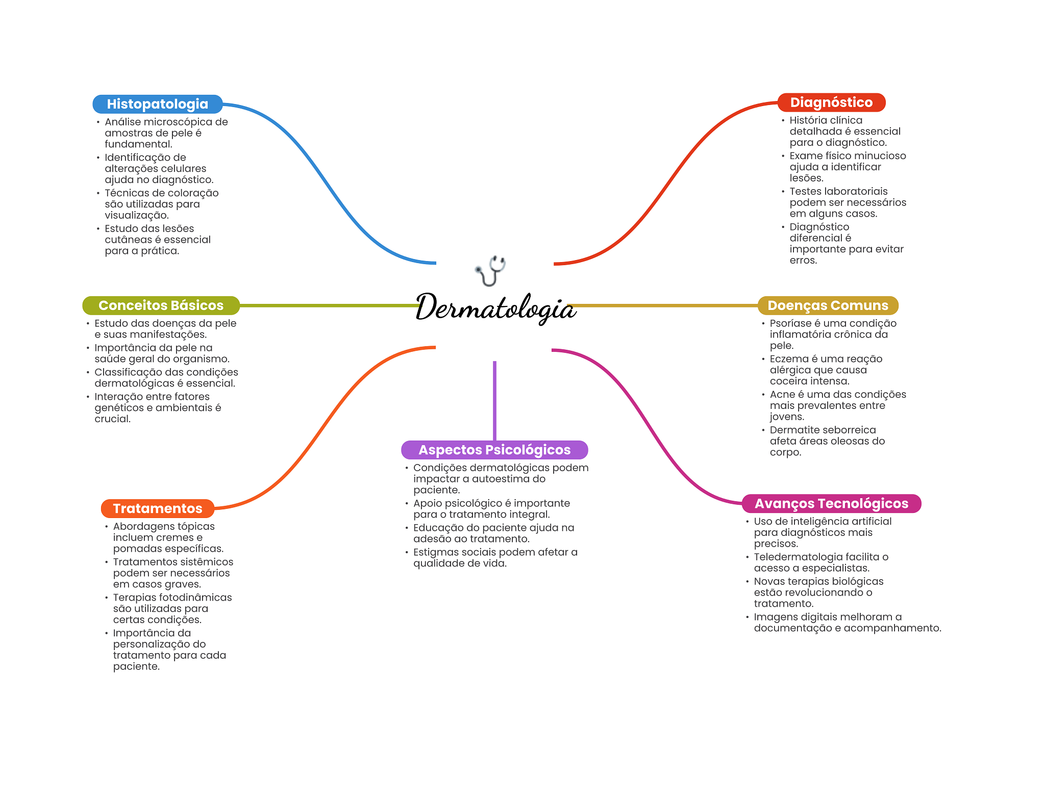 Histopatologia Diagnóstico Análise microscópica de História clínica amostras de pele é detalhada é essencial fundamental. para diagnóstico. Identificação de Exame físico minucioso alterações celulares ajuda a identificar ajuda no diagnóstico. lesões. Técnicas de coloração Testes laboratoriais são utilizadas para podem ser necessários visualização. em alguns casos. Estudo das lesões Diagnóstico cutâneas é essencial diferencial é para a prática. importante para evitar erros. Conceitos Básicos Dermatologia Doenças Comuns Estudo das doenças da pele Psoríase é uma condição e suas manifestações. inflamatória crônica da Importância da pele na pele. saúde geral do organismo. Eczema é uma reação Classificação das condições alérgica que causa dermatológicas é essencial. coceira intensa. Interação entre fatores Acne é uma das condições genéticos e ambientais é mais prevalentes entre crucial. jovens. Dermatite seborreica afeta áreas oleosas do Aspectos Psicológicos corpo. Condições dermatológicas podem impactar a autoestima do paciente. Tratamentos Apoio psicológico é importante Avanços Tecnológicos para tratamento integral. Abordagens tópicas Uso de inteligência artificial Educação do paciente ajuda na incluem cremes e adesão ao tratamento. para diagnósticos mais pomadas específicas. precisos. Estigmas sociais podem afetar a Tratamentos sistêmicos Teledermatologia facilita O qualidade de vida. podem ser necessários acesso a especialistas. em casos graves. Novas terapias biológicas estão revolucionando O Terapias fotodinâmicas tratamento. são utilizadas para certas condições. Imagens digitais melhoram a Importância da documentação e acompanhamento. personalização do tratamento para cada paciente.