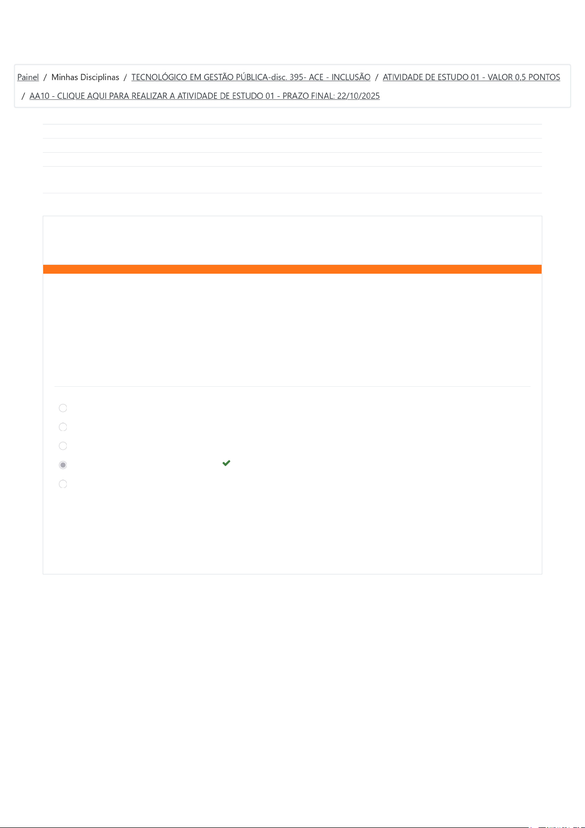 Iniciado em segunda, 20 out 2025, 13:28 Estado Finalizada Concluída em segunda, 20 out 2025, 13:33 Tempo empregado 4 minutos 49 segundos Avaliar 0,40 de um máximo de 0,50(80%) Questão 1 Correto Atingiu 0,05 de 0,05 As políticas públicas voltadas para pessoas com deficiência são essenciais para garantir a inclusão, igualdade de oportunidades e acesso a direitos básicos. Essas políticas têm como objetivo superar as barreiras sociais, culturais e econômicas que colocam as pessoas com deficiência em desvantagem frente à sociedade. Uma das principais legislações que fundamentam essas políticas é a Constituição Federal do Brasil de 1988, que estabelece os princípios fundamentais da educação no país e garante a igualdade de direitos e a inclusão social. Além disso, a Lei de Diretrizes e Bases da Educação Nacional (Lei n.º 9.394/96) prevê a oferta de serviços educacionais inclusivos e especializados, assegurando o direito à educação para todos. Qual é o objetivo das políticas públicas mencionadas no texto? a. Isentar impostos para pessoas com deficiência. b. Garantir benefícios assistenciais. c. Estabelecer moradias inclusivas. d. Promover a inclusão social e cultural. e. Proporcionar acesso prioritário a eventos esportivos. Sua resposta está correta. A resposta correta é: Promover a inclusão social e cultural. AA10 - CLIQUE AQUI PARA REALIZAR A ATIVIDADE DE E... https://www.eadunifatecie.com.br/mod/quiz/review.php?attempt=192... 1 of 6 22/11/2025, 21:52 Questão 2 Incorreto Atingiu 0,00 de 0,05 Questão 3 Correto Atingiu 0,05 de 0,05 Somente no século XIX, depois de muita incivilidade no tratamento de indivíduos caracterizados como deficientes, pois estes eram retirados do convívio social e levados a depósitos em navios, Philippe Pinel sugeriu em sua teoria uma conceitualização da loucura, como uma doença mental que em seguida seria chamada de deficiência mental. Qual foi o papel de Philippe Pinel no tratamento de pessoas com deficiências intelectuais? a. Ele contribuiu para a incivilidade no tratamento das pessoas com deficiências intelectuais. b. Ele defendeu a ideia de retirar os indivíduos com deficiências do convívio social e levá-los a depósitos em navios. c. Ele propôs uma conceitualização da loucura como uma doença mental, denominada posteriormente como deficiência mental. d. Ele promoveu um desencarceramento e proporcionou espaços clínicos para o tratamento adequado das pessoas com deficiências intelectuais. e. Ele fundou os manicômios, proporcionando um tratamento adequado para as deficiências intelectuais. Sua resposta está incorreta. A resposta correta é: Ele promoveu um desencarceramento e proporcionou espaços clínicos para o tratamento adequado das pessoas com deficiências intelectuais. A década de 1980 marcou um momento crucial para as pessoas com deficiência, especialmente no que diz respeito ao desenvolvimento de considerações relacionadas à sua educação. Este período representou um marco inicial para a efetivação dos direitos humanos das pessoas com deficiência. Qual foi o marco crucial para as pessoas com deficiência em relação à sua educação? a. A promoção da interação das pessoas com deficiência com a sociedade. b. A conscientização das pessoas com deficiência sobre si mesmas e suas potencialidades. c. A criação de classes especiais dentro das escolas regulares. d. O estabelecimento de clínicas e instituições para assistência às pessoas com deficiência. e. A designação do ano de 1981 como o Ano Internacional da Pessoa Deficiente. Sua resposta está correta. A resposta correta é: A designação do ano de 1981 como o Ano Internacional da Pessoa Deficiente. AA10 - CLIQUE AQUI PARA REALIZAR A ATIVIDADE DE E... https://www.eadunifatecie.com.br/mod/quiz/review.php?attempt=192... 2 of 6 22/11/2025, 21:52 Questão 4 Incorreto Atingiu 0,00 de 0,05 Questão 5 Correto Atingiu 0,05 de 0,05 De acordo com o artigo 227 da Constituição Federal de 1988, que trata dos direitos das crianças e adolescentes, em especial os portadores de deficiência, qual é o dever do Estado no que diz respeito à promoção de medidas de inclusão e proteção? a. Garantir o direito à vida e à saúde. b. Assegurar a convivência familiar e comunitária. c. Criar programas de prevenção e atendimento especializado. d. Oferecer acesso aos bens e serviços coletivos. e. Garantir a educação inclusiva e de qualidade para crianças e adolescentes portadores de deficiência. Sua resposta está incorreta. A resposta correta é: Criar programas de prevenção e atendimento especializado. O artigo 208 da Constituição Federal de 1988 estabelece o direito à educação como um direito de todos, garantindo igualdade de condições para o acesso e permanência na escola. Esse direito é estendido também aos portadores de deficiência, assegurando-lhes atendimento educacional especializado. De acordo com o artigo 208 da Constituição Federal de 1988, qual é o direito garantido aos portadores de deficiência? a. Oportunidade de acesso ao trabalho. b. Acesso a políticas de assistência social e benefícios socioeconômicos. c. Atendimento educacional especializado. d. Inclusão na rede regular de ensino. e. Acesso à pesquisa e criação artística. Sua resposta está correta. A resposta correta é: Atendimento educacional especializado. AA10 - CLIQUE AQUI PARA REALIZAR A ATIVIDADE DE E... https://www.eadunifatecie.com.br/mod/quiz/review.php?attempt=192... 3 of 6 22/11/2025, 21:52 Questão 6 Correto Atingiu 0,05 de 0,05 Questão 7 Correto Atingiu 0,05 de 0,05 Com base na pesquisa realizada por Lopes et al. (2018), com a temática de Inclusão e representatividade das pessoas com deficiência, que aborda de forma abrangente o cenário da deficiência no contexto mundial, levando em consideração dados demográficos e estatísticos, qual é a estimativa percentual apresentada pelos autores em relação à