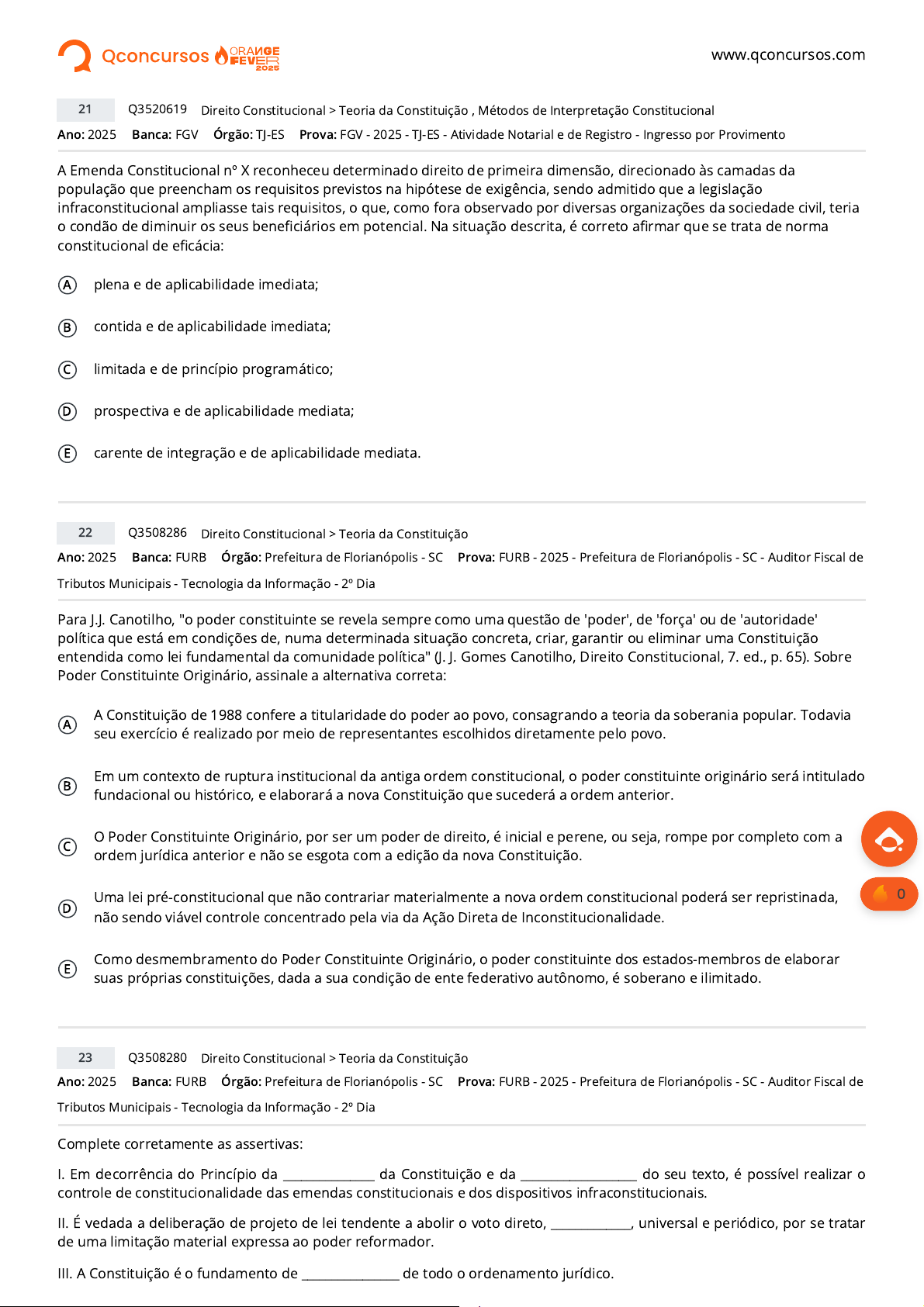 www.qconcursos.com Ano: 2025 Banca: FGV Órgão: TJ-ES A Emenda Constitucional nº X reconheceu determinado direito de primeira dimensão, direcionado às camadas da população que preencham os requisitos previstos na hipótese de exigência, sendo admitido que a legislação infraconstitucional ampliasse tais requisitos, o que, como fora observado por diversas organizações da sociedade civil, teria o condão de diminuir os seus beneficiários em potencial. Na situação descrita, é correto afirmar que se trata de norma constitucional de eficácia: A plena e de aplicabilidade imediata; B contida e de aplicabilidade imediata; C limitada e de princípio programático; D prospectiva e de aplicabilidade mediata; E carente de integração e de aplicabilidade mediata. Ano: 2025 Banca: FURB Órgão: Prefeitura de Florianópolis - SC Para J.J. Canotilho, "o poder constituinte se revela sempre como uma questão de 'poder', de 'força' ou de 'autoridade' política que está em condições de, numa determinada situação concreta, criar, garantir ou eliminar uma Constituição entendida como lei fundamental da comunidade política" (J. J. Gomes Canotilho, Direito Constitucional, 7. ed., p. 65). Sobre Poder Constituinte Originário, assinale a alternativa correta: A A Constituição de 1988 confere a titularidade do poder ao povo, consagrando a teoria da soberania popular. Todavia seu exercício é realizado por meio de representantes escolhidos diretamente pelo povo. B Em um contexto de ruptura institucional da antiga ordem constitucional, o poder constituinte originário será intitulado fundacional ou histórico, e elaborará a nova Constituição que sucederá a ordem anterior. C O Poder Constituinte Originário, por ser um poder de direito, é inicial e perene, ou seja, rompe por completo com a ordem jurídica anterior e não se esgota com a edição da nova Constituição. D Uma lei pré-constitucional que não contrariar materialmente a nova ordem constitucional poderá ser repristinada, não sendo viável controle concentrado pela via da Ação Direta de Inconstitucionalidade. E Como desmembramento do Poder Constituinte Originário, o poder constituinte dos estados-membros de elaborar suas próprias constituições, dada a sua condição de ente federativo autônomo, é soberano e ilimitado. Ano: 2025 Banca: FURB Órgão: Prefeitura de Florianópolis - SC Complete corretamente as assertivas: I. Em decorrência do Princípio da _______________ da Constituição e da ___________________ do seu texto, é possível realizar o controle de constitucionalidade das emendas constitucionais e dos dispositivos infraconstitucionais. II. É vedada a deliberação de projeto de lei tendente a abolir o voto direto, _____________, universal e periódico, por se tratar de uma limitação material expressa ao poder reformador. III. A Constituição é o fundamento de ________________ de todo o ordenamento jurídico. 21 Q3520619 >Direito Constitucional Teoria da Constituição , Métodos de Interpretação Constitucional Prova: FGV - 2025 - TJ-ES - Atividade Notarial e de Registro - Ingresso por Provimento 22 Q3508286 >Direito Constitucional Teoria da Constituição Prova: FURB - 2025 - Prefeitura de Florianópolis - SC - Auditor Fiscal de Tributos Municipais - Tecnologia da Informação - 2º Dia 23 Q3508280 >Direito Constitucional Teoria da Constituição Prova: FURB - 2025 - Prefeitura de Florianópolis - SC - Auditor Fiscal de Tributos Municipais - Tecnologia da Informação - 2º Dia 0 https://www.qconcursos.com/ https://www.qconcursos.com/questoes-de-concursos/bancas/fgv https://www.qconcursos.com/questoes-de-concursos/institutos/tj-es https://www.qconcursos.com/questoes-de-concursos/bancas/furb https://www.qconcursos.com/questoes-de-concursos/institutos/prefeitura-de-florianopolis-sc https://www.qconcursos.com/questoes-de-concursos/bancas/furb https://www.qconcursos.com/questoes-de-concursos/institutos/prefeitura-de-florianopolis-sc https://www.qconcursos.com/questoes-de-concursos/questoes/4a098c0c-6c https://www.qconcursos.com/questoes-de-concursos/disciplinas/direito-direito-constitucional https://www.qconcursos.com/questoes-de-concursos/disciplinas/direito-direito-constitucional/teoria-da-constituicao https://www.qconcursos.com/questoes-de-concursos/disciplinas/direito-direito-constitucional/metodos-de-interpretacao-constitucional https://www.qconcursos.com/questoes-de-concursos/provas/fgv-2025-tj-es-atividade-notarial-e-de-registro-ingresso-por-provimento https://www.qconcursos.com/questoes-de-concursos/questoes/e5e01442-67 https://www.qconcursos.com/questoes-de-concursos/disciplinas/direito-direito-constitucional https://www.qconcursos.com/questoes-de-concursos/disciplinas/direito-direito-constitucional/teoria-da-constituicao https://www.qconcursos.com/questoes-de-concursos/provas/furb-2025-prefeitura-de-florianopolis-sc-auditor-fiscal-de-tributos-municipais-tecnologia-da-informacao-2-dia https://www.qconcursos.com/questoes-de-concursos/provas/furb-2025-prefeitura-de-florianopolis-sc-auditor-fiscal-de-tributos-municipais-tecnologia-da-informacao-2-dia https://www.qconcursos.com/questoes-de-concursos/questoes/e5d0091c-67 https://www.qconcursos.com/questoes-de-concursos/disciplinas/direito-direito-constitucional https://www.qconcursos.com/questoes-de-concursos/disciplinas/direito-direito-constitucional/teoria-da-constituicao https://www.qconcursos.com/questoes-de-concursos/provas/furb-2025-prefeitura-de-florianopolis-sc-auditor-fiscal-de-tributos-municipais-tecnologia-da-informacao-2-dia https://www.qconcursos.com/questoes-de-concursos/provas/furb-2025-prefeitura-de-florianopolis-sc-auditor-fiscal-de-tributos-municipais-tecnologia-da-informacao-2-dia IV. Para concepção de Constituição desenvolvida por Kelsen, no sentido ___________________, a Constituição é a norma fundamental hipotética, enquanto no sentido ____________________, a Constituição é a norma positiva suprema. Assinale a al