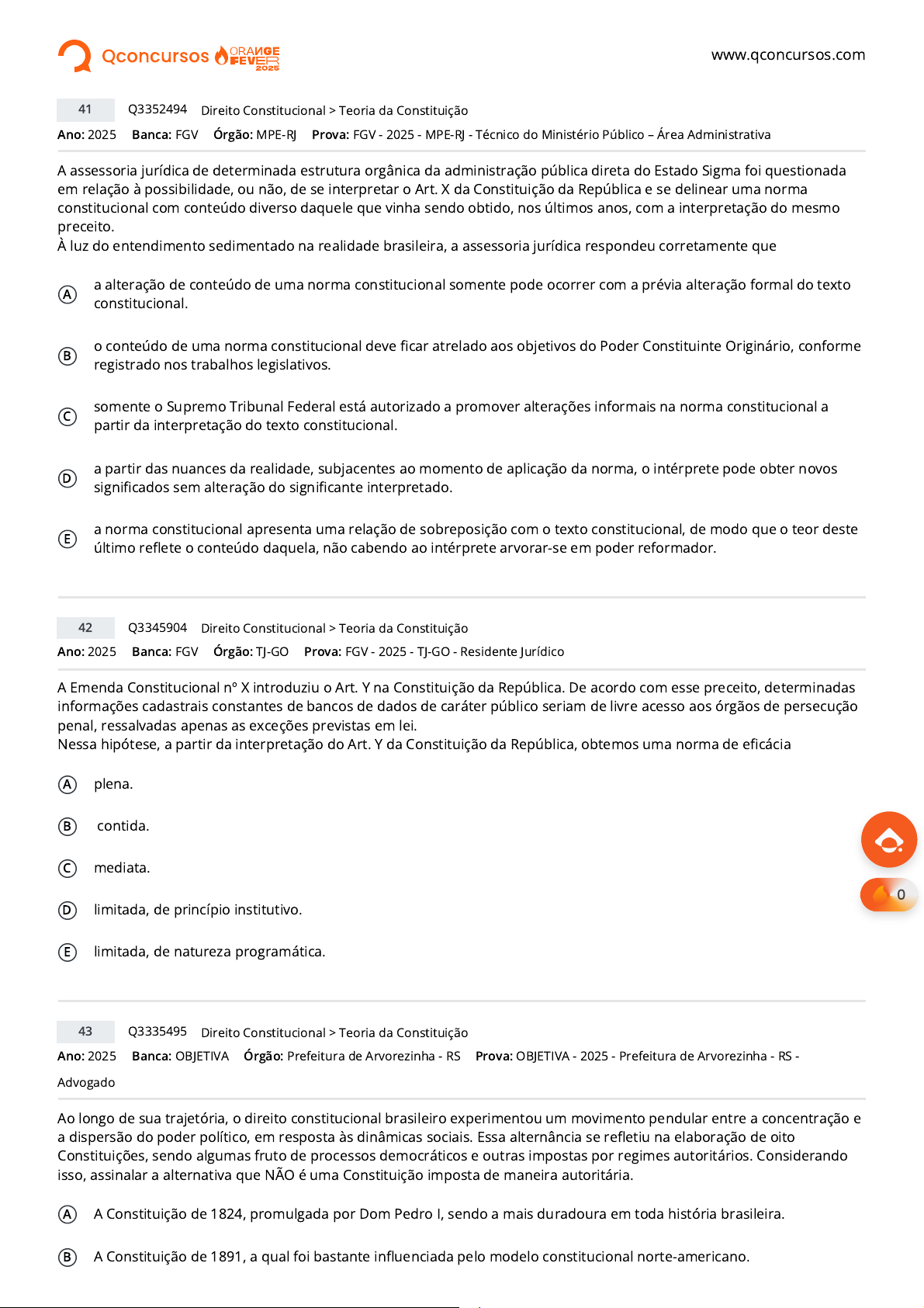 www.qconcursos.com Ano: 2025 Banca: FGV Órgão: MPE-RJ A assessoria jurídica de determinada estrutura orgânica da administração pública direta do Estado Sigma foi questionada em relação à possibilidade, ou não, de se interpretar o Art. X da Constituição da República e se delinear uma norma constitucional com conteúdo diverso daquele que vinha sendo obtido, nos últimos anos, com a interpretação do mesmo preceito. À luz do entendimento sedimentado na realidade brasileira, a assessoria jurídica respondeu corretamente que A a alteração de conteúdo de uma norma constitucional somente pode ocorrer com a prévia alteração formal do texto constitucional. B o conteúdo de uma norma constitucional deve ficar atrelado aos objetivos do Poder Constituinte Originário, conforme registrado nos trabalhos legislativos. C somente o Supremo Tribunal Federal está autorizado a promover alterações informais na norma constitucional a partir da interpretação do texto constitucional. D a partir das nuances da realidade, subjacentes ao momento de aplicação da norma, o intérprete pode obter novos significados sem alteração do significante interpretado. E a norma constitucional apresenta uma relação de sobreposição com o texto constitucional, de modo que o teor deste último reflete o conteúdo daquela, não cabendo ao intérprete arvorar-se em poder reformador. Ano: 2025 Banca: FGV Órgão: TJ-GO A Emenda Constitucional nº X introduziu o Art. Y na Constituição da República. De acordo com esse preceito, determinadas informações cadastrais constantes de bancos de dados de caráter público seriam de livre acesso aos órgãos de persecução penal, ressalvadas apenas as exceções previstas em lei. Nessa hipótese, a partir da interpretação do Art. Y da Constituição da República, obtemos uma norma de eficácia A plena. B contida. C mediata. D limitada, de princípio institutivo. E limitada, de natureza programática. Ano: 2025 Banca: OBJETIVA Órgão: Prefeitura de Arvorezinha - RS Ao longo de sua trajetória, o direito constitucional brasileiro experimentou um movimento pendular entre a concentração e a dispersão do poder político, em resposta às dinâmicas sociais. Essa alternância se refletiu na elaboração de oito Constituições, sendo algumas fruto de processos democráticos e outras impostas por regimes autoritários. Considerando isso, assinalar a alternativa que NÃO é uma Constituição imposta de maneira autoritária. A A Constituição de 1824, promulgada por Dom Pedro I, sendo a mais duradoura em toda história brasileira. B A Constituição de 1891, a qual foi bastante influenciada pelo modelo constitucional norte-americano. 41 Q3352494 >Direito Constitucional Teoria da Constituição Prova: FGV - 2025 - MPE-RJ - Técnico do Ministério Público – Área Administrativa 42 Q3345904 >Direito Constitucional Teoria da Constituição Prova: FGV - 2025 - TJ-GO - Residente Jurídico 43 Q3335495 >Direito Constitucional Teoria da Constituição Prova: OBJETIVA - 2025 - Prefeitura de Arvorezinha - RS - Advogado 0 https://www.qconcursos.com/ https://www.qconcursos.com/questoes-de-concursos/bancas/fgv https://www.qconcursos.com/questoes-de-concursos/institutos/mpe-rj https://www.qconcursos.com/questoes-de-concursos/bancas/fgv https://www.qconcursos.com/questoes-de-concursos/institutos/tj-go https://www.qconcursos.com/questoes-de-concursos/bancas/objetiva https://www.qconcursos.com/questoes-de-concursos/institutos/prefeitura-de-arvorezinha-rs https://www.qconcursos.com/questoes-de-concursos/questoes/5c56271e-31 https://www.qconcursos.com/questoes-de-concursos/disciplinas/direito-direito-constitucional https://www.qconcursos.com/questoes-de-concursos/disciplinas/direito-direito-constitucional/teoria-da-constituicao https://www.qconcursos.com/questoes-de-concursos/provas/fgv-2025-mpe-rj-tecnico-do-ministerio-publico-area-administrativa https://www.qconcursos.com/questoes-de-concursos/questoes/f312c728-2f https://www.qconcursos.com/questoes-de-concursos/disciplinas/direito-direito-constitucional https://www.qconcursos.com/questoes-de-concursos/disciplinas/direito-direito-constitucional/teoria-da-constituicao https://www.qconcursos.com/questoes-de-concursos/provas/fgv-2025-tj-go-residente-juridico https://www.qconcursos.com/questoes-de-concursos/questoes/db650a12-2a https://www.qconcursos.com/questoes-de-concursos/disciplinas/direito-direito-constitucional https://www.qconcursos.com/questoes-de-concursos/disciplinas/direito-direito-constitucional/teoria-da-constituicao https://www.qconcursos.com/questoes-de-concursos/provas/objetiva-2025-prefeitura-de-arvorezinha-rs-advogado https://www.qconcursos.com/questoes-de-concursos/provas/objetiva-2025-prefeitura-de-arvorezinha-rs-advogado C A Constituição de 1937, que instaurou um regime político conhecido como “Estado Novo”. D A Constituição de 1967, impregnada pela ideologia da “segurança nacional” em diversos aspectos. Ano: 2025 Banca: IVIN Órgão: Prefeitura de Cajazeiras do Piauí - PI Pelas disposições da Constituição Federal de 1988, dentre as apresentadas abaixo, apenas não é uma cláusula pétrea: A Os direitos e garantias individuais. B A forma federativa de Estado. C A separação de poderes. D O voto direto, secreto, universal e periódico. E O sistema presidencialista. Ano: 2025 Banca: CESPE / CEBRASPE Órgão: EMBRAPA Julgue o item que se segue, considerando os princípios fundamentais da República Federativa do Brasil, os direitos e garantias fundamentais, bem como a aplicabilidade das normas constitucionais. As normas de princípio programático criam dever para o legislador, constituindo parâmetro para a declaração da inconstitucionalidade por omissão, e informam a concepção do Estado e da sociedade, inspirando a sua ordenação jurídica. Certo Errado Ano: 2025 Banca: IBADE Órgão: UNIVESP Poder constituinte é o poder de criar ou modificar as normas constitucionais. O Poder