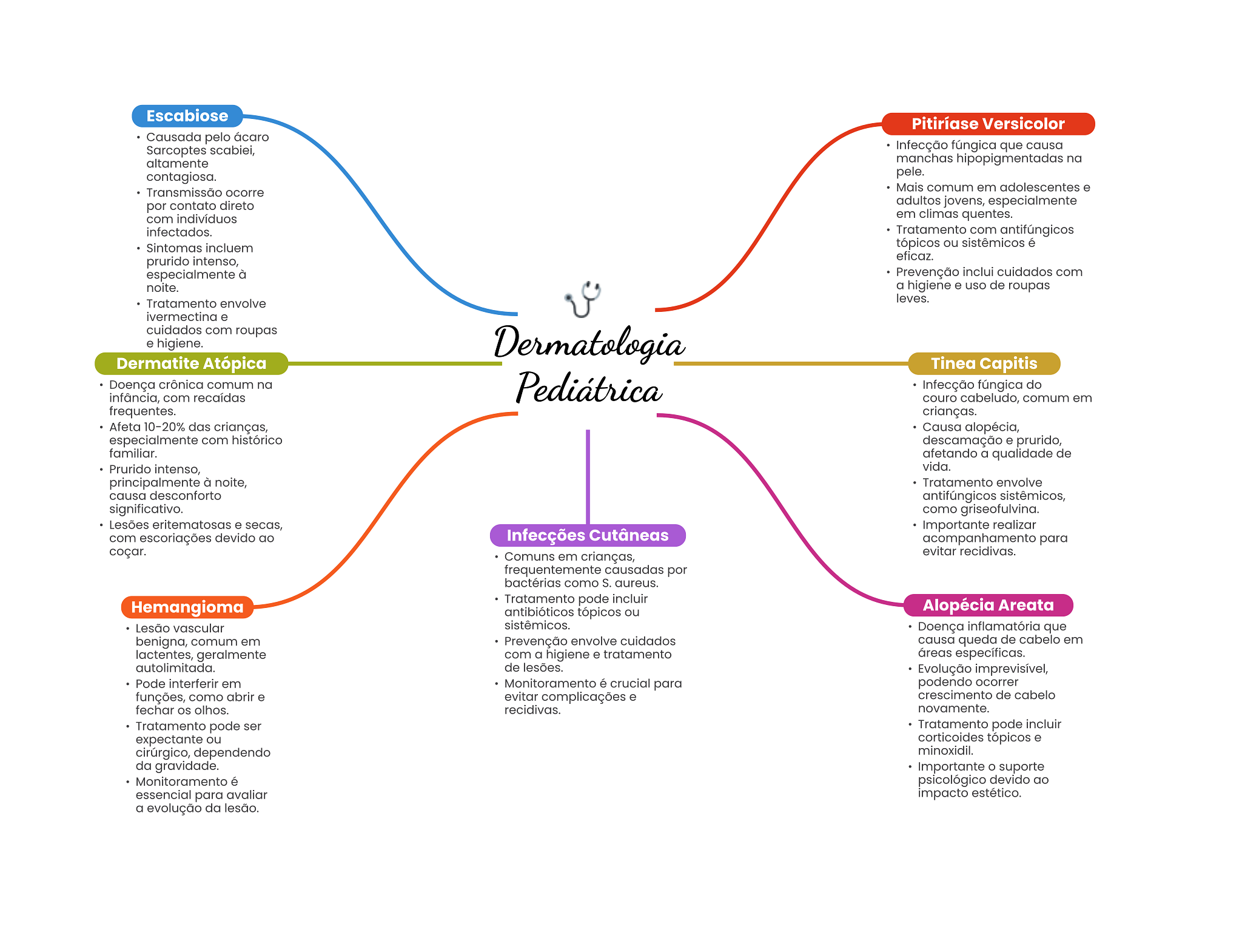 Escabiose Pitiríase Versicolor Causada pelo ácaro Sarcoptes scabiei, Infecção fúngica que causa altamente manchas hipopigmentadas na contagiosa. pele. Transmissão ocorre Mais comum em adolescentes e por contato direto adultos jovens, especialmente com indivíduos em climas quentes. infectados. Tratamento com antifúngicos Sintomas incluem tópicos ou sistêmicos é eficaz. prurido intenso, especialmente à Prevenção inclui cuidados com noite. a higiene e uso de roupas Tratamento envolve leves. ivermectina e cuidados com roupas e higiene. Dermatologia Dermatite Atópica Tinea Capitis Doença crônica comum na infância, com recaídas Pediátrica Infecção fúngica do couro cabeludo, comum em frequentes. crianças. Afeta 10-20% das crianças, Causa alopécia, especialmente com histórico descamação e prurido, familiar. afetando a qualidade de Prurido intenso, vida. principalmente à noite, Tratamento envolve causa desconforto antifúngicos sistêmicos, significativo. como griseofulvina. Lesões eritematosas e secas, Importante realizar com escoriações devido ao Infecções Cutâneas acompanhamento para coçar. Comuns em crianças, evitar recidivas. frequentemente causadas por bactérias como S. aureus. Tratamento pode incluir Hemangioma antibióticos tópicos ou Alopécia Areata Lesão vascular sistêmicos. Doença inflamatória que benigna, comum em Prevenção envolve cuidados causa queda de cabelo em lactentes, geralmente com a higiene e tratamento áreas específicas. autolimitada. de lesões. Evolução imprevisível, Pode interferir em Monitoramento é crucial para podendo ocorrer funções, como abrir e evitar complicações e crescimento de cabelo fechar olhos. recidivas. novamente. Tratamento pode ser Tratamento pode incluir expectante ou corticoides tópicos e cirúrgico, dependendo minoxidil. da gravidade. Importante suporte Monitoramento é psicológico devido ao essencial para avaliar impacto estético. a evolução da lesão.