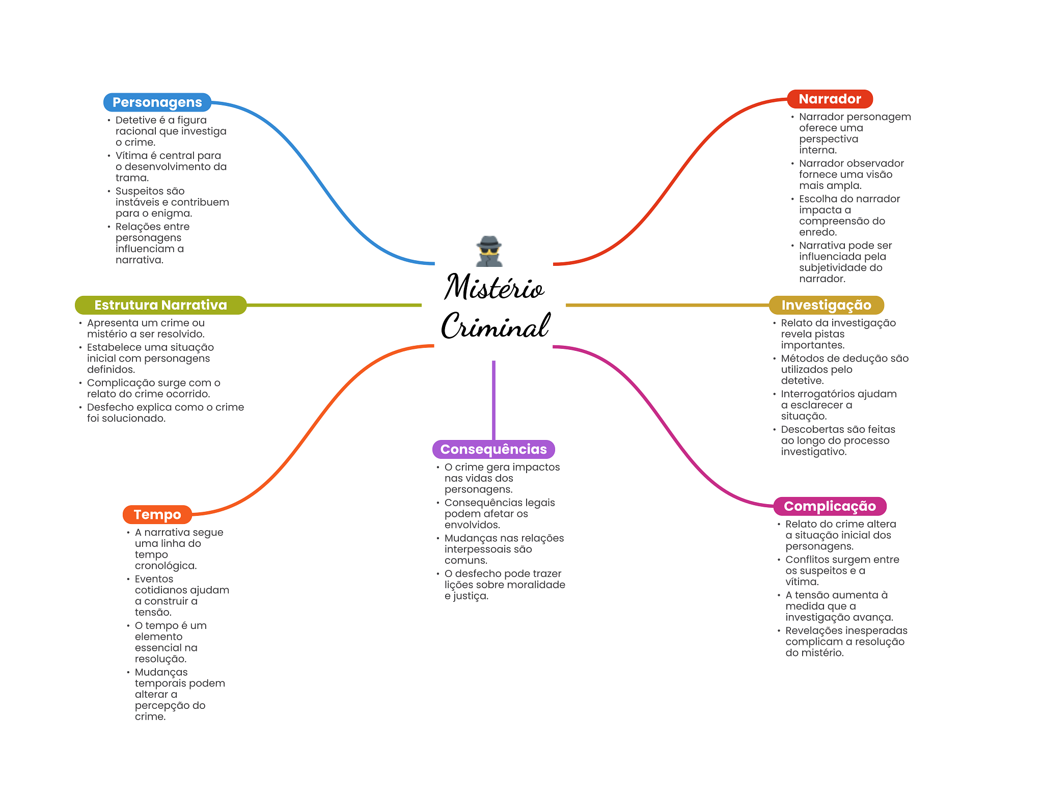 Personagens Narrador Detetive é a figura Narrador personagem racional que investiga oferece uma crime. perspectiva interna. Vítima é central para desenvolvimento da Narrador observador trama. fornece uma visão Suspeitos são mais ampla. instáveis e contribuem Escolha do narrador para enigma. impacta a Relações entre compreensão do enredo. personagens influenciam a Narrativa pode ser narrativa. influenciada pela subjetividade do Mistério narrador. Estrutura Narrativa Investigação Apresenta um crime ou mistério a ser resolvido. Criminal Relato da investigação revela pistas Estabelece uma situação importantes. inicial com personagens Métodos de dedução são definidos. utilizados pelo Complicação surge com detetive. relato do crime ocorrido. Interrogatórios ajudam Desfecho explica como crime a esclarecer a foi solucionado. situação. Descobertas são feitas ao longo do processo Consequências investigativo. crime gera impactos nas vidas dos personagens. Consequências legais Complicação Tempo podem afetar envolvidos. Relato do crime altera A narrativa segue uma linha do Mudanças nas relações a situação inicial dos interpessoais são personagens. tempo comuns. Conflitos surgem entre cronológica. desfecho pode trazer OS suspeitos e a Eventos lições sobre moralidade cotidianos ajudam a construir a e justiça. A tensão aumenta à tensão. medida que a investigação avança. elemento Revelações inesperadas essencial na complicam a resolução do mistério. resolução. Mudanças temporais podem alterar a percepção do crime.