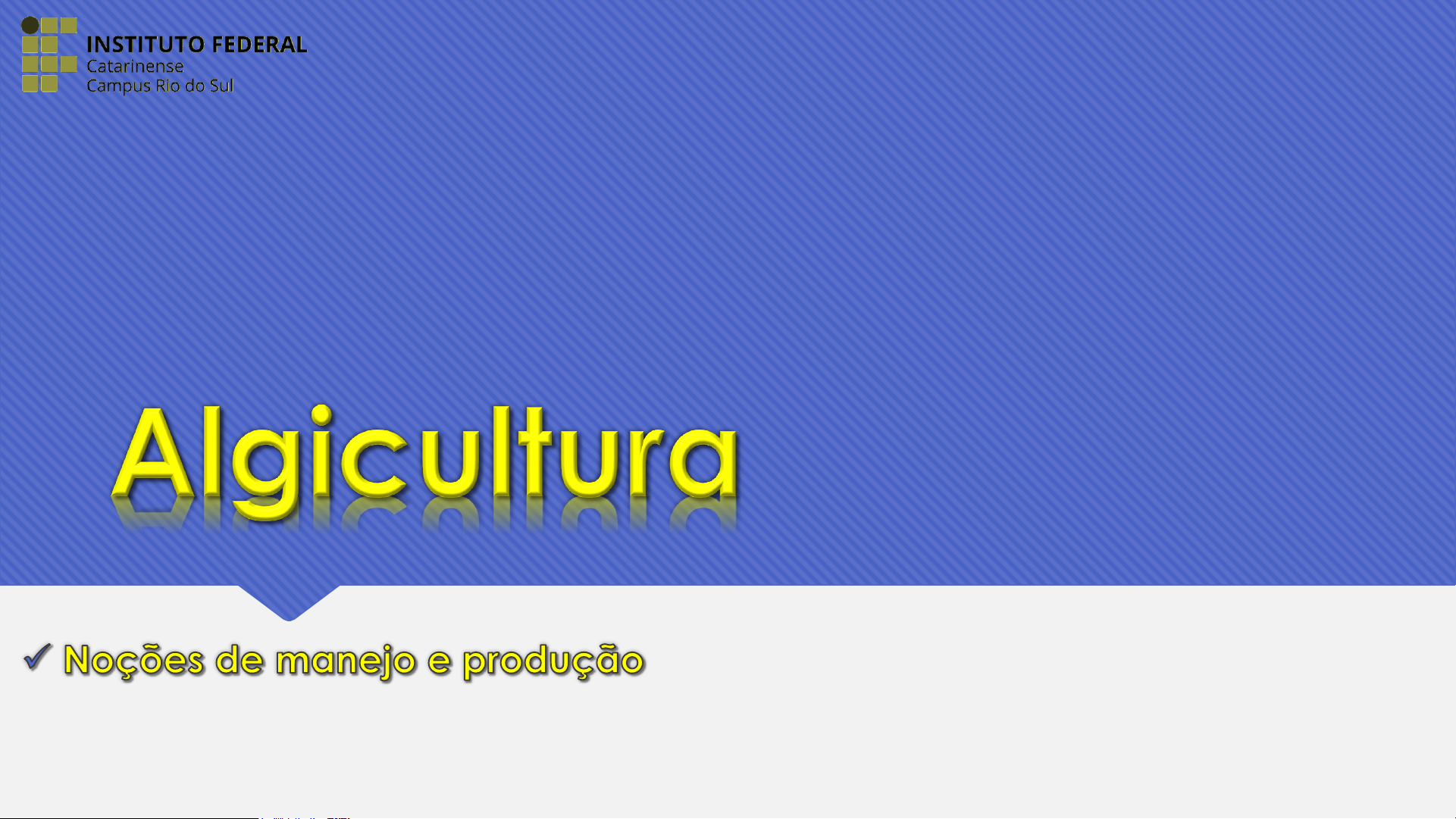 Prof. Dra. Suellen Scheibel 04 de julho, 2022 Macroalgas base da cadeia alimentar da vida aquática marinha, florestas de alimento; Diferente das microalgas tanques fechados ou laboratórios com reatores; Utilizada em rações, cosméticos, medicamentos, biofertilizantes, alimentação, etc; Multicelulares vermelhas (divisão Rhodophyta), as algas pardas (divisão Ochrophyta) e as algas verdes (divisão Chlorophyta); Gracilaria spp. (agar agar) e Hypnea spp. (carragena) mais produzidas no Nordeste; Kappaphycus alvarenzii Rio de Janeiro e Santa Catarina; Escolha da espécie bom desempenho no crescimento, saudáveis e resistentes e com baixo impacto ambiental; Boias, cordas, redes de cultivo ou estacas de bambo de até 5 m depende da alga; Em geral, as algas precisam de água entre 22 à 28ºC, salinidade entre 28 à 36 ppm; Brasil início da produção na estação quente em 3 meses já pode colher pouca tecnologia; Cultivo integrado sustentável; Fatores que influenciam: profundidade, movimento da água, iluminação, temperatura, salinidade, nutrientes presentes na água e o substrato de fixação; Extração manual na maré baixa ou por mergulho; Porphyra umbilicalis (nori) Saccharina japônica (kombu) Alunos quando veem o professor: “Corrigiu as provas?”