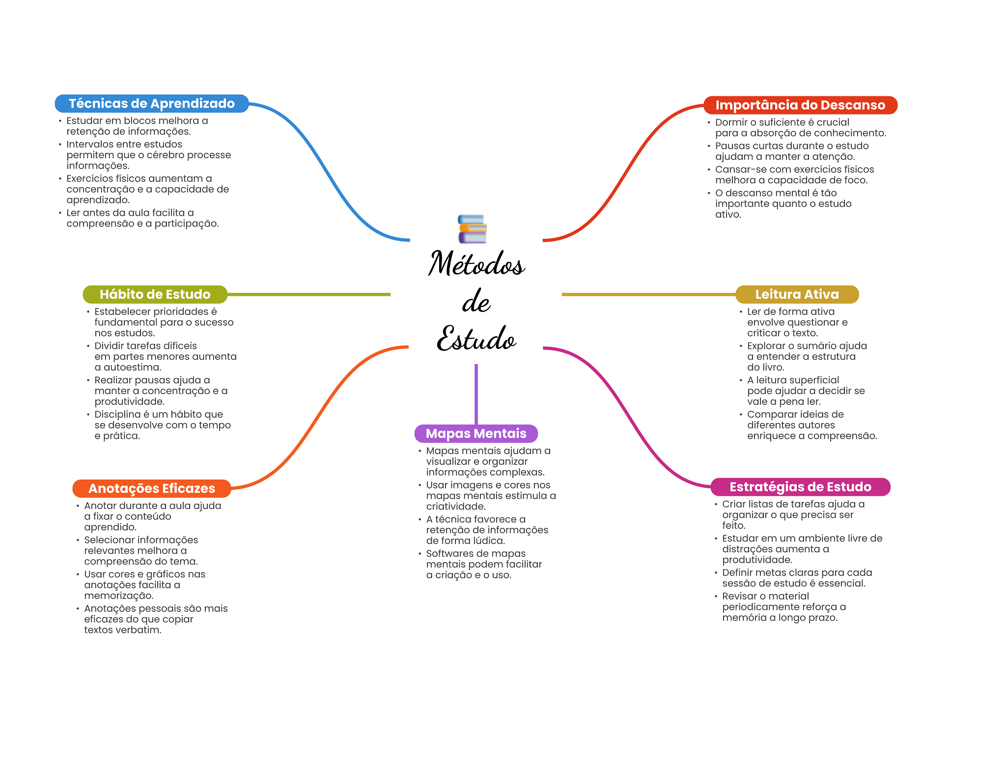 Técnicas de Aprendizado Importância do Descanso Estudar em blocos melhora a Dormir suficiente é crucial retenção de informações. para a absorção de conhecimento. Intervalos entre estudos Pausas curtas durante estudo permitem que cérebro processe ajudam a manter a atenção. informações. Cansar-se com exercícios físicos Exercícios físicos aumentam a melhora a capacidade de foco. concentração e a capacidade de descanso mental é tão aprendizado. importante quanto estudo Ler antes da aula facilita a ativo. compreensão e a participação. Métodos Hábito de Estudo de Leitura Ativa Estabelecer prioridades é Ler de forma ativa fundamental para sucesso envolve questionar e nos estudos. Dividir tarefas difíceis Estudo criticar texto. Explorar sumário ajuda em partes menores aumenta a entender a estrutura a autoestima. do livro. Realizar pausas ajuda a A leitura superficial manter a concentração e a pode ajudar a decidir se produtividade. vale a pena ler. Disciplina é um hábito que Comparar ideias de se desenvolve com O tempo diferentes autores e prática. Mapas Mentais enriquece a compreensão. Mapas mentais ajudam a visualizar e organizar informações complexas. Anotações Eficazes Usar imagens e cores nos Estratégias de Estudo mapas mentais estimula a Anotar durante a aula ajuda criatividade. Criar listas de tarefas ajuda a a fixar conteúdo A técnica favorece a organizar O que precisa ser aprendido. feito. retenção de informações Selecionar informações de forma lúdica. Estudar em um ambiente livre de relevantes melhora a Softwares de mapas distrações aumenta a compreensão do tema. mentais podem facilitar produtividade. Usar cores e gráficos nas a criação e uso. Definir metas claras para cada anotações facilita a sessão de estudo é essencial. memorização. Revisar material Anotações pessoais são mais periodicamente reforça a eficazes do que copiar memória a longo prazo. textos verbatim.
