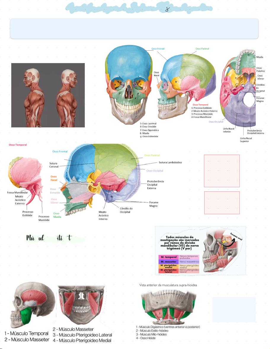 18/08 Antfsilogi d Stem Etomtognátic O sistema mastigatório ou estomatognático é uma entidade anatômica e fisiológica, perfeitamente definida, constituída por um heterogêneo de órgãos e tecidos cuja biologia e fisiopatologia são absolutamente interdependentes. Equilíbrio postural Elementos ativos • Músculos • Ligamentos • Nervos Elementos passivos • Ossos • Dentes Músculos mastigatórios A extremidade presa a uma peça óssea que não se desloca, ou ponto fixo, é denominada de origem. A extremidade presa a uma peça óssea que se desloca, ou ponto móvel, é denominada de inserção. Os músculos podem ser: • Agonistas • Antagonistas • Sinergistas @odonto.isasoares 18/08 Antfsilogi d Stem Etomtognátic MasseterMasseter Origem: arco zigomático Inserção: ângulo da mandíbula Origem: arco zigomático Inserção: ângulo da mandíbula Composto por duas partes ou feixes: • Ântero-lateral (superficial • Póstero-medial (mais profundo) Unidos por uma bainha. Composto por duas partes ou feixes: • Ântero-lateral (superficial • Póstero-medial (mais profundo) Unidos por uma bainha. Pterigoideo Medial Pterigoideo Medial Origem: processo pterigoideo do esfenoide Inserção: face medial do ramo e ângulo da mandíbula Origem: processo pterigoideo do esfenoide Inserção: face medial do ramo e ângulo da mandíbula Pterigoideo Lateral Pterigoideo Lateral Origem: esfenóide Inserção: cabeça do côndilo e na cápsula articular da ATM Origem: esfenóide Inserção: cabeça do côndilo e na cápsula articular da ATM TemporalTemporal Origem: linha temporal inferior e fáscia temporal Inserção: processo coronóide da mandíbula Origem: linha temporal inferior e fáscia temporal Inserção: processo coronóide da mandíbula Eleva e retrai a mandíbula. Auxilia na lateralidade. Eleva e retrai a mandíbula. Auxilia na lateralidade. Eleva e protui a mandíbula. Auxilia na lateralidade. Eleva e protui a mandíbula. Auxilia na lateralidade. Abaixa, protui e lateraliza a mandíbula.Abaixa, protui e lateraliza a mandíbula. Eleva e protui a mandíbula.Eleva e protui a mandíbula. Músculos Elevadores da Mandíbula Milo Hioideu Origem: linha milo-hióidea da mandíbula Inserção distal: rafe e corpo do osso hióide Origem: espinha mentoniana inferior Inserção distal: corpo do osso hióide. Digastrico Origem: incisura mastoíde do osso temporal Inserção: fossa digastrica na mandíbula Origem: processo estiloide do osso temporal. Inserção: corno maior do osso hioide. Eleva e retrai o osso hioide, alongando o assoalho da cavidade oral. Eleva e desloca o osso hióide anterior; Encurta o assoalho da boca e alarga a faringe. Eleva o osso hioide durante a mastigação e a deglutição. Depressão da mandíbula. Forma o assoalho da cavidade oral, eleva o osso hioide e o assoalho da boca, rebaixa a mandíbula. Músculos Depressores da Mandíbula Estilo Hioideu Genio Hioideu @odonto.isasoares on · Inser 18/08 Colex Oteoaticla Teporomandblar Anatomia da Articulação Temporomandibular (ATM)💀 • Articulação sinovial biaxial complexa • Bilateral - bicondílica (morfologicamente) • Interligada pela mandíbula • Interdependente • Articulação entre os dentes da maxila e mandíbula • Tecido fibroso avascular Movimentos próprios (unilaterais), porém simultâneos. Recobre superfícies articulares Componentes ósseos da ATM Côndilo Convexidade: ântero-posterior e látero-medial Prolongamento dos longos eixos: vértice na região do forame magno Prolongamento dos eixos menores: vértice na sínfise mentoniana Superfície posterior: rugosa Superfície anterior: lisa Suportado pelo colo. Osso Temporal Processo estilóide (1 Fissura timpanoescamosa: parte escamosa (2 (anterior) e parte timpânica (posterior) Processo retroarticular/Mastóide (3 Fossa mandibular [cavidade glenoide] (4 Tubérculo articular [eminência articular] (5 Cartilagem articular Tecido conjuntivo fibroso denso avascular (externa) Células indiferenciadas Cartilagem fibrosa (interna; após os 20 anos) Espessura variável Outras articulações sinoviais • Cartilagem hialina Disco articular Regulariza a discrepância anatômica Promove suavidade ao movimento e absorve impactos Não se regenera devido ao tecido conjuntivo denso Forma um “S” deitado sobreposto entre as superfícies ósseas da ATM Compartimentos: • Supradiscal (temperodiscal) • Infradiscal (mandibulodiscal) Face superior Convexa posteriormente (fosss mandibular) Côncava anteriormente (tubérculo articular) Face anterior Côncava (côndilo da mandíbula) Central Mais delgada Isenta de vasos e nervos Periférica Espessa Rica em vasos e nervos Fixa-se à cápsula articular A inserção do disco fica nos polos do côndilo (na cápsula articular) e no músculo pterigóideolateral (cabeça superior). O disco acompanha o côndilo nos movimentos de rotação @odonto.isasoares &- Cummin 5↑ Encam 18/08 Colex Oteoaticla Teporomandblar Cápsula articular e Membrana sinovial Circunda e isola a ATM Possui um tecido fibroso e frouxo que permite os movimentos mandibulares Inserção inferior: Feixe superficial (fibras longas verticais) Inserção superior: Face articular do temporal Inserção inferior: Colo da mandíbula (abaixo da inserção do disco) Feixe profundo (fibras curtas) > fixam a cápsula ao disco articular (divide os compartimentos) Inervada por: • Aurticulo-temporal • Massetérico • Temporal profundo posterior Irrigada pelo ramo da artéria superficial e da artéria maxilar. A membrana sinovial reveste internamente à cápsula articular. • Possui compartimentos supra e infradiscal, acima e abaixo do coxim retrodiscal. • Elabora a sinóvia. Solução aquosa de sais, glicose, proteína e ácido hialurônico. Ultrafiltrado sanguíneo, viscoso, nutritivo, fagocítico e lubrificante. Membrana sinovial Emi [ ↑ ~ ↑ 2 T