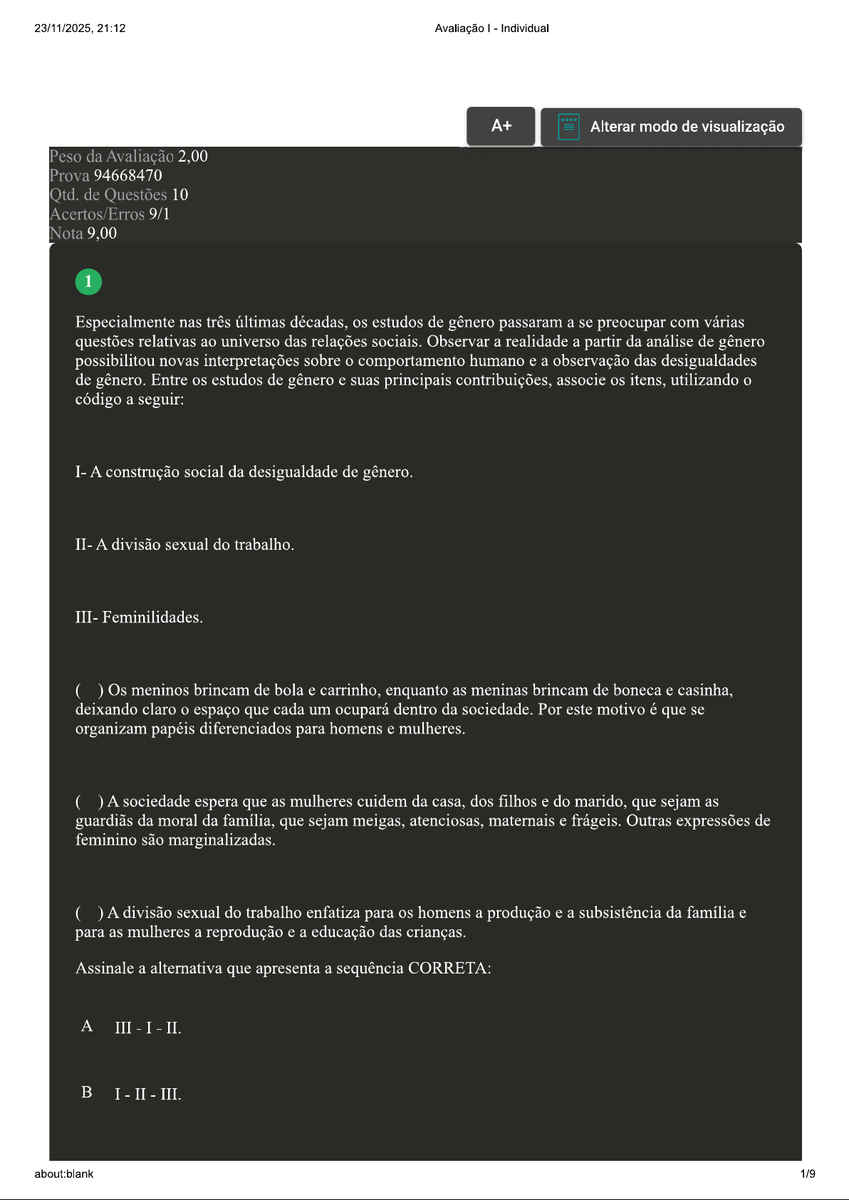 23/11/2025, 21:12 Avaliação I Individual A+ Alterar modo de visualização Peso da Avaliação 2,00 Prova 94668470 Qtd. de Questões 10 Acertos/Erros 9/1 Nota 9,00 1 Especialmente nas três últimas décadas, os estudos de gênero passaram a se preocupar com várias questões relativas ao universo das relações sociais. Observar a realidade a partir da análise de gênero possibilitou novas interpretações sobre o comportamento humano e a observação das desigualdades de gênero. Entre os estudos de gênero e suas principais contribuições, associe os itens, utilizando o código a seguir: I- A construção social da desigualdade de gênero. II- A divisão sexual do trabalho. III- Feminilidades. Os meninos brincam de bola e carrinho, enquanto as meninas brincam de boneca e casinha, deixando claro o espaço que cada um ocupará dentro da sociedade. Por este motivo é que se organizam papéis diferenciados para homens e mulheres. A sociedade espera que as mulheres cuidem da casa, dos filhos e do marido, que sejam as guardiãs da moral da família, que sejam meigas, atenciosas, maternais e frágeis. Outras expressões de feminino são marginalizadas. A divisão sexual do trabalho enfatiza para os homens a produção e a subsistência da família e para as mulheres a reprodução e a educação das crianças. Assinale a alternativa que apresenta a sequência CORRETA: A III I II. B I II III. about:blank 1/923/11/2025, 21:12 Avaliação Individual III II I. D I III II. E II III I. 2 Movimento Feminista surgiu no século XVIII, na Europa, especialmente na Inglaterra e França, mas logo repercutiu em outros países e se desenvolveu de diferentes formas e expressões até os dias atuais. Esse movimento foi dividido em três grandes momentos, que explicam as diferentes concepções e lutas do movimento. Sobre o exposto, associe os itens, utilizando o código a seguir: I- Primeira onda do feminismo. II- Segunda onda do feminismo. III- Terceira onda do feminismo. Discursão científica sobre a opressão das mulheres em uma sociedade patriarcal. Luta pela proteção de mulheres e garotas contra a violência doméstica, o assédio sexual estupro, pelos direitos trabalhistas, incluindo a licença-maternidade e salários iguais, e todas as outras formas de discriminação. Promoção da igualdade nos direitos contratuais e de propriedade para homens e mulheres. Assinale a alternativa que apresenta a sequência CORRETA: A III I II. B I II III. II I III. about:blank 2/923/11/2025, 21:12 Avaliação I Individual D III II I. E I III II. 3 Em 1990, foi promulgada a Lei Orgânica do SUS, com as Leis n° 8.080 e n° 8.142, que têm como base de sustentação os princípios norteadores do Sistema Único de Saúde brasileiro. Sobre os princípios do SUS, associe os itens, utilizando o código a seguir: I- Princípio da Universalidade. II- Princípio da Integralidade III- Princípio da Igualdade Possibilita as mesmas condições de acesso ao Sistema Único de Saúde neste país, onde ninguém pode solicitar um atendimento diferenciado, seja um pedido por apadrinhamento político, ou pelo nível social, raça, gênero. Estabelece a todos o direito de atendimento pelo Sistema Único de Saúde. Estabelece as ações do Sistema Único de Saúde para o atendimento integral entre os diferentes níveis de complexidade de atenção à saúde. Assinale a alternativa que apresenta a sequência CORRETA: A III II I. I II III. II III I. D III I II. about:blank 3/923/11/2025, 21:12 Avaliação - Individual E I III II. 4 Cidadania "é um conjunto de direitos e deveres que denotam e fundamentam as condições do comportamento de cada indivíduo com relação à sociedade, ou seja, a cidadania designa normas de conduta para o convívio social, determinando nossas obrigações e direitos perante os outros integrantes da nossa sociedade" (PIERITZ, 2013, 132). Sobre as principais três dimensões da cidadania, associe os itens, utilizando o código a seguir: I- Cidadania Civil. II- Cidadania Política. III- Cidadania Social. Conjunto de direitos concernentes ao conforto de cada cidadão. Quando os homens exercem seu poder político de eleger e ser eleitos para o exercício do poder político. São aqueles direitos advindos da liberdade de cada indivíduo. Assinale a alternativa que apresenta a sequência CORRETA: FONTE: PIERITZ, V.L. Ética profissional em serviço social. Indaial: UNIASSELVI, 2013. A I II III. B II III I. III II I. D II - I III. about:blank 4/923/11/2025, 21:12 Avaliação Individual E I III II. 5 Nos dias atuais, o conceito de democracia é notoriamente o entendido por grande parte da população brasileira, é este conceito de escolha de nossos representantes legais, por intermédio do voto popular. Sobre o assunto, associe os itens, utilizando o código a seguir: I- Democracia direta. II- Democracia indireta. Povo decide, por meio de referendo/plebiscito, se aceita ou não determinadas questões políticas e administrativas de sua localidade, Estado ou país. povo participa democraticamente, por meio do voto, elegendo seu representante político, ou seja, uma pessoa que o represente nas diversas esferas governamentais, para tomar decisões cabíveis em nome do povo que o elegeu. São os representantes eleitos por meio de eleições que determinam as questões políticas e administrativas das localidades, Estados e do país ao longo de seus mandatos. Assinale a alternativa que apresenta a sequência CORRETA: A II I II. B I II II. D II II I. E Revisar Conteúdo do Livro about:blank 5/923/11/2025, 21:12 Avaliação I - Individual 6 A moral sugere, constantemente, a valorização de nossas ações e de nossos comportamentos em sociedade, mas é a moral que determina quais são os nossos direitos e deveres perante a sociedade em que vivemos. Estes deveres são conectados ao nosso modo de ser e conviver em sociedade, gerando certas responsabilidades com relação a si próprio e aos outros Sobre o nosso modo de s