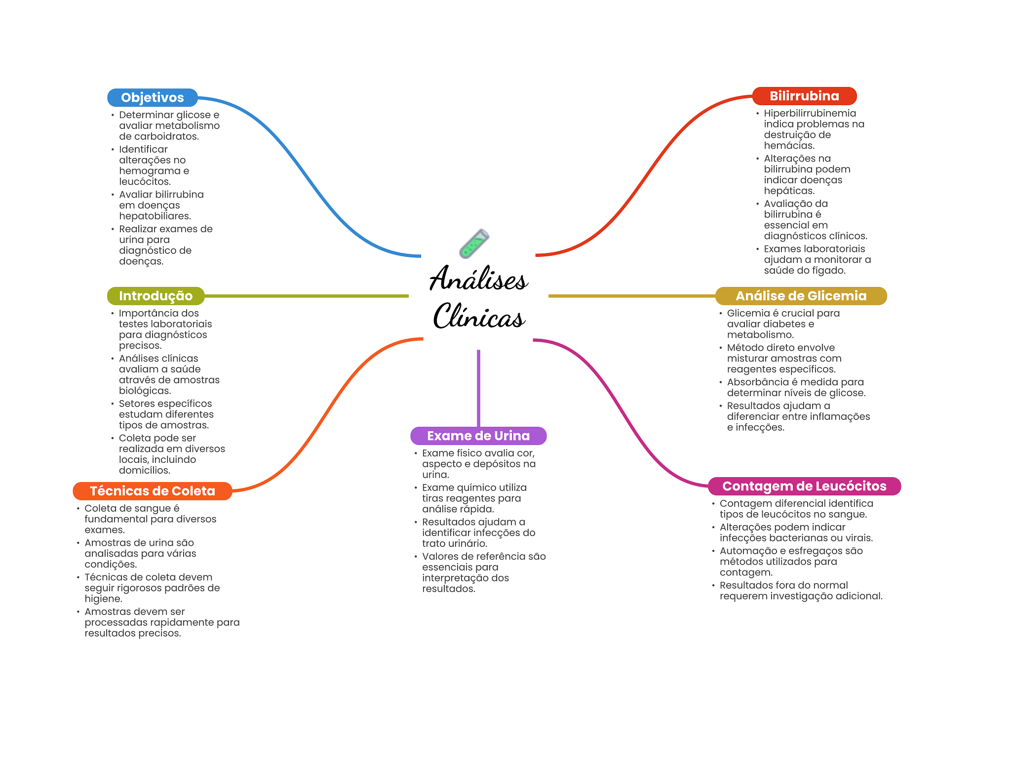 Objetivos Bilirrubina Determinar glicose e Hiperbilirrubinemia avaliar metabolismo indica problemas na de carboidratos. destruição de Identificar hemácias. alterações no Alterações na hemograma e bilirrubina podem leucócitos. indicar doenças Avaliar bilirrubina hepáticas. em doenças Avaliação da hepatobiliares. bilirrubina é Realizar exames de essencial em urina para diagnósticos clínicos. diagnóstico de Exames laboratoriais doenças. ajudam a monitorar a Análises saúde do fígado. Introdução Análise de Glicemia Importância dos testes laboratoriais Clínicas Glicemia é crucial para avaliar diabetes e para diagnósticos metabolismo. precisos. Método direto envolve Análises clínicas misturar amostras com avaliam a saúde reagentes específicos. através de amostras Absorbância é medida para biológicas. determinar níveis de glicose. Setores específicos Resultados ajudam a estudam diferentes diferenciar entre inflamações tipos de amostras. e infecções. Coleta pode ser Exame de Urina realizada em diversos Exame físico avalia cor, locais, incluindo aspecto e depósitos na domicílios. urina. Técnicas de Coleta Exame químico utiliza Contagem de Leucócitos tiras reagentes para Coleta de sangue é Contagem diferencial identifica análise rápida. fundamental para diversos tipos de leucócitos no sangue. Resultados ajudam a exames. identificar infecções do Alterações podem indicar Amostras de urina são trato urinário. infecções bacterianas ou virais. analisadas para várias Valores de referência são Automação e esfregaços são condições. essenciais para métodos utilizados para Técnicas de coleta devem interpretação dos contagem. seguir rigorosos padrões de resultados. Resultados fora do normal higiene. requerem investigação adicional. Amostras devem ser processadas rapidamente para resultados precisos.