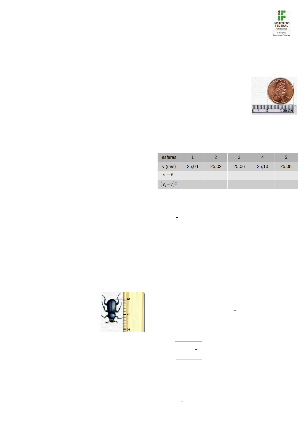 INSTITUTO FEDERAL DE EDUCAÇÃO, CIÊNCIA E TECNOLOGIA DO AMAZONAS - CMC DISCIPLINA: FÍSICA CURSO/TURMA: ____________________________________________________ DATA: _____ / _____ / __________ DISCENTE: _________________________________________________________ Exercícios 1. Se você está dirigindo a 90 km/h, quão rápido você está viajando em metros por segundo e em milhas por hora? (Dado: 1 mi = 1,609 km) 2. Faça as seguintes conversões de unidades: a) 72 km/h em m/s b) 1 kg/m³ em g/cm³ 3. Quantos algarismos significativos tem cada quantidade abaixo? a) 0,010457 b) 487,13 c) 6,0470 d) 0,302 e) 0,00076 4. Escreva os valores abaixo em notação científica. a) 145300000 km b) 350 kg c) 41,0 °C ¹⁻ d) 0,00030 g 5. Uma vez decidido o que caracteriza o tamanho do besouro (por exemplo, o extremo de sua cabeça e a sua extremidade posterior), qual das alternativas abaixo melhor caracteriza a medida do tamanho do besouro? a) 1 cm b) 2 cm c) 1,5 cm d) 1,55 cm e) 1,546 cm 6. A expressão correta de uma medida deve conter a estimativa do valor de grandeza e a incerteza nesta estimativa. a) Qual o o intervalo de incerteza da medida da questão anterior? b) Como ficaria expresso o resultado da questão anterior se colocado esse intervalo de incerteza ao lado da medida? 7. Observe a figura a seguir, podemos afirmar que a metade da menor divisão é uma estimativa da incerteza. Portanto, como pode ser expresso o diâmetro da moeda? 8. Cinco esferas metálicas foram lançadas ao mesmo tempo e suas velocidades foram medidas conforme a tabela a seguir. a) Calcule o valor médio do conjunto de medidas. Onde v= 1 N .∑ i=1 N xi b) Preencha a penúltima linha da tabela conforme a diferença indicada em sua primeira coluna. c) Preencha a última linha da tabela conforme a operação indicada em sua primeira coluna, ou seja, o quadrado dos dados da penúltima linha. d) Calcule a somatória: ∑ i=1 N (vi−v) ² e) Usando o resultado do item anterior, obtenha o desvio: σ v=√∑i=1 N (vi−v)² N (N−1) f) Expresse o valor da velocidade seguido do intervalo de incerteza: v=v±σ v