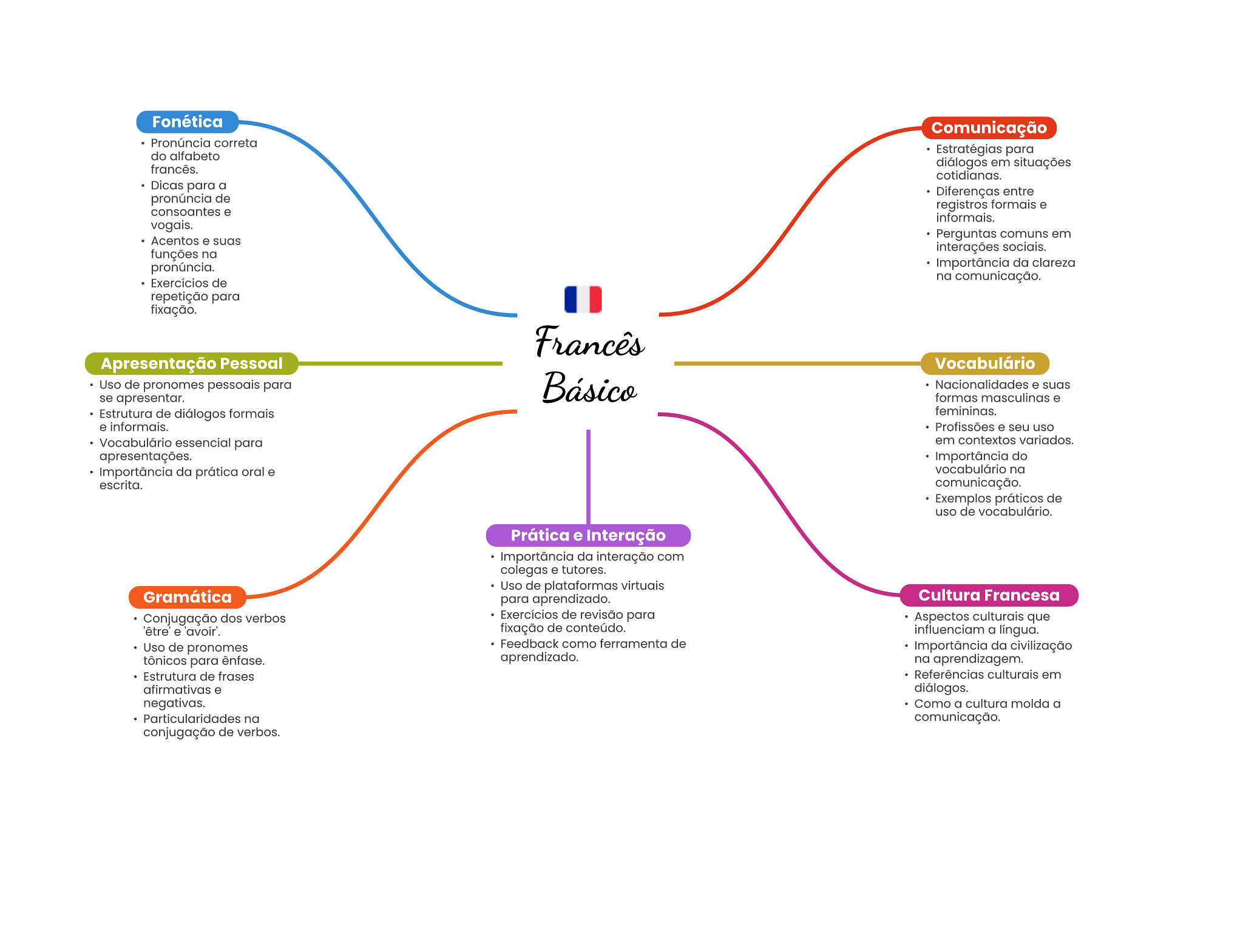 Fonética Comunicação Pronúncia correta do alfabeto Estratégias para francês. diálogos em situações cotidianas. Dicas para a Diferenças entre pronúncia de registros formais e consoantes e informais. vogais. Acentos e suas Perguntas comuns em interações sociais. funções na pronúncia. Importância da clareza Exercícios de na comunicação. repetição para fixação. Francês Apresentação Pessoal Vocabulário Uso de pronomes pessoais para Básico Nacionalidades e suas se apresentar. formas masculinas e Estrutura de diálogos formais femininas. e informais. Profissões e seu uso Vocabulário essencial para em contextos variados. apresentações. Importância do Importância da prática oral e vocabulário na escrita. comunicação. Exemplos práticos de uso de vocabulário. Prática e Interação Importância da interação com colegas e tutores. Uso de plataformas virtuais Gramática para aprendizado. Cultura Francesa Conjugação dos verbos Exercícios de revisão para Aspectos culturais que 'être' e 'avoir'. fixação de conteúdo. influenciam a língua. Uso de pronomes Feedback como ferramenta de Importância da civilização tônicos para ênfase. aprendizado. na aprendizagem. Estrutura de frases Referências culturais em afirmativas e diálogos. negativas. Como a cultura molda a Particularidades na comunicação. conjugação de verbos.