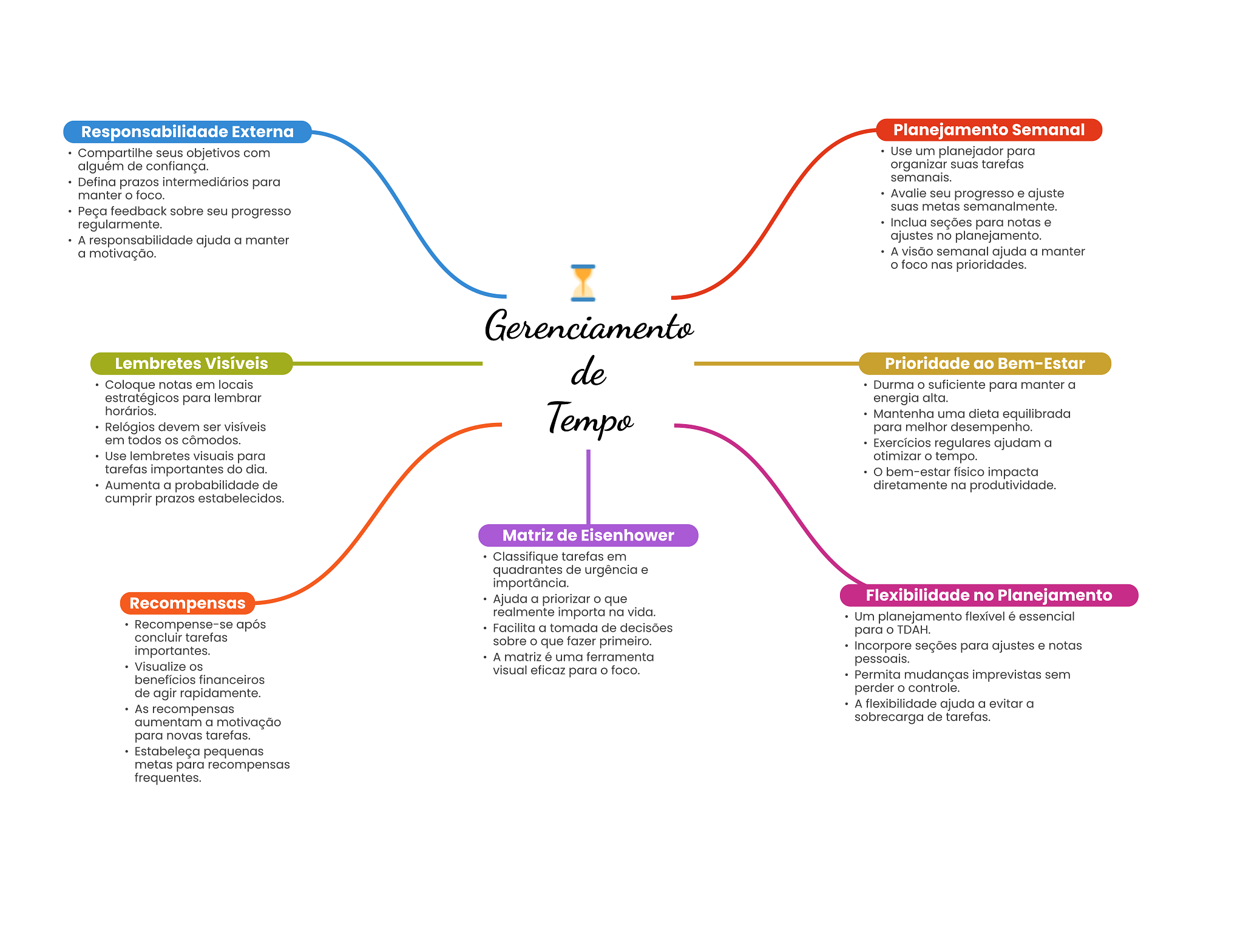 Responsabilidade Externa Planejamento Semanal Compartilhe seus objetivos com Use um planejador para alguém de confiança. organizar suas tarefas Defina prazos intermediários para semanais. manter foco. Avalie seu progresso e ajuste Peça feedback sobre seu progresso suas metas semanalmente. regularmente. seções para notas e A responsabilidade ajuda a manter ajustes no planejamento. a motivação. A visão semanal ajuda a manter foco nas prioridades. I Gerenciamento Lembretes Visíveis de Prioridade ao Bem-Estar Coloque notas em locais Durma O suficiente para manter a estratégicos para lembrar energia alta. horários. Relógios devem ser visíveis Tempo Mantenha uma dieta equilibrada para melhor desempenho. em todos OS cômodos. Exercícios regulares ajudam a Use lembretes visuais para otimizar O tempo. tarefas importantes do dia. bem-estar físico impacta Aumenta a probabilidade de diretamente na produtividade. cumprir prazos estabelecidos. Matriz de Eisenhower Classifique tarefas em quadrantes de urgência e importância. Recompensas Ajuda a priorizar que Flexibilidade no Planejamento realmente importa na vida. Um planejamento flexível é essencial Recompense-se após Facilita a tomada de decisões para TDAH. concluir tarefas sobre O que fazer primeiro. importantes. Incorpore seções para ajustes e notas A matriz é uma ferramenta pessoais. Visualize visual eficaz para O foco. benefícios financeiros Permita mudanças imprevistas sem de agir rapidamente. perder controle. As recompensas A flexibilidade ajuda a evitar a aumentam a motivação sobrecarga de tarefas. para novas tarefas. Estabeleça pequenas metas para recompensas frequentes.