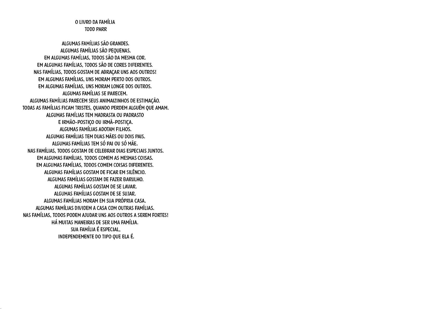 0 LIVRO DA FAMÍLIA TODD PARR ALGUMAS FAMÍLIAS SÃO GRANDES. ALGUMAS FAMÍLIAS SÃO PEQUENAS. EM ALGUMAS FAMÍLIAS, TODOS SÃO DA MESMA COR. EM ALGUMAS FAMÍLIAS, TODOS SÃO DE CORES DIFERENTES. NAS FAMÍLIAS, TODOS GOSTAM DE ABRAÇAR UNS AOS OUTROS! EM ALGUMAS FAMÍLIAS, UNS MORAM PERTO DOS OUTROS. EM ALGUMAS FAMÍLIAS, UNS MORAM LONGE DOS OUTROS. ALGUMAS FAMÍLIAS SE PARECEM. ALGUMAS FAMÍLIAS PARECEM SEUS ANIMAIZINHOS DE ESTIMAÇÃO. TODAS AS FAMÍLIAS FICAM TRISTES, QUANDO PERDEM ALGUÉM QUE AMAM. ALGUMAS FAMÍLIAS TEM MADRASTA OU PADRASTO E IRMÃO-POSTIÇO OU IRMÃ-POSTIÇA. ALGUMAS FAMÍLIAS ADOTAM FILHOS. ALGUMAS FAMÍLIAS TEM DUAS MÃES OU DOIS PAIS. ALGUMAS FAMÍLIAS TEM só PAI OU só MÃE. NAS FAMÍLIAS, TODOS GOSTAM DE CELEBRAR DIAS ESPECIAIS JUNTOS. EM ALGUMAS FAMÍLIAS, TODOS COMEM AS MESMAS COISAS. EM ALGUMAS FAMÍLIAS, TODOS COMEM COISAS DIFERENTES. ALGUMAS FAMÍLIAS GOSTAM DE FICAR EM SILÊNCIO. ALGUMAS FAMÍLIAS GOSTAM DE FAZER BARULHO. ALGUMAS FAMÍLIAS GOSTAM DE SE LAVAR. ALGUMAS FAMÍLIAS GOSTAM DE SE SUJAR. ALGUMAS FAMÍLIAS MORAM EM SUA PRÓPRIA CASA. ALGUMAS FAMÍLIAS DIVIDEM A CASA COM OUTRAS FAMÍLIAS. NAS FAMÍLIAS, TODOS PODEM AJUDAR UNS AOS OUTROS A SEREM FORTES! HÁ MUITAS MANEIRAS DE SER UMA FAMÍLIA. SUA FAMÍLIA É ESPECIAL, INDEPENDEMENTE DO TIPO QUE ELA É.