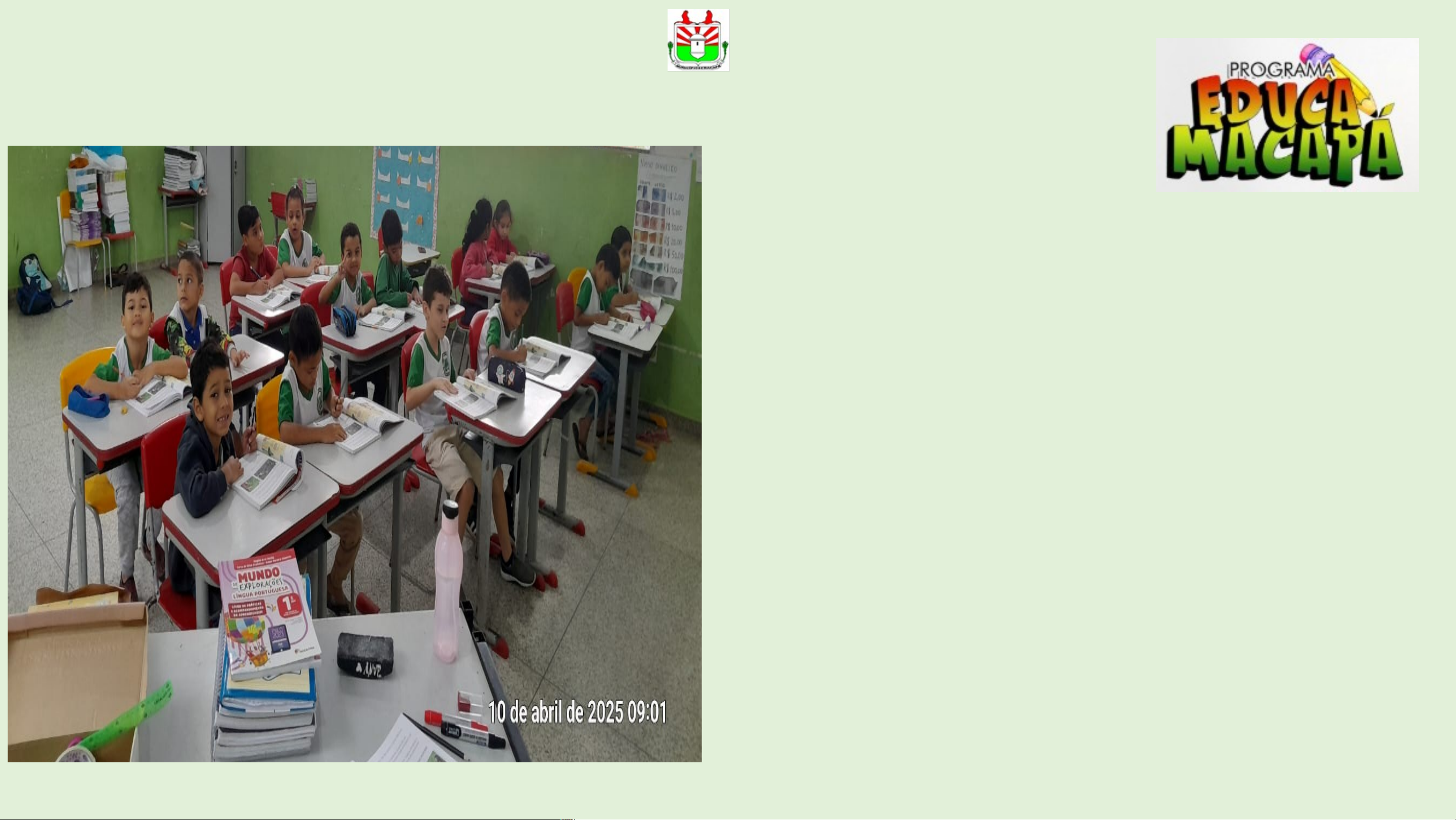 PREFEITURA MUNICIPAL DE MACAPÁ SECRETARIA MUNICIPAL DE EDUCAÇÃO EMEF: Rondônia Gestora: Kellyane Sherring Coordenadora: Silvângela Lobato Professor(a): Janyete T. Everton Projeto Trilhas Da Avaliação • Estratégias Pedagógicas “Letrar é mais que alfabetizar, é ensinar a ler e escrever dentro de um contexto onde a escrita e a leitura tenham sentido e façam parte da vida do aluno. Magda Soares AVALIAÇÃO DIAGNÓTICA PROFESSOR(A): Janyete Tôrres Everton TURMA: 113 Nº DE ALUNOS QUANT. DE ALUNOS ESPECIAIS QUANT. DE ALUNOS ESPECIAIS QUE NÃO REALIZARAM A AVALIAÇÃO NÃO LEITOR LEITOR DE SÍLABAS LEITOR DE PALAVRAS LEITOR DE FRASES LEITOR NÃO FLUENTE LEITOR FLUENTE NÃO AVALIADO NÃO INFORMADO OBJETIVA (% ACERTO) LÍNGUA PORTUGUESA MATEMÁTICA 18 Avaliação Diagnóstica 2025 2 15 02 Meta Avaliação Formativa I 2 10 06 Estratégias Pedagógicas Rotinas de Leituras dinâmicas diárias, tendo por base o Método Fônico: Consciência Fonológica. Exercícios diários de leitura e escrita, com o uso de livros de fluências, jogos e músicas. Atendimento individualizado e reforço. Incentivo a leitura em família: Envolvimento dos pais. image1.png image2.png image3.jpg image4.png image5.jpg image6.jpg image7.jpg image8.jpg image9.png image10.jpg image11.jpg image12.jpg