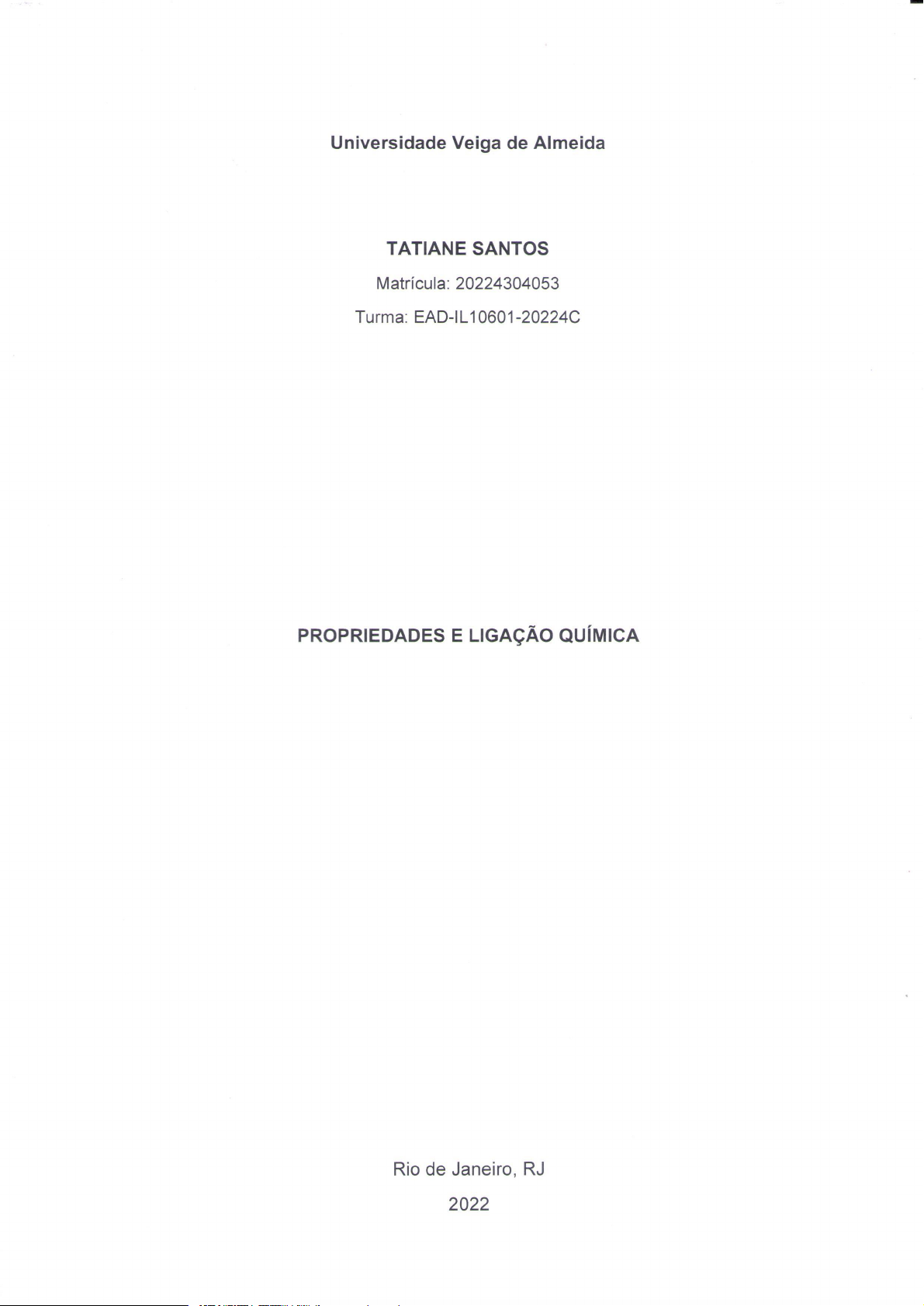 Universidade Veiga de Almeida TATIANE SANTOS Matrícula: 20224304053 Turma: EAD-|L10601-20224C PROPRIEDADESE LIGAÇÃO QUÍMICA Rio de Janeiro, RJ 2022 ENUNCIADO DA QUESTÃO O tipo de ligação (metálica, iônica e covalente) influencia a classificação e ad propriedades dos materiais mais comuns na engenharia (metais, cerâmicos e polímeros) estudados nas ciências dos materiais. As propriedades físicas e químicas desses materiais têm relação direta com o tipo de ligação entre os átomos. Dos materiais citados, as cerâmicas têm uma faceta importante no mundo da engenharia de materiais. Numa definição simplificada, materiais cerâmicos são compostos de elementos metálicos e não metálicos, com exceção do carbono. Exemplos: SiO2 (sílica); AIZO3 (alumínio). No aspecto ligação química, há uma variação de totalmente iônica até totalmente covalente, bem como combinações desses dois tipos de ligação. Algumas propriedades das cerâmicas: Maior dureza em comparação aos metais, porém, normalmente, são frágeis. Apresentam alto ponto de fusão. Propriedades térmicas: alta capacidade calorífica; baixo coeficiente de expansão térmica e condutividade térmica. Maior resistência ao calor e à corrosão que metais e polímeros. As propriedades em destaque permitem que a cerâmica seja utilizada como alto forno nas indústrias siderúrgica e aeroespacial. Observando as propriedades em destaque, responda as seguintes questões: Como você considera que seja a correlação entre o(s) tipo(s) de ligação e as propriedades em destaque? Qual é a relação entre essas propriedades e aquelas dos compostos formados pelas ligações iônicas e covalentes? RESPOSTA As propriedades das substâncias estão inteiramente ligadas a interação dos átomos de seus elementos (ligação química), pois são diretamente influenciadas por estas ligações. Desta forma, através das propriedades dos materiais, conhecemosqual tipo de ligação química há entre os átomos de sua composição. Quando a ligação ocorre entre dois ametais é chamada de covalente, neste tipo de ligação os átomos de cada elemento compartilham elétrons da camada de valência. Quandoa ligação ocorre entre um metal e um ametal é chamada de iônica e há uma transferência de elétrons da camada de valência. Perante o exposto, podemos observar que compostos formados pelo mesmo tipo de ligação possuem as mesmas propriedades físicas. Focando, em especial, na cerâmica, que é um material duro, porém frágil, alto ponto de fusão e ponto de ebulição, resistente à alta temperatura e à corrosão, é um bom isolante térmico e elétrico e tem baixa condutividade elétrica, podemos concluir que a cerâmica pode ser formada tanto pela ligação iônica, que é mais comum, quanto pela ligação covalente e com isso, percebemos que há pontos em comum entre esses dois tipos de ligação química.