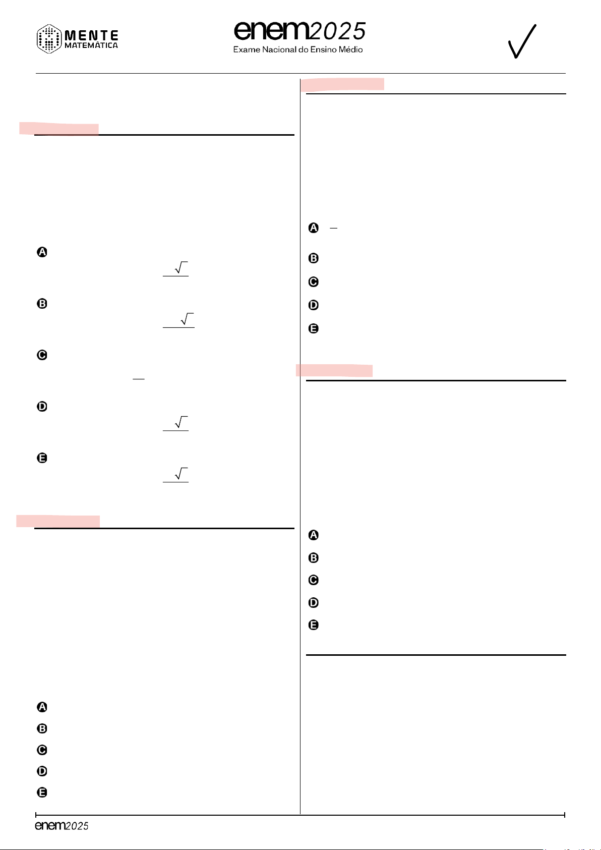 MT | As 45 + Importantes | Enem 2020 a Enem 2024 MATEMÁTICA E SUAS TECNOLOGIAS Questões de 136 a 180 Questão 136 Um jardineiro dispõe de k metros lineares de cerca baixa para fazer um jardim ornamental. O jardim, delimitado por essa cerca, deve ter a forma de um triângulo equilátero, um quadrado ou um hexágono regular. A escolha será pela forma que resulte na maior área. O jardineiro escolherá a forma de hexágono regular, pois a área do jardim, em metro quadrado, será 2k 3 24 . hexágono regular, pois a área do jardim, em metro quadrado, será 23k 3 2 . quadrado, pois a área do jardim, em metro quadrado, será 2k 16 . triângulo equilátero, pois a área do jardim, em metro quadrado, será 2k 3 36 . triângulo equilátero, pois a área do jardim, em metro quadrado, será 2k 3 4 . Questão 137 Uma cozinheira produz docinhos especiais por encomenda. Usando uma receita-base de massa, ela prepara uma porção, com a qual produz 50 docinhos maciços de formato esférico, com 2 cm de diâmetro. Um cliente encomenda 150 desses docinhos, mas pede que cada um tenha formato esférico com 4 cm de diâmetro. A cozinheira pretende preparar o número exato as porções de porções da receita-base de massa necessário para produzir os docinhos dessa encomenda. Quantas porções da receita-base de massa ela deve preparar para atender esse cliente? 2 3 6 12 24 Questão 138 Uma loja de materiais de construção vende dois tipos de caixas-d’água: tipo A e tipo B. Ambas têm formato cilíndrico e possuem o mesmo volume, e a altura da caixa-d’água do tipo B é igual a 25% da altura da caixa- d’água do tipo A. Se R denota o raio da caixa-d’água do tipo A, então o raio da caixa-d’água do tipo B é R 2 2 R 4 R 5 R 16 R Questão 139 O arquiteto Renzo Piano exibiu a maquete da nova sede do Museu Whitney de Arte Americana, um prédio assimétrico que tem um vão aberto para a galeria principal, cuja medida da área é 1 672 m2. Considere que a escala da maquete exibida é 1 : 200. Época, n. 682, jun. 2011 (adaptado). A medida da área do vão aberto nessa maquete, em centímetro quadrado, é 4,18. 8,36. 41,80. 83,60. 418,00. MT | As 45 + Importantes | Enem 2020 a Enem 2024 Questão 140 O uso de aplicativos de transporte tem sido uma alternativa à população que busca preços mais competitivos para se locomover, principalmente nas grandes cidades. As formas usadas para determinar o valor cobrado por cada viagem variam de um aplicativo para outro, mas, em geral, o valor V a ser pago, em real, varia em função de: • tarifa base F: valor fixo, em real, cobrado no início da viagem; • tempo T: tempo, em minuto, de duração da viagem; • distância D: distância percorrida, em quilômetro. Um desses aplicativos cobra R$ 2,00 de valor fixo, acrescido de R$ 0,26 por minuto de viagem e de R$ 1,40 por quilômetro rodado. Nessas condições, a expressão que fornece o valor V a ser pago por uma viagem desse aplicativo é 2,00F 0,26T 1,40D+ + 2,00 0,26T 1,40D+ + 2,00 0,26T D+ + 0,26T 1,40D+ F T D+ + Questão 141 Uma loja comercializa cinco modelos de caixas-d’água (I, II, III, IV e V), todos em formato de cilindro reto de base circular. Os modelos II, III, IV e V têm as especificações de suas dimensões dadas em relação às dimensões do modelo I, cuja profundidade é P e área da base é Ab, como segue: ● modelo II: o dobro da profundidade e a metade da área da base do modelo I; ● modelo III: o dobro da profundidade e a metade do raio da base do modelo I; ● modelo IV: a metade da profundidade e o dobro da área da base do modelo I; ● modelo V: a metade da profundidade e o dobro do raio da base do modelo I. Uma pessoa pretende comprar nessa loja o modelo de caixa-d’água que ofereça a maior capacidade volumétrica. O modelo escolhido deve ser o I. II. III. IV. V. Questão 142 O organizador de uma competição de lançamento de dardos pretende tornar o campeonato mais competitivo. Pelas regras atuais da competição, numa rodada, o jogador lança 3 dardos e pontua caso acerte pelo menos um deles no alvo. O organizador considera que, em média, os jogadores têm, em cada lançamento, 1 2 de probabilidade de acertar um dardo no alvo. A fim de tornar o jogo mais atrativo, planeja modificar as regras de modo que a probabilidade de um jogador pontuar em uma rodada seja igual ou superior a 9 10 . Para isso, decide aumentar a quantidade de dardos a serem lançados em cada rodada. Com base nos valores considerados pelo organizador da competição, a quantidade mínima de dardos que devem ser disponibilizados em uma rodada para tornar o jogo mais atrativo é 2. 4. 6. 9. 10. MT | As 45 + Importantes | Enem 2020 a Enem 2024 Questão 143 A exposição a alguns níveis sonoros pode causar lesões auditivas. Por isso, em uma indústria, são adotadas medidas preventivas de acordo com a máquina que o funcionário opera e o nível N de intensidade do som, medido em decibel (dB), a que o operário é exposto, sendo 10 10 10 10 0N log I log I ,= − I a intensidade do som e 12 2 0I 10 W m .−= Disponível em: www.sofisica.com.br. Acesso em: 8 jul. 2015 (adaptado). Quando o som é considerado baixo, ou seja, N = 48 dB ou menos, deve ser utilizada a medida preventiva I. No caso de o som ser moderado, quando N está no intervalo (48 dB, 55 dB), deve ser utilizada a medida preventiva II. Quando o som é moderado alto, que equivale a N no intervalo (55 dB, 80 dB), a medida preventiva a ser usada é a III. Se N estiver no intervalo (80 dB, 115 dB), quando o som é considerado alto, deve ser utilizada a medida preventiva IV. E se o som é considerado muito alto, com N maior que 115 dB, deve-se utilizar a medida preventiva V. Uma nova máquina, com 8 2I 8 10 W m ,−= foi adquirida e será classificada de acordo com o nível de ruido que produz. Considere 0,3 como aproximação para log102. O funcionário que operará a nova máquina deverá adotar a medida preventiva I. II. III. IV. V. Qu