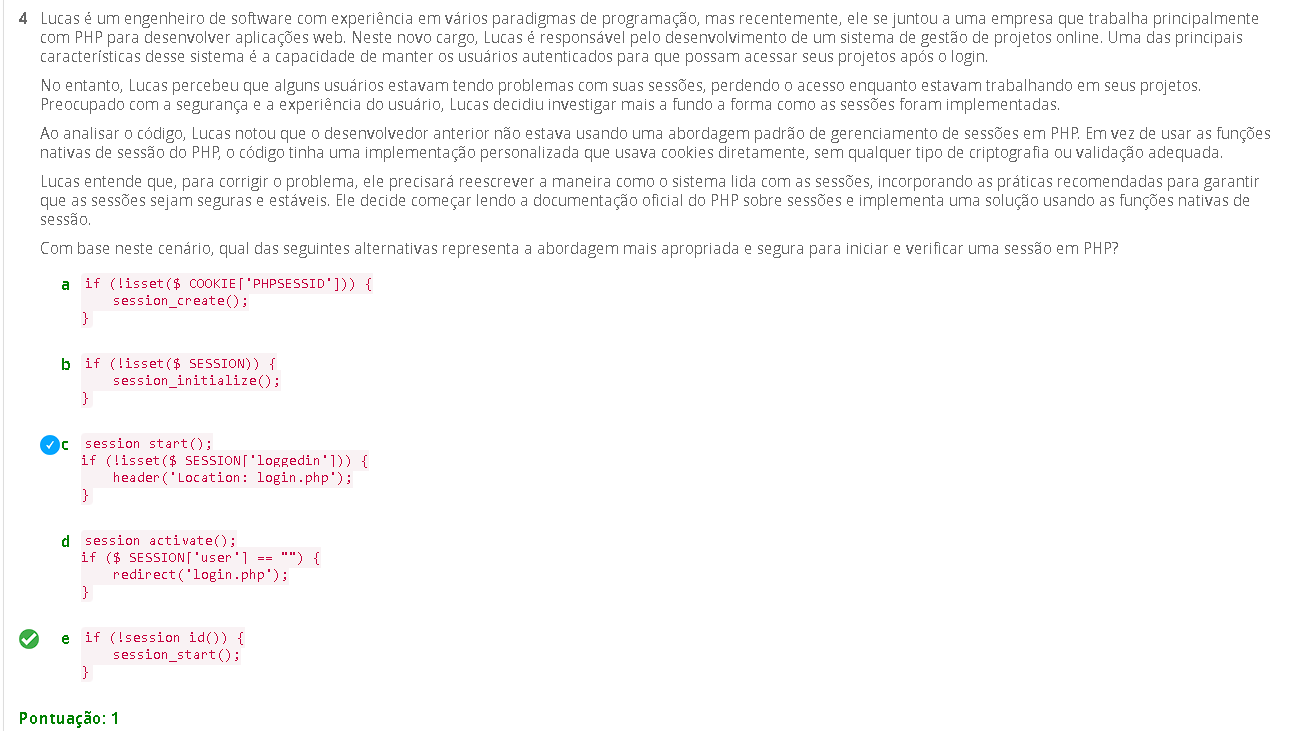 4 Lucas é um engenheiro de software com experiência em vários paradigmas de programação, mas recentemente, ele se juntou a uma empresa que trabalha principalmente com PHP para desenvolver aplicações web. Neste novo cargo, Lucas é responsável pelo desenvolvimento de um sistema de gestão de projetos online. Uma das principais características desse sistema é a capacidade de manter os usuários autenticados para que possam acessar seus projetos após 0 login. No entanto, Lucas percebeu que alguns usuários estavam tendo problemas com suas sessões, perdendo 0 acesso enquanto estavam trabalhando em seus projetos. Preocupado com a segurança e a experiência do usuário, Lucas decidiu investigar mais a fundo a forma como as sessões foram implementadas. Ao analisar 0 código, Lucas notou que 0 desenvolvedor anterior não estava usando uma abordagem padrão de gerenciamento de sessões em PHP. Em vez de usar as funções nativas de sessão do PHP, 0 código tinha uma implementação personalizada que usava cookies diretamente, sem qualquer tipo de criptografia ou validação adequada. Lucas entende que, para corrigir 0 problema, ele precisará reescrever a maneira como 0 sistema lida com as sessões, incorporando as práticas recomendadas para garantir que as sessões sejam seguras e estáveis. Ele decide começar lendo a documentação oficial do PHP sobre sessões e implementa uma solução usando as funções nativas de sessão. Com base neste cenário, qual das seguintes alternativas representa a abordagem mais apropriada e segura para iniciar e verificar uma sessão em PHP? a if ($ COOKIE { session_create(); } b if (lisset($ SESSION)) { session_initialize() ; session start(); if (!isset($ SESSION| 'loggedin' { header ('Location: login.php') ; } session activate(); if ($ SESSION| "") { redirect('login.php'); } e if (!session id()) { session_start() } Pontuação: 1