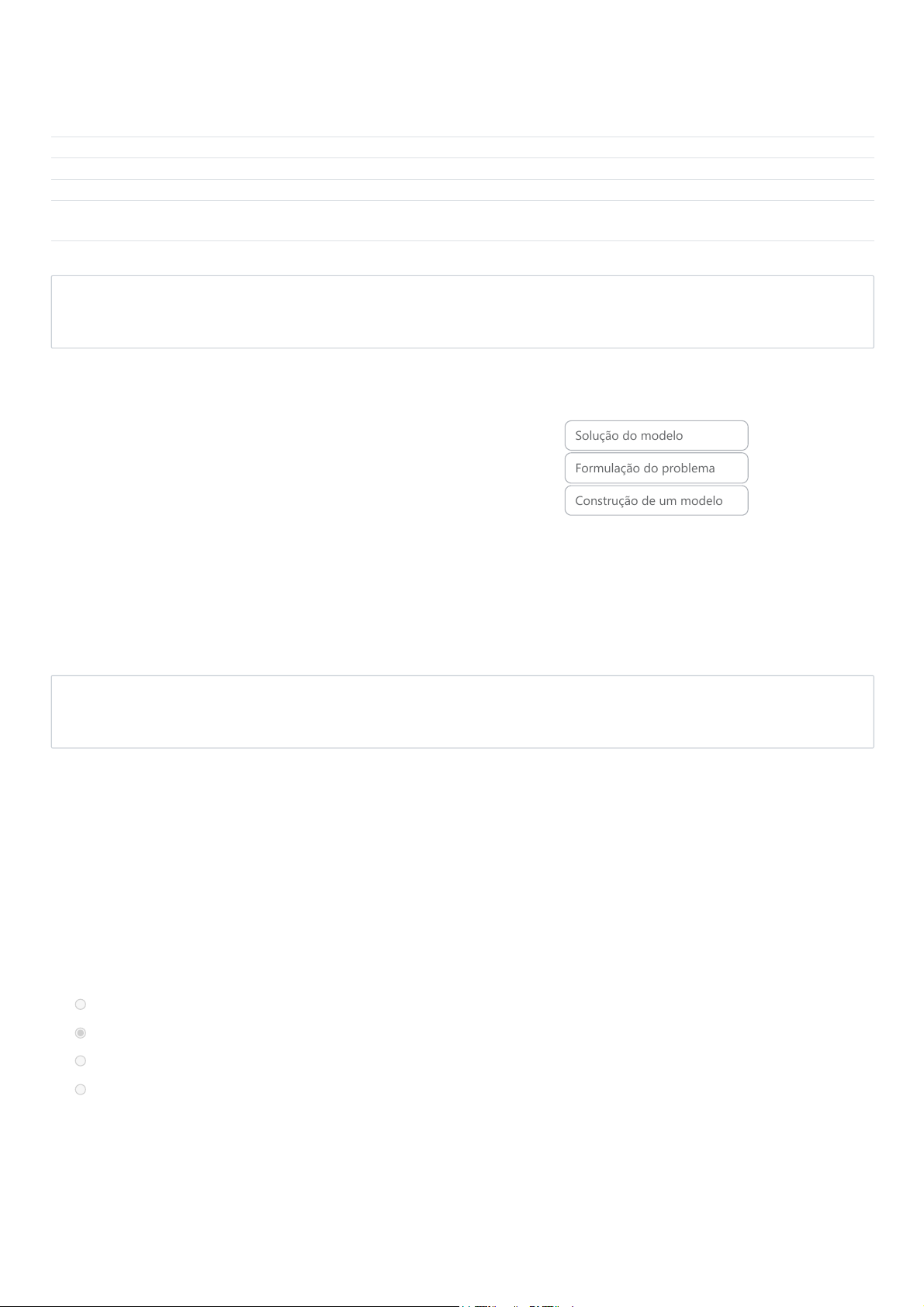 Iniciado em sexta-feira, 7 nov. 2025, 08:12 Estado Finalizada Concluída em sexta-feira, 7 nov. 2025, 08:14 Tempo empregado 1 minuto 55 segundos Avaliar 9,00 de um máximo de 10,00(90%) Questão 1 Correto Atingiu 1,00 de 1,00 Questão 2 Correto Atingiu 1,00 de 1,00 Relacione as fases da pesquisa operacional com o seu significado Utilização de técnicas matemáticas para solução do modelo. ✓ Analisar o problema de maneira a obter todas as variáveis possíveis e as limitações existentes. ✓ Consiste em criar equações para que serão utilizadas na solução. ✓ Solução do modelo Formulação do problema Construção de um modelo Sua resposta está correta. A resposta correta é: Utilização de técnicas matemáticas para solução do modelo. → Solução do modelo, Analisar o problema de maneira a obter todas as variáveis possíveis e as limitações existentes. → Formulação do problema, Consiste em criar equações para que serão utilizadas na solução. → Construção de um modelo. Analise as afirmativas I, II e III abaixo e assinale a resposta (a, b, c ou d) que está correta. Baseado no fato de a tomada de decisão ser um processo no qual apenas uma ou algumas alternativas serem utilizadas para realizar as ações que são desejadas, esta, deve sempre indicar as melhores opções para o problema apresentado, devendo considerar aspectos como: I. O ambiente em que os problemas são apresentados. II. Os riscos que as decisões podem assumir. III. As necessidades de manter os parâmetros de qualidade desejados pela empresa. Escolha uma opção: Todas as afirmativas estão erradas. Todas as afirmativas estão corretas. ✓ Existe somente uma afirmativa correta. Existem somente duas afirmativas corretas. Sua resposta está correta. A resposta correta é: Todas as afirmativas estão corretas. 24/11/2025, 13:37 Teste 1: Revisão da tentativa | avaead-unisanta https://avaead.unisanta.br/mod/quiz/review.php?attempt=1940096&cmid=620717 1/5 Questão 3 Correto Atingiu 1,00 de 1,00 Questão 4 Correto Atingiu 1,00 de 1,00 Questão 5 Correto Atingiu 1,00 de 1,00 Assinale qual das alternativas abaixo pode ser considerada uma definição de Pesquisa Operacional. Escolha uma opção: Consiste na utilização de métodos científicos para apoio à tomadas de decisões. ✓ É uma ciência que procura a melhor solução para evitar operações indeterminadas. Consiste na utilização de operações matemáticas para encontrar diferenças entre operações. Elabora métodos para pesquisar problemas desconhecidos. Sua resposta está correta. A resposta correta é: Consiste na utilização de métodos científicos para apoio à tomadas de decisões. Relacione a determinação de Pesquisa Operacional com o país: Operations Research ✓ Operational Research ✓ Investigação Operacional ✓ Estados Unidos Inglaterra Portugal Sua resposta está correta. A resposta correta é: Operations Research → Estados Unidos, Operational Research → Inglaterra, Investigação Operacional → Portugal. O uso de Pesquisa Operacional, como uma abordagem delineada não pode ser estabelecida com precisão, mas... Escolha uma opção: está certamente vinculado a atividades da indústria têxtil após a revolução industrial. está certamente vinculado a atividades militares nos primórdios da Segunda Guerra Mundial. ✓ está certamente vinculado a indústria automobilística após o Taylorismo. está certamente vinculado a atividades militares nos primórdios da Primeira Guerra Mundial. Sua resposta está correta. A resposta correta é: está certamente vinculado a atividades militares nos primórdios da Segunda Guerra Mundial. 24/11/2025, 13:37 Teste 1: Revisão da tentativa | avaead-unisanta https://avaead.unisanta.br/mod/quiz/review.php?attempt=1940096&cmid=620717 2/5 Questão 6 Correto Atingiu 1,00 de 1,00 Questão 7 Correto Atingiu 1,00 de 1,00 Relacione as fases da pesquisa operacional com o seu significado Tentativa de simular a aplicação do modelo com dados históricos ou mesmo com previsões ✓ Fazer verificações criando itens de controle que poderão identificar elementos que apresentem valores diferentes dos desejados e possam vir a retirar a solução dos objetivos que foram propostos. ✓ Fase final, quando a solução é implementada no modelo ✓ Teste da solução Criação de itens de controle da solução Implementação do modelo Sua resposta está correta. A resposta correta é: Tentativa de simular a aplicação do modelo com dados históricos ou mesmo com previsões → Teste da solução, Fazer verificações criando itens de controle que poderão identificar elementos que apresentem valores diferentes dos desejados e possam vir a retirar a solução dos objetivos que foram propostos. → Criação de itens de controle da solução, Fase final, quando a solução é implementada no modelo → Implementação do modelo. Uma malharia está produzindo dois tipos de camisas, uma com gola olímpica e outra com gola em V, com lucros de R$ 50,00 e R$ 70,00 cada camisa respectivamente. O tempo para fabricar a camisa com gola olímpica é de 15 minutos e para fabricar a camisa com gola em V é de 30 minutos. O tempo total que ela dispõe para estas impressões é de 10 horas e ela pretende produzir no máximo 40 camisas com gola olímpica e no máximo 50 camisas com gola em V. Ela pretende dividir a produção para obter o maior lucro possível. Qual a equação que representa o “Equacionamento do objetivo” Escolha uma opção: Z = 15x + 30y Z ≥ 15x + 30y Z ≥ 50x + 70y Z = 50x + 70y ✓ Máx Máx Máx Máx Sua resposta está correta. A resposta correta é: Z = 50x + 70yMáx 24/11/2025, 13:37 Teste 1: Revisão da tentativa | avaead-unisanta https://avaead.unisanta.br/mod/quiz/review.php?attempt=1940096&cmid=620717 3/5 Questão 8 Correto Atingiu 1,00 de 1,00 Questão 9 Correto Atingiu 1,00 de 1,00 Analise o diagrama abaixo e indique os textos que devem ser colocados nos bloc
