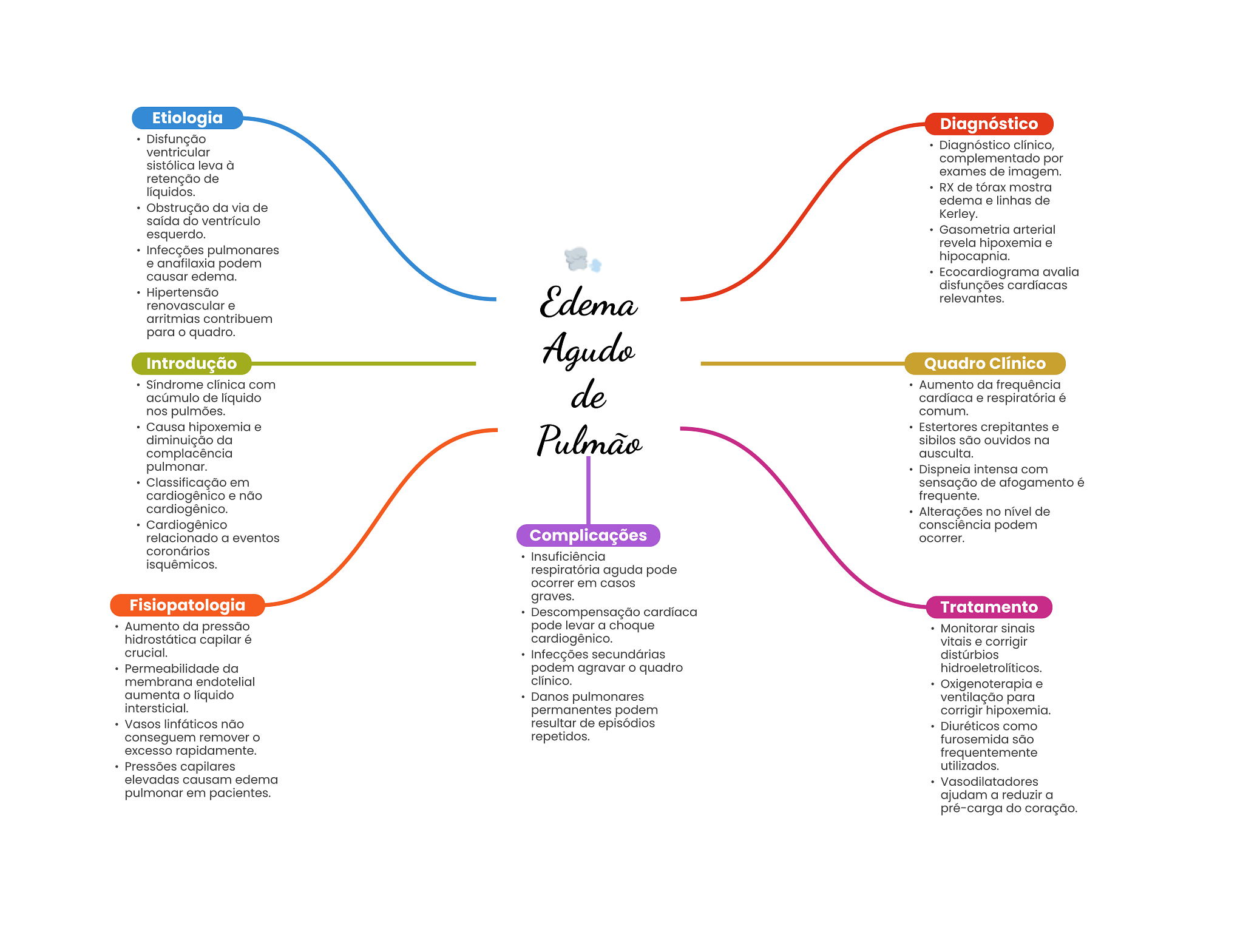 Etiologia Diagnóstico Disfunção ventricular Diagnóstico clínico, sistólica leva à complementado por retenção de exames de imagem. líquidos. RX de tórax mostra edema e linhas de Obstrução da via de saída do ventrículo Kerley. esquerdo. Gasometria arterial revela hipoxemia e Infecções pulmonares hipocapnia. e anafilaxia podem causar edema. Ecocardiograma avalia disfunções cardíacas Hipertensão Edema relevantes. renovascular e arritmias contribuem para quadro. Introdução Agudo Quadro Clínico Síndrome clínica com de Aumento da frequência acúmulo de líquido cardíaca e respiratória é nos pulmões. comum. Causa hipoxemia e Pulmão Estertores crepitantes e diminuição da sibilos são ouvidos na complacência ausculta. pulmonar. Dispneia intensa com Classificação em sensação de afogamento é cardiogênico e não frequente. cardiogênico. Alterações no nível de Cardiogênico consciência podem relacionado a eventos Complicações ocorrer. coronários Insuficiência isquêmicos. respiratória aguda pode ocorrer em casos graves. Fisiopatologia Descompensação cardíaca Tratamento Aumento da pressão pode levar a choque Monitorar sinais hidrostática capilar é cardiogênico. vitais e corrigir crucial. Infecções secundárias distúrbios Permeabilidade da podem agravar quadro hidroeletrolíticos. membrana endotelial clínico. Oxigenoterapia e aumenta líquido Danos pulmonares ventilação para intersticial. permanentes podem corrigir hipoxemia. Vasos linfáticos não resultar de episódios Diuréticos como conseguem remover repetidos. furosemida são excesso rapidamente. frequentemente Pressões capilares utilizados. elevadas causam edema Vasodilatadores pulmonar em pacientes. a reduzir a pré-carga do coração.