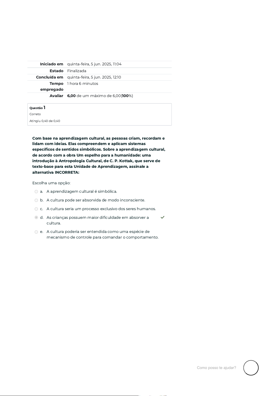 Iniciado em quinta-feira, 5 jun. 2025, 11:04 Estado Finalizada Concluída em quinta-feira, 5 jun. 2025, 12:10 Tempo empregado 1 hora 6 minutos Avaliar 6,00 de um máximo de 6,00(100%) Questão 1 Correto Atingiu 0,40 de 0,40 Com base na aprendizagem cultural, as pessoas criam, recordam e lidam com ideias. Elas compreendem e aplicam sistemas específicos de sentidos simbólicos. Sobre a aprendizagem cultural, de acordo com a obra Um espelho para a humanidade: uma introdução à Antropologia Cultural, de C. P. Kottak, que serve de texto-base para esta Unidade de Aprendizagem, assinale a alternativa INCORRETA: Escolha uma opção: a. A aprendizagem cultural é simbólica. b. A cultura pode ser absorvida de modo inconsciente. c. A cultura seria um processo exclusivo dos seres humanos. d. As crianças possuem maior dificuldade em absorver a cultura. ✓ e. A cultura poderia ser entendida como uma espécie de mecanismo de controle para comandar o comportamento. Como posso te ajudar? Questão 2 Correto Atingiu 0,40 de 0,40 Questão 3 Correto Atingiu 0,40 de 0,40 A cultura não pode mais ser concebida como uma acumulação de saberes ou um processo estético, intelectual ou espiritual. Ela precisa ser estudada e compreendida, considerando-se a enorme expansão de tudo o que está associado a ela e o papel constitutivo que assumiu em todos os aspectos da vida social. Sobre os estudos culturais, marque a alternativa INCORRETA. Escolha uma opção: a. Um dos objetivos dos estudos culturais é mostrar as relações entre poder e práticas culturais; expor como o poder atua para modelar estas práticas. b. Os estudos culturais cuidam da cultura regional e não universal. ✓ c. Os estudos culturais tentam captar e compreender toda a sua complexidade no interior dos contextos sociais e políticos. d. Uma das faces mais importantes dos estudos culturais diz respeito aos ataques advindos do movimento feminista e das lutas contra o racismo. e. A cultura sempre tem uma dupla ação em face dos estudos da cultura. Ela é o objeto de estudo e o local da crítica política. A cultura é transmitida na sociedade. Ela não é um atributo de indivíduos em si, e sim dos indivíduos como membros de grupos. Sobre isso, de acordo com a obra Um espelho para a humanidade: uma introdução à Antropologia Cultural, de C. P. Kottak, que serve de texto-base para esta Unidade de Aprendizagem, marque a resposta INCORRETA: Escolha uma opção: a. Aquilo que não é da ordem da ciência não é relevante para a cultura. ✓ b. Cultura é um jeito de expressar e ordenar as nossas necessidades naturais, tais como a forma de comer. c. A cultura, de alguma maneira, é integrada ao mesmo tempo, ou seja, quando algo muda, geralmente o sistema muda com ele. d. A natureza humana é acrescida pela cultura, condicionando as próprias relações entre as pessoas. e. A cultura é o principal mecanismo de adaptação do ser humano. Como posso te ajudar? Questão 4 Correto Atingiu 0,40 de 0,40 Questão 5 Correto Atingiu 0,40 de 0,40 Questão 6 Correto Atingiu 0,40 de 0,40 A chamada Escola de Chicago, de Sociologia, prega, entre outras coisas, a: Escolha uma opção: a. objetividade científica. ✓ b. especulação das teses científicas. c. Utilidade dos resultados. d. Transcendência do contexto. e. falsificação da hipótese. Qual é a relação entre teoria e prática na Escola de Frankfurt? Escolha uma opção: a. Na prática a teoria é diferente. b. Depois de formulada a teoria, a prática atesta sua veracidade. c. A prática da teoria se dá somente na pesquisa. d. Teoria serve para pesquisar a prática com distanciamento. e. A teoria deve estar ancorada à prática. ✓ Sobre as mudanças sociais, Marx tinha um ponto de vista que chamou de concepção materialista da história. Assinale a alternativa que descreve essa visão: Escolha uma opção: a. Não são os valores ou as ideias que os homens detêm que promovem as principais mudanças sociais, essas mudanças são induzidas por influências econômicas. ✓ b. Conforme essa visão, o capitalismo era a última fase de evolução da sociedade. c. Conforme essa visão, o capitalismo era muito parecido com os modos de produção que o antecederam. d. O estudo dos fatos sociais é que levariam a uma maior compreensão da sociedade. e. Conforme essa visão, o capitalismo era uma fase passageira e a sociedade logo voltaria ao modo de produção feudal. Como posso te ajudar? Questão 7 Correto Atingiu 0,40 de 0,40 Questão 8 Correto Atingiu 0,40 de 0,40 Trabalhando cada vez mais em sociedades de grande escala, os antropólogos desenvolveram formas inovadoras de misturar etnografia e survey. Sobre o trabalho do antropólogo, assinale a alternativa correta: Escolha uma opção: a. O método do survey aparece para suprir a necessidade de uma pesquisa mais aprofundada no dia a dia da cultura. b. Como as sociedades, em alguns casos, como nas situações de fronteira, por exemplo, estão sempre em movimento, a Antropologia não pode cuidar de pesquisá-las. c. O survey é um método que torna mais pessoal a pesquisa. d. Nos dias atuais a observação direta não é mais utilizada como método de pesquisa. e. O survey é um método que trabalha com amostragens. ✓ Durante o trabalho de campo, o etnógrafo reúne dados que organiza, descreve, analisa e interpreta para construir e apresentar essa descrição, que pode ser produzida na forma de livro, artigo ou filme. Assinale a alternativa que NÃO configura uma técnica etnográfica. Escolha uma opção: a. Pesquisa multissituada. b. Descoberta de crenças e percepções locais. c. Observação direta, inclusive a observação participante. d. Pesquisa em equipe. e. Pesquisa apenas individual. ✓ Como posso te ajudar? Questão 9 Correto Atingiu 0,40 de 0,40 Questão 10 Correto Atingiu 0,40 de 0,40 A crise da democracia italiana e de dissolução da representação, nesses últimos anos, foi a causa da crescente integração dos partido