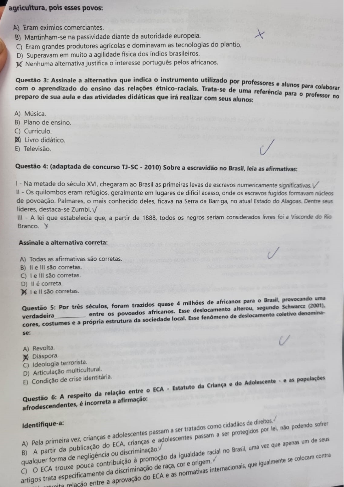 agricultura, pois esses povos: A) Eram exímios comerciantes. B) Mantinham-se na passividade diante da autoridade europeia. C) Eram grandes produtores agrícolas e dominavam as tecnologias do plantio. D) Superavam em muito a agilidade física dos índios brasileiros. Nenhuma alternativa justifica o interesse português pelos africanos. Questão 3: Assinale a alternativa que indica o instrumento utilizado por professores e alunos para colaborar preparo de sua aula e das atividades didáticas que irá realizar com seus alunos: com aprendizado do ensino das relações étnico-raciais. Trata-se de uma referência para professor no A) Música. B) Plano de ensino. C) Currículo. X Livro didático. E) Televisão. Questão 4: (adaptada de concurso TJ-SC 2010) Sobre a escravidão no Brasil, leia as afirmativas: - Na metade do século XVI, chegaram ao Brasil as primeiras levas de escravos numericamente significativas. Os quilombos eram refúgios, geralmente em lugares de difícil acesso, onde os escravos fugidos formavam núcleos de povoação. Palmares, mais conhecido deles, ficava na Serra da Barriga, no atual Estado do Alagoas. Dentre seus líderes, destaca-se Zumbi. III A lei que estabelecia que, a partir de 1888, todos os negros seriam considerados livres foi a Visconde do Rio Branco. Assinale a alternativa correta: A) Todas as afirmativas são corretas. B) II e III são corretas. C) I e III são corretas. D) é correta. e são corretas. Questão 5: Por três séculos, foram trazidos quase 4 milhões de africanos para Brasil, Schwarcz provocando (2001), uma povoados africanos. Esse deslocamento alterou, segundo denomina- verdadeira cores, costumes e a própria entre estrutura os da sociedade local. Esse fenômeno de deslocamento coletivo se: A) Revolta. Diáspora. C) Ideologia terrorista. D) Articulação multicultural. E) Condição 6: A de respeito crise identitária. da relação entre o ECA Estatuto da Criança e do Adolescente e as populações afrodescendentes, Questão é incorreta a afirmação: Identifique-a: Pela primeira vez, crianças e adolescentes crianças passam e adolescentes a ser tratados passam como a ser cidadãos protegidos de direitos. por lei, não podendo um de sofrer seus artigos C) qualquer A) B) A partir ECA trata forma trouxe especificamente da de publicação pouca negligência contribuição do da a ou aprovação ECA, discriminação à promoção do ECA de raça, e da as cor normativas igualdade e origem. racial internacionais, no Brasil, que uma igualmente vez que apenas se colocam contra relação entre
