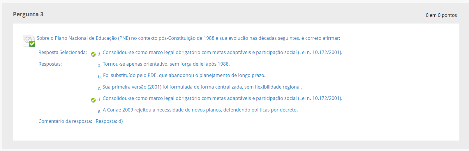 Pergunta 3 Sobre O Plano Nacional de Educação (PNE) no contexto pós-Constituição de 1988 e sua evolução nas décadas seguintes, é correto afirmar: Resposta Selecionada: d. Consolidou-se como marco legal obrigatório com metas adaptáveis e participação social (Lei n. 10.172/2001). Respostas: a. Tornou-se apenas orientativo, sem força de lei após 1988. b. Foi substituído pelo PDE, que abandonou 0 planejamento de longo prazo. C. Sua primeira versão (2001) foi formulada de forma centralizada, sem flexibilidade regional. d. Consolidou-se como marco legal obrigatório com metas adaptáveis e participação social (Lei n. 10.172/2001). e. A Conae 2009 rejeitou a necessidade de novos planos, defendendo políticas por decreto. Comentário da resposta: Resposta: d)