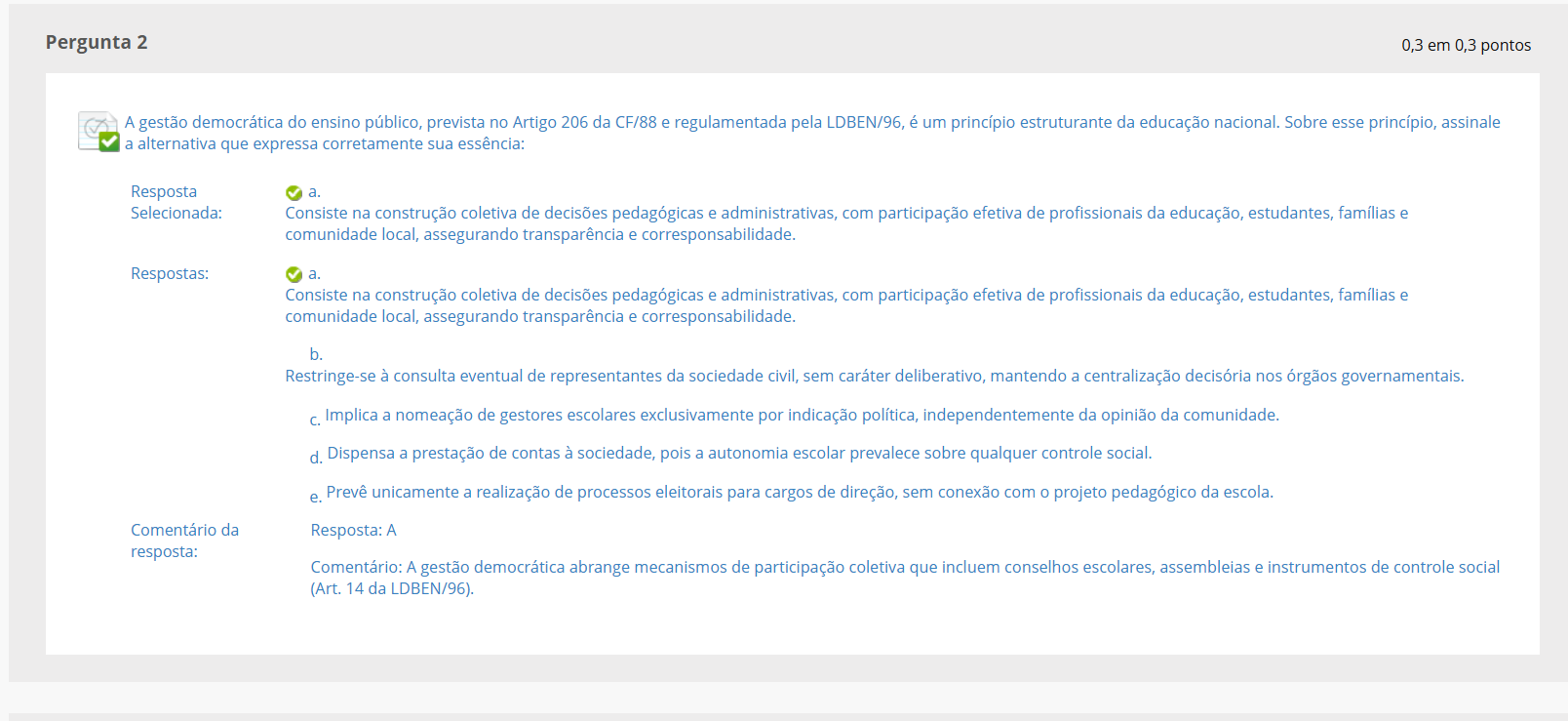 Pergunta 2 0,3 em 0,3 pontos A gestão democrática do ensino público, prevista no Artigo 206 da CF/88 e regulamentada pela LDBEN/96, é um princípio estruturante da educação nacional. Sobre esse princípio, assinale a alternativa que expressa corretamente sua essência: Resposta a. Selecionada: Consiste na construção coletiva de decisões pedagógicas e administrativas, com participação efetiva de profissionais da educação, estudantes, famílias e comunidade local, assegurando transparência e corresponsabilidade. Respostas: a. Consiste na construção coletiva de decisões pedagógicas e administrativas, com participação efetiva de profissionais da educação, estudantes, famílias e comunidade local, assegurando transparência e corresponsabilidade. b. Restringe-se à consulta eventual de representantes da sociedade civil, sem caráter deliberativo, mantendo a centralização decisória nos órgãos governamentais. C. Implica a nomeação de gestores escolares exclusivamente por indicação política, independentemente da opinião da comunidade. d. Dispensa a prestação de contas à sociedade, pois a autonomia escolar prevalece sobre qualquer controle social. e. Prevê unicamente a realização de processos eleitorais para cargos de direção, sem conexão com projeto pedagógico da escola. Comentário da Resposta: A resposta: Comentário: A gestão democrática abrange mecanismos de participação coletiva que incluem conselhos escolares, assembleias e instrumentos de controle social (Art. 14 da LDBEN/96).