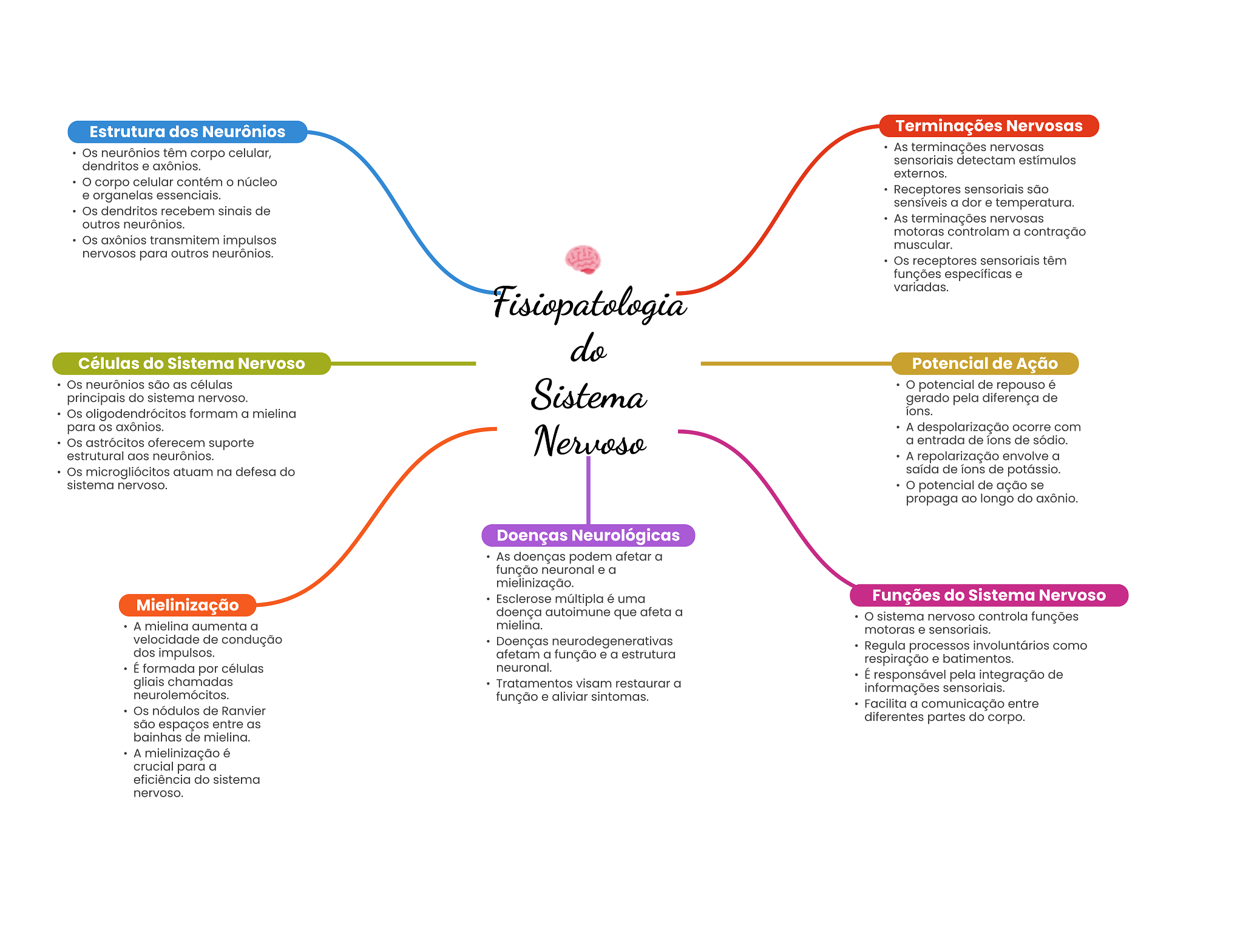 Estrutura dos Neurônios Terminações Nervosas Os neurônios têm corpo celular, As terminações nervosas sensoriais detectam estímulos dendritos e axônios. externos. corpo celular contém núcleo e organelas essenciais. Receptores sensoriais são sensíveis a dor e temperatura. Os dendritos recebem sinais de outros neurônios. As terminações nervosas motoras controlam a contração Os axônios transmitem impulsos muscular. nervosos para outros neurônios. Os receptores sensoriais têm funções específicas e variadas. Fisiopatologia do Células do Sistema Nervoso Potencial de Ação Os neurônios são as células principais do sistema nervoso. Sistema potencial de repouso é gerado pela diferença de Os oligodendrócitos formam a mielina ions. para axônios. Nervoso A despolarização ocorre com Os astrócitos oferecem suporte a entrada de de sódio. estrutural aos neurônios. A repolarização envolve a Os microgliócitos atuam na defesa do saída de de potássio. sistema nervoso. potencial de ação se propaga ao longo do axônio. Doenças Neurológicas As doenças podem afetar a função neuronal e a mielinização. Mielinização Esclerose múltipla é uma Funções do Sistema Nervoso doença autoimune que afeta a sistema nervoso controla funções A mielina aumenta a mielina. motoras e sensoriais. velocidade de condução Doenças neurodegenerativas Regula processos involuntários como dos impulsos. afetam a função e a estrutura respiração e batimentos. É formada por células neuronal. É responsável pela integração de gliais chamadas Tratamentos visam restaurar a neurolemócitos. informações sensoriais. função e aliviar sintomas. Os nódulos de Ranvier Facilita a comunicação entre diferentes partes do corpo. são espaços entre as bainhas de mielina. A mielinização é crucial para a eficiência do sistema nervoso.