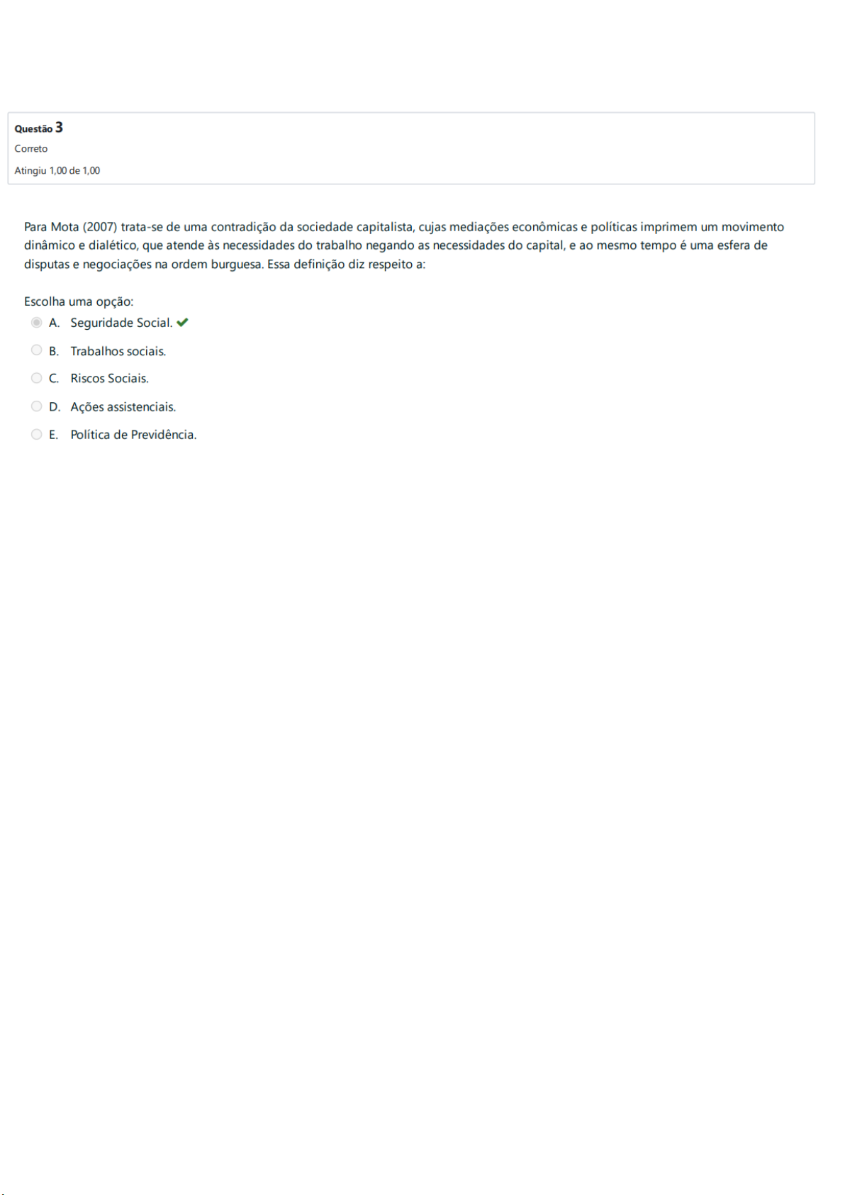 Questão 3 Correto Atingiu 1,00 de 1,00 Para Mota (2007) trata-se de uma contradição da sociedade capitalista, cujas mediações econômicas e políticas imprimem um movimento dinâmico e dialético, que atende às necessidades do trabalho negando as necessidades do capital, e ao mesmo tempo é uma esfera de disputas e negociações na ordem burguesa. Essa definição diz respeito a: Escolha uma opção: A. Seguridade Social. B. Trabalhos sociais. C. Riscos Sociais. D. Ações assistenciais. E. Política de Previdência.
