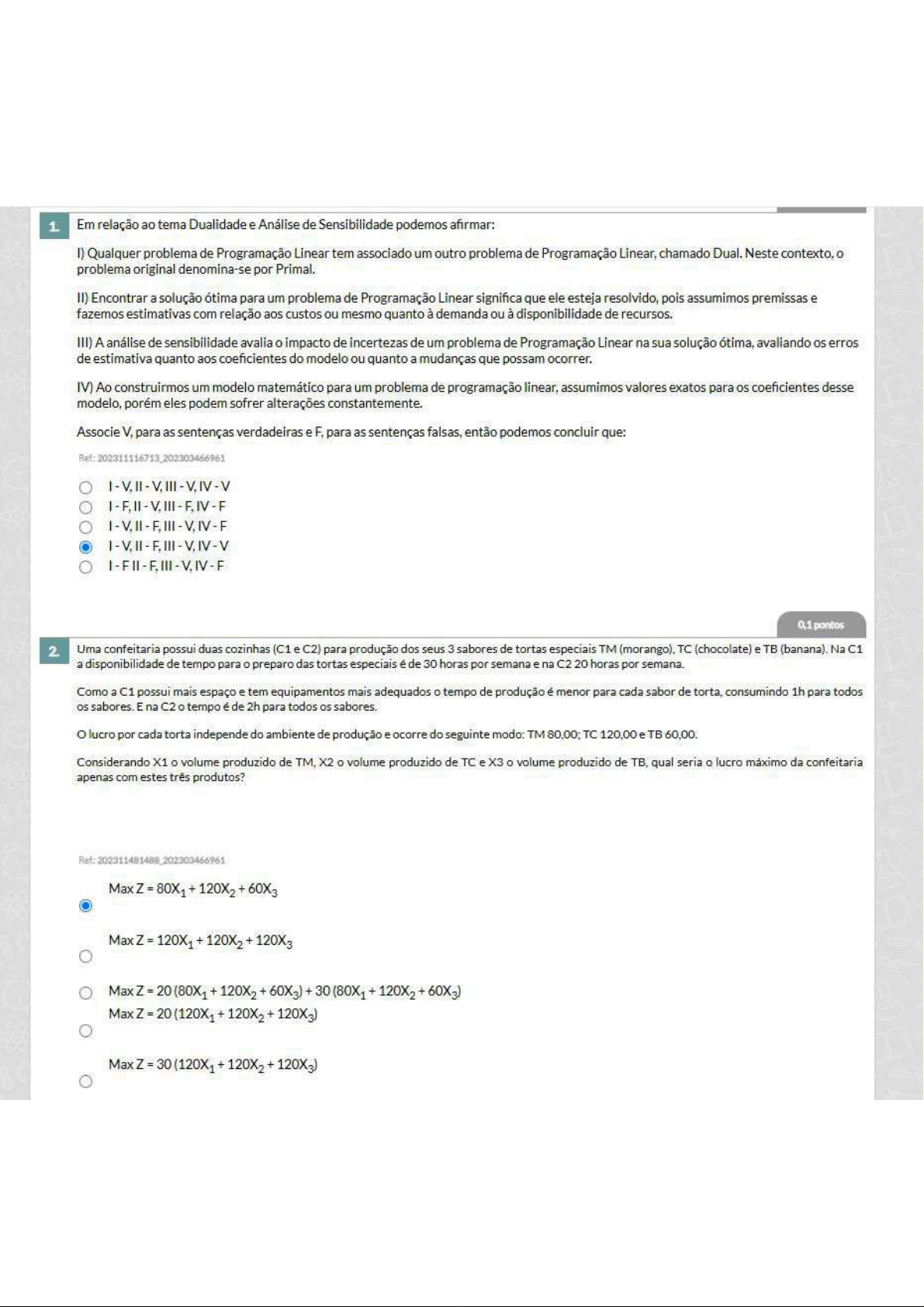 1. Em relação ao tema Dualidade e Análise de Sensibilidade podemos afirmar: I) Qualquer problema de Programação Linear tem associado um outro problema de Programação Linear, chamado Dual. Neste contexto, problema original denomina-se por Primal. II) Encontrar a solução ótima para um problema de Programação Linear significa que ele esteja resolvido, pois assumimos premissas e fazemos estimativas com relação aos custos ou mesmo quanto à demanda ou à disponibilidade de recursos. III) A análise de sensibilidade avalia impacto de incertezas de um problema de Programação Linear na sua solução ótima, avaliando os erros de estimativa quanto aos coeficientes do modelo ou quanto a mudanças que possam ocorrer. IV) Ao construirmos um modelo matemático para um problema de programação linear, assumimos valores exatos para os coeficientes desse modelo, porém eles podem sofrer alterações constantemente. Associe V, para as sentenças verdadeiras e F, para as sentenças falsas, então podemos concluir que: II III IV - V III - V, II F, III IV II F, III V, IV V F, III IV 0,1 pontos 2. Uma confeitaria possui duas cozinhas (C1 e C2) para produção dos seus 3 sabores de tortas especiais TM TC (chocolate) e TB (banana). Na C1 a disponibilidade de tempo para preparo das tortas especiais é de 30 horas por semana e na C2 20 horas por semana. Como a C1 possui mais espaço e tem equipamentos mais adequados tempo de produção é menor para cada sabor de torta, consumindo 1h para todos os sabores. E na C2 o tempo é de 2h para todos os sabores. lucro por cada torta independe do ambiente de produção e ocorre do seguinte modo: TM 80,00; TC e TB 60,00. Considerando X1 o volume produzido de TM, X2 o volume produzido de TC e X3 o volume produzido de qual seria lucro máximo da confeitaria apenas com estes três produtos? Ref: Max Max Max Z 60X3) + 60X3) Max0,1 3. (Adaptado de LUNA, 2005) Um fazendeiro está definindo a sua estratégia de plantio para as culturas de trigo, arroz e milho na próxima safra. A produtividade de sua terra para as culturas desejadas é: 0,3 para 0 0,4 kg/m2 para 0 e 0,5 kg/m2 para milho. lucro de produção é de 11 centavos por kg de trigo, 5 centavos por kg de arroz e 2 centavos por kg de milho. 0 fazendeiro dispõe de de área cultivável, sendo que, para atender às demandas de sua própria fazenda, deve ser plantado, no mínimo, de trigo, de arroz e de milho. Ainda, devido à restrição de capacidade de armazenamento dos silos da fazenda, a produção está limitada a 100 toneladas. Adote a área a ser plantada como a variável de decisão para 0 modelo matemático deste problema, ou seja, xi= área em m² a ser plantada da cultura do tipo i = (T-Trigo, A-Arroz, M-Milho). Assim, a função objetivo é: Ref: Max f(x)= Max Max f(x)= Min f(x)= Min 0,1 pontos 4. Nos modelos de programação dinâmica, busca-se estabelecer uma estratégia para gerenciar as variáveis que podem variar ao longo do tempo, como disponibilidades de matéria-prima, mão de obra e lucros. Qual é a principal característica dos modelos de programação dinâmica? Ref: Considerar apenas as disponibilidades de matéria-prima ao longo do tempo. Variação constante dos lucros ao longo do tempo. Ignorar os níveis de estoque para focar apenas na demanda. Gerenciar as variáveis e garantir atendimento à demanda com menor custo. Não levar em conta a disponibilidade de mão de obra em cada período. 0,1 pontos 5. Para que serve a análise de sensibilidade? Ref: Não se pode fazer por conta da LGPD. Nenhuma das alternativas. É uma avaliação que procura estimar resultado gerado por mudanças nos parâmetros ou nas atividades de um procedimento, desse modo, não se consegue de forma alguma medir 0 grau de sensibilidade do processo perante uma alteração. É uma avaliação que procura estimar resultado gerado por mudanças nos parâmetros ou nas atividades de um procedimento, desse modo, medindo grau de sensibilidade do processo perante uma alteração. É uma analise numérica quantitativa sem natureza de correlação.6. No programa de produção, para próximo período, a empresa Maravilha Ltda., escolheu três produtos B1, B2 e B3. quadro abaixo mostra os montantes solicitados por unidade na produção. Produção Contribuição (lucro hora de hora de uso de demanda /unidade) trabalho máquina máx B1 3.500 6 12 1000 B2 2.100 4 6 500 B3 1.000 6 2 500 Os preços de venda foram fixados por decisão, política e as demandas foram estimadas tendo em vista esses preços. A firma pode obter um suprimento de 4.800 horas de trabalho durante período de processamento e pressupõe-se usar três máquinas que podem prover 7.200 horas de trabalho. Estabelecer um programa ótimo de produção, para período. A função objetiva desse problema é: Ref: 202309620147_202303466961 Max Z = 350x1 + 210x2 + 5000x3 Max Z = 3500x1 + 2100x2 + 1000x3 Max Z = 2100x1 + 1200x2 + Min Z = 2100x1 + 1200x2 + 600x3 MinZ = 3500x1 + 2100x2 + 1000x3 0,1 pontos 7. 0 trigo é em Kansas e no México e é consumido em Nova York e na Califórnia. Kansas produz 10 mil toneladas de trigo e México, 7. Por sua vez, Nova York consome 9 mil toneladas e a Califórnia, 8. custo de transporte por mil toneladas é $2,00 do México para Nova York, do México para Califórnia, do Kansas para Nova York e do Kansas para Califórnia. A Função objetivo que minimiza 0 custo de transporte é : 202311228427_202303466961 MimZ = + + + MimZ = + MimZ = + + + MimZ = + + MimZ = + + +8. Para que seja possível aplicar método Simplex, se faz necessário que os modelos de programação linear atendam as características específicas, a saber: I) A função objetivo só poderá se maximizada. II) As restrições de negatividade devem sempre ser maior ou igual a zero. III) Se a função objetivo for de minimização, antes da resolução faz-se necessário multiplicá-la por (-1). IV) Os termos independentes das restrições podem ser positivos ou neg